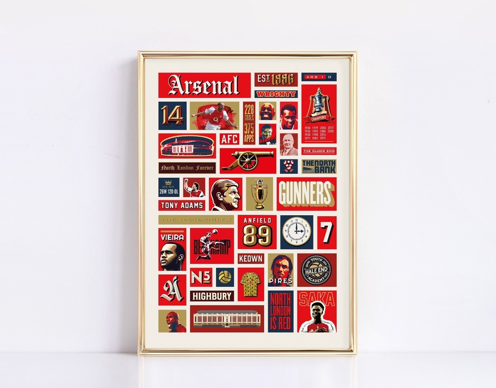 A graphical poster featuring famous characters, achievements and events in Arsenal's history. This poster print would make the perfect gift for any Arsenal supporter, whether it be your dad, your boyfriend or a best friend. It features legendary figures of the club such as Arsene Wenger, Herbert Chapman, Patrick Vieira, and record goal-scorer Thierry Henry. The print celebrates iconic moments in the past such as the The Invincibles and their old home Highbury Stadium, as well as popular Arsenal phrases such as 'The Clock End' and 'The North Bank'. This is a piece of Arsenal Wall Decor packed with important fan references. You will receive a high-quality Arsenal print on a lustre finish 260gsm fine art paper, which was carefully selected to elevate the vibrant colours featured in each design. Prints are made using professional Canon Pro printing equipment, which gives much smoother gradient transitions and a wider colour gamut. In other words, more depth and richness to the final print, which helps to create stunning vibrant artwork with amazing reproduction. A Giclée print is highly durable and will last a lifetime without any fading or bronzing. Framed Prints: Crafted from durable pine wood, the sturdy black frame is built to last and features shatterproof plexiglass to protect your print for years to come. The frames come pre-packed with corners and wrap and then packed in a box with strong edges to protect the frames. I-beams are used in addition, to give the package additional sturdiness. Postage & Packaging: A4 only prints will be delivered flat in rigid board backed envelopes. A3, A2 & A1 prints will be rolled into sturdy cardboard tubes.
