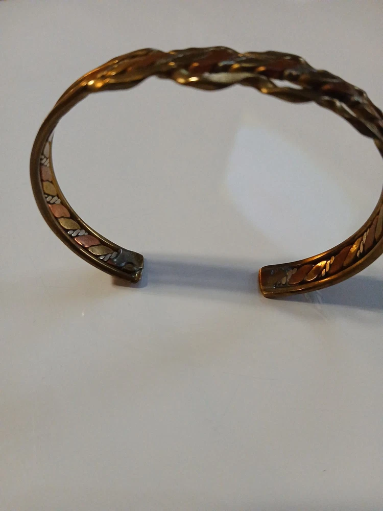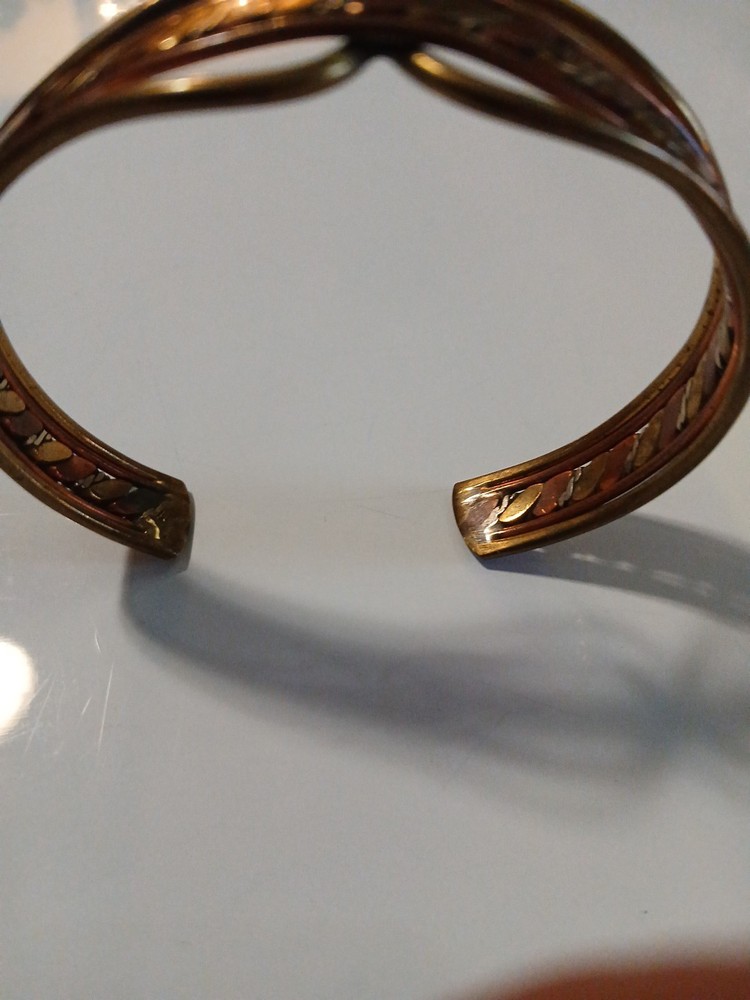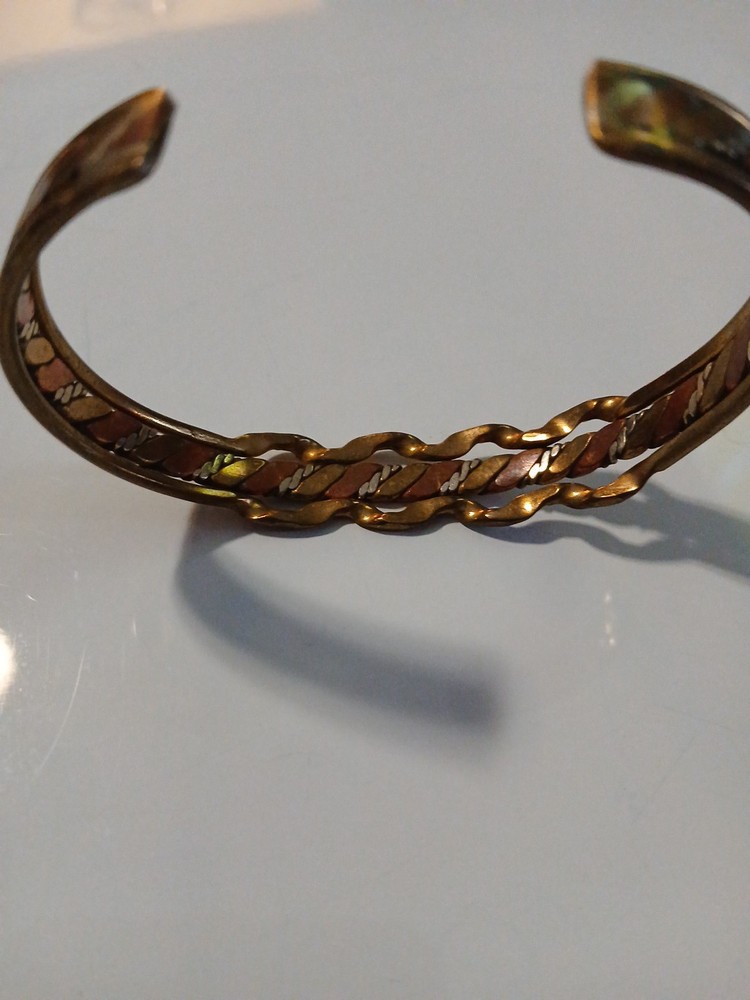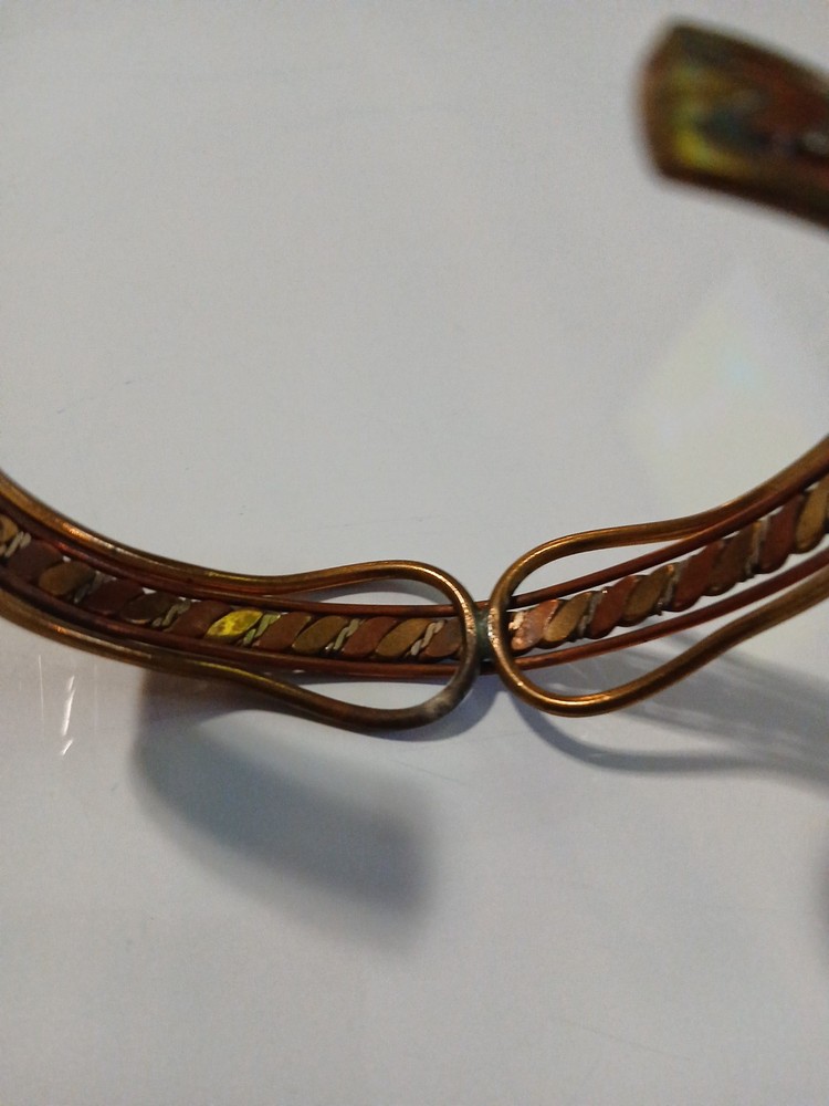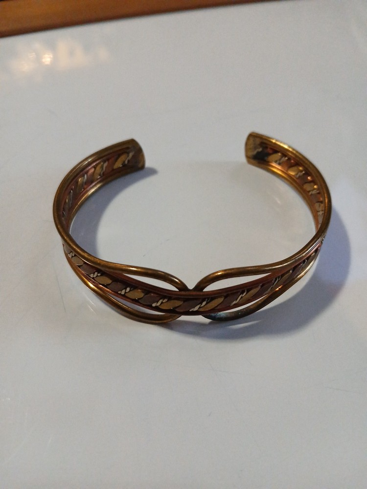 The bracelets are made of brass and copper, featuring a twisted design. It is an original, adjustable cuff style accessory with an art theme. It is unisex and suitable for adults. The bracelet is not antique, signed, or customized, and does not have any stones. It is a pre-owned item from an era that is not specified.