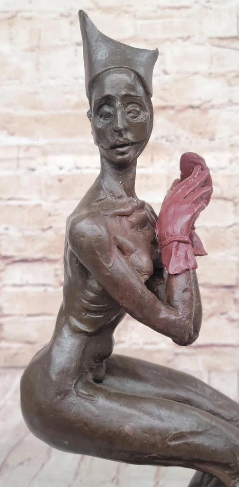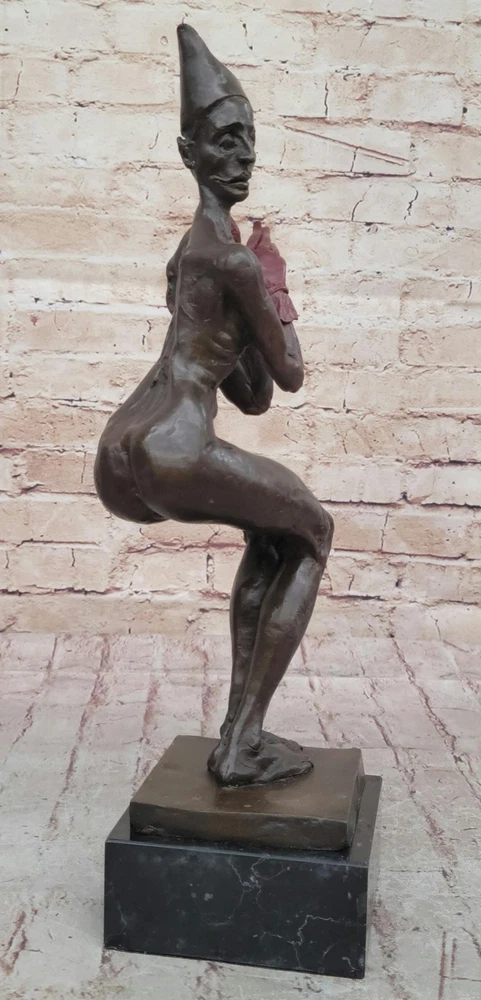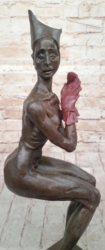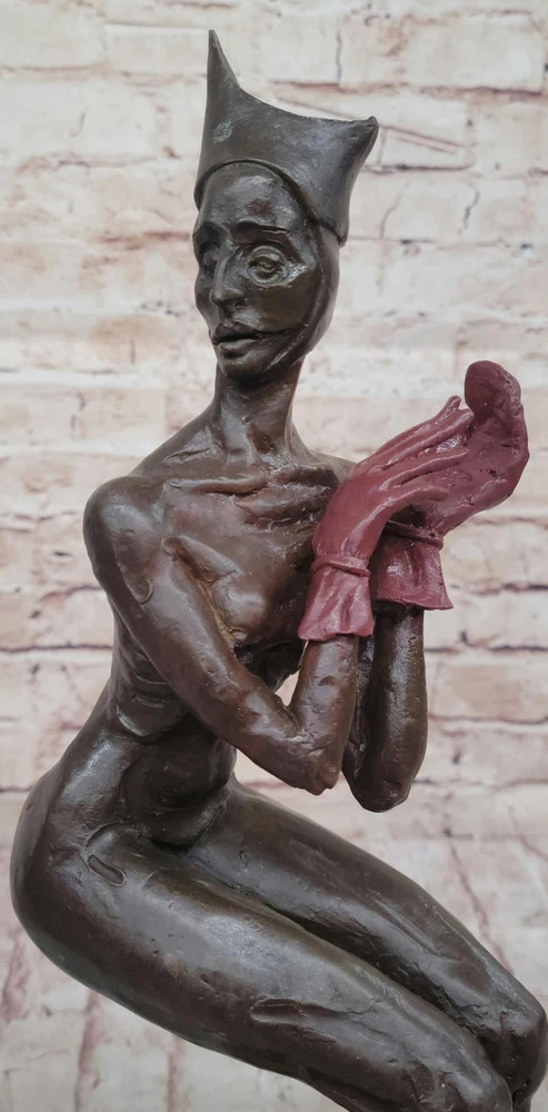 Condition : This sculpture is in perfect condition. Bronze Dimensions with Marble Base: Height 16.5" X Width 5" Marble Dimensions:5" X 5" Height without base:14.5" Weight:10 LBS Inventory:69XNCH631G6296 This elegant and spirited bronze sculpture masterfully captures the whimsical energy of a playful jester in motion. With a wide, endearing smile and fluid, theatrical posture, the jester seems almost mid-performancemdash;frozen in a moment of joyful exuberance. Every gesture, from the tilt of the head to the sway of the limbs, evokes the charm and charisma historically associated with these entertainers of court and carnival. The sculptor skillfully channels the essence of the jester’s lighthearted soul, transforming solid bronze into a lively, expressive character. What truly sets this piece apart is its stunning multi-color patina. Rich shades of brown provide depth and classical warmth, while tasteful accents of blue and red bring vibrance and personality to the jester’s costume. This dynamic coloring adds a painterly quality to the sculpture, enhancing its overall visual appeal and giving it a sense of individuality. The combination of color and form results in a captivating work that can brighten any room, whether displayed in a home, gallery, or office. Handcrafted with exceptional skill using the traditional lost wax method, this sculpture is not only a feat of technical precision but also a fine example of artistic storytelling. It is signed by the artist, reinforcing its authenticity and collectible value. Offered as a limited edition, this piece is a prized acquisition for collectors and lovers of expressive bronze art. It stands as both a joyful celebration of performance and a testament to enduring craftsmanship. Vintage 100% Bronze 16.5" Court Jester Harlequin Sculpture Statue Original Artwork Video will open in a new window Using the eBay App? Paste link into a browser window: [isdntekvideo]