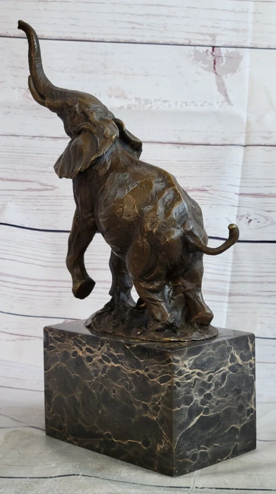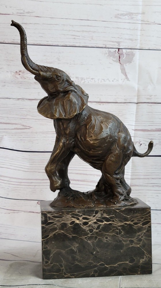 Art Deco Wildlife Elephant by Milo Bronze Hot Cast Sculpture Statue Artwork Deco Art Deco Wildlife Elephant by Milo Bronze Hot Cast Sculpture Statue Artwork Deco Condition : This sculpture is in perfect condition Bronze Dimensions with Marble Base: Height 12" X Width 10" Marble Dimensions:5" X 3" Height without base:9" Weight10 LBS Inventory:53K2734335 Immerse yourself in the mesmerizing presence of the bronze elephant sculpture, a piece that captures the essence of this majestic creature's slow and graceful journey across an arid plain. With its trunk gently arched upwards and outwards, the elephant portrays a tranquil demeanor as it moves, reflecting the serene nature of its gaze. Throughout history, elephants have held sacred significance, representing strength and wisdom across different cultures. In Eastern cultures, they embody patience and energy, while in Hinduism, the deity Ganesha with an elephant's head symbolizes intellect and spirituality. Crafted using the timeless technique of lost-wax casting, this bronze sculpture exudes authenticity and detail in every curve and contour. The brown patina finish further enhances the sculpture's rich and enduring character, adding to its visual appeal. Mounted upon a variegated brown marble base, the elephant stands as a symbol of power and grace, ready to bring a touch of the wild and the sacred to any environment it graces. Artist Milo's signature ensures the sculpture's authenticity, making it a remarkable addition to any collection or a thoughtful gift that carries the profound symbolism of the elephant's presence. Bronze Sculpture Hand Made Statue Art Nouveau Signed Milo Abstract Elephant Video will open in a new window Using the eBay App? Paste link into a browser window: [isdntekvideo] Shipping Terms : Most of our items are shipped via USPS (United States Postal Service) mail or UPS. Most orders are shipped within 24-48 hours of purchase. Please be aware that not all items are available for USPS shipping due to size and weight. We do ship to Hawaii, Alaska, Canada, Puerto Rico, APO/AE, and U.S. Virgin Islands, however, an additional charge may be required. Please contact us before making any purchases in these areas. For Non-USA customers, you may be responsible for all duty, tax, brokerage fees that may be due upon delivery (shipping costs cover freight charges only). We also ship internationally. Please refer to the "Shipping and Handling" chart for the rates for each area. Payment : We accept just about any form of payment. PayPal, Master Card, Visa or American Express credit cards. Money orders, cashiers checks, and even personal or business checks. For governmental institutions, we will also accept a purchase order. Please understand that for personal or business checks we have to wait for the check to clear (usually 7 days) before shipping. Condition : New Detailed Hand Crafted Hot Cast Bronze Satisfaction Guaranteed. This is Stock Photo, Slight Color Variation!! Listing and template services provided by inkFrog