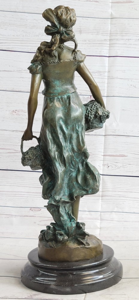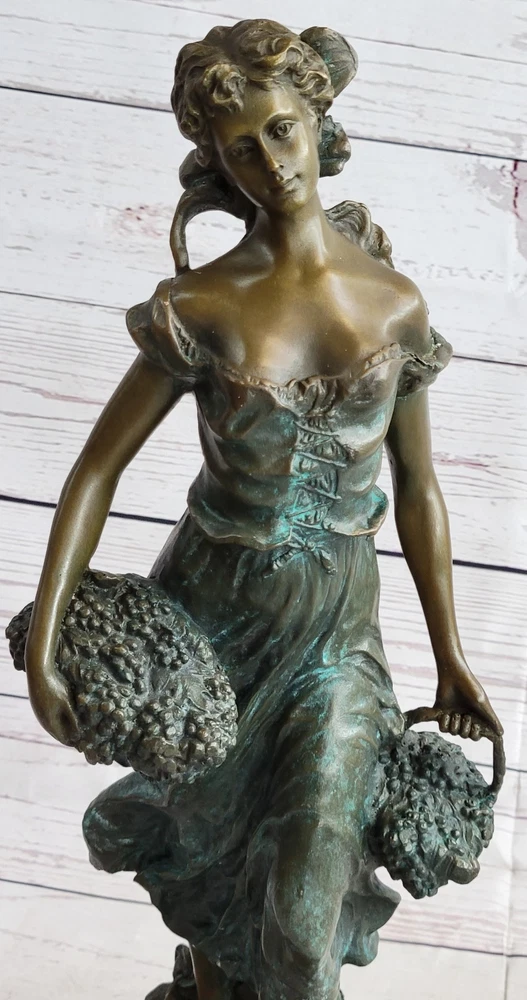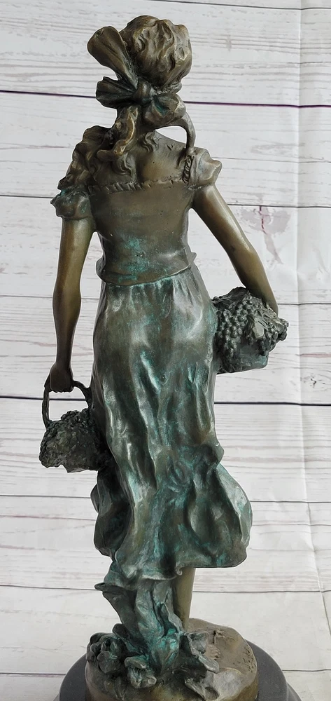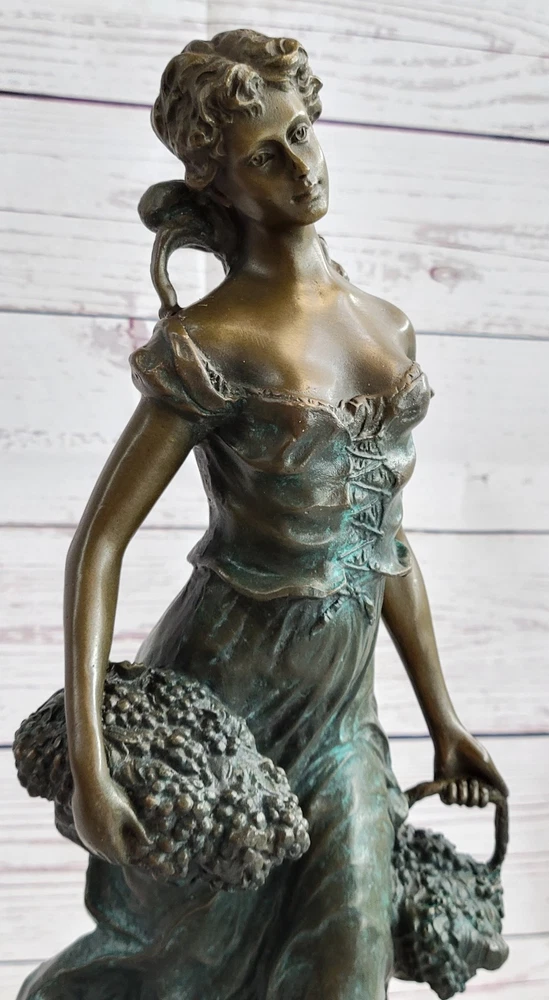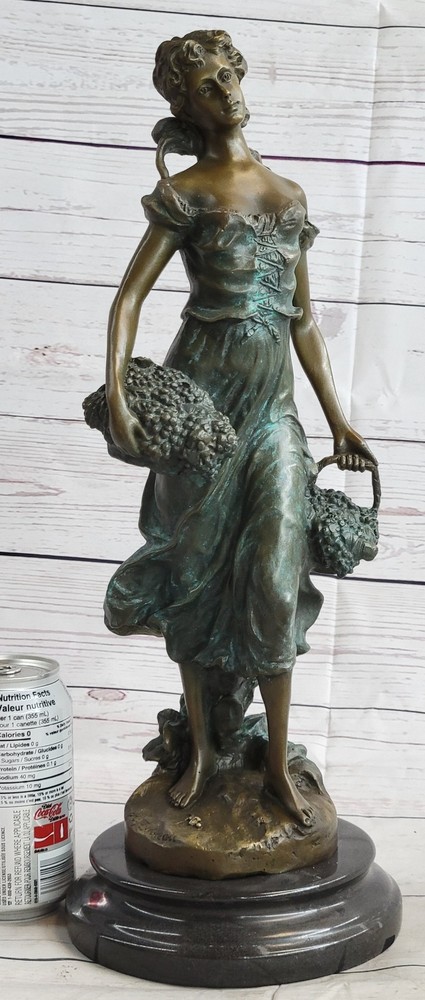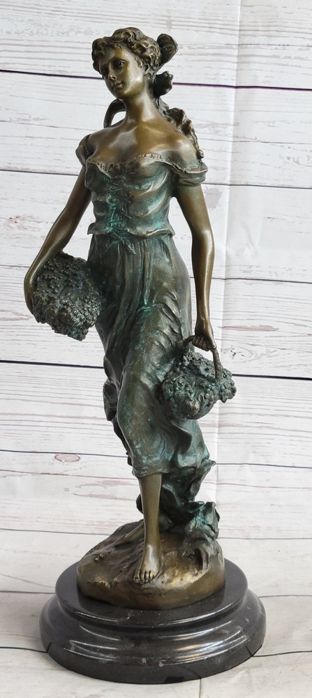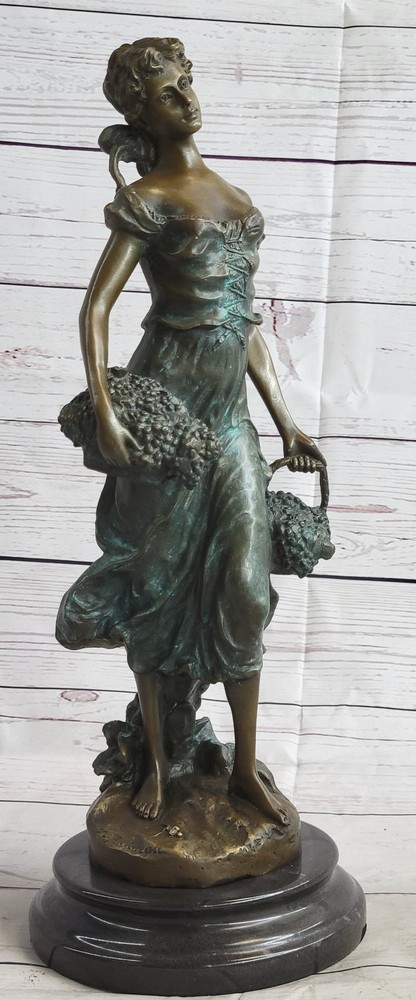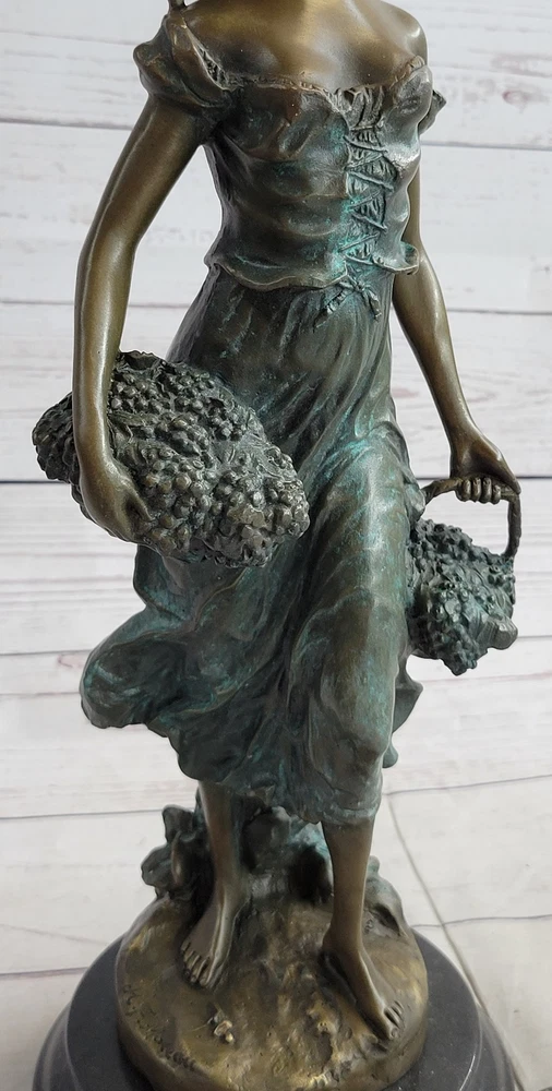 Condition : This sculpture is in perfect condition. Bronze Dimensions with Marble Base: Height 17" X Width 6" Marble size: Diameter 6" Height without base:15 1/2" Weight:17 LBS Inventory:35EP471C8553 Indulge in the timeless allure of this exquisite bronze statue by Moreau, meticulously handcrafted and cast using the revered Lost Wax Casting Process. This meticulous process ensures the creation of a superior bronze sculpture that embodies enduring quality and artistry, destined to become a cherished heirloom passed down through generations. Discover the beauty of this statue depicting a young girl passionately picking grapes, a heartfelt gesture of love and devotion captured in her tender expression and the meticulous detailing of her attire. With subtle hints of the changing seasons reflected in her attire, this sculpture evokes a sense of warmth and nostalgia, reminiscent of the harvest before the onset of the winter months. Immerse yourself in the delicate intricacies of this sculpture, from the girl's graceful pose to the lifelike rendering of the grape harvest, all expertly brought to life through Moreau's masterful craftsmanship and attention to detail. This stunning bronze statue encapsulates the essence of timeless beauty and serves as a captivating centerpiece, evoking a sense of tranquility and appreciation for the simple joys of life. Girl Carrying Basket of Grapes Classical Bronze Figure Statue Sculpture 17\" x 6\" EP-471C Video will open in a new window Using the eBay App? Paste link into a browser window: [isdntekvideo]