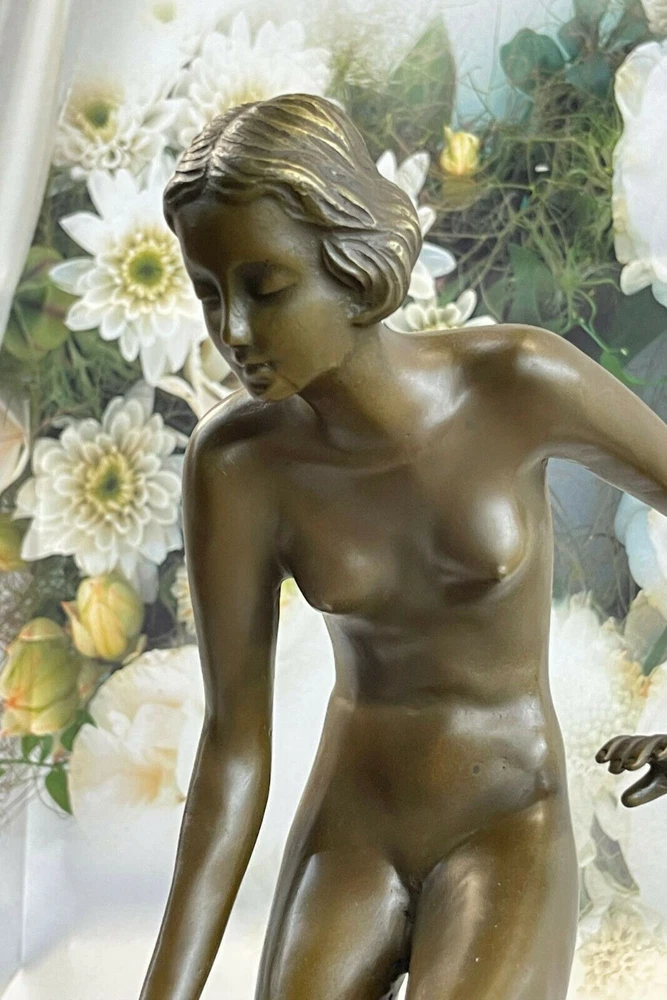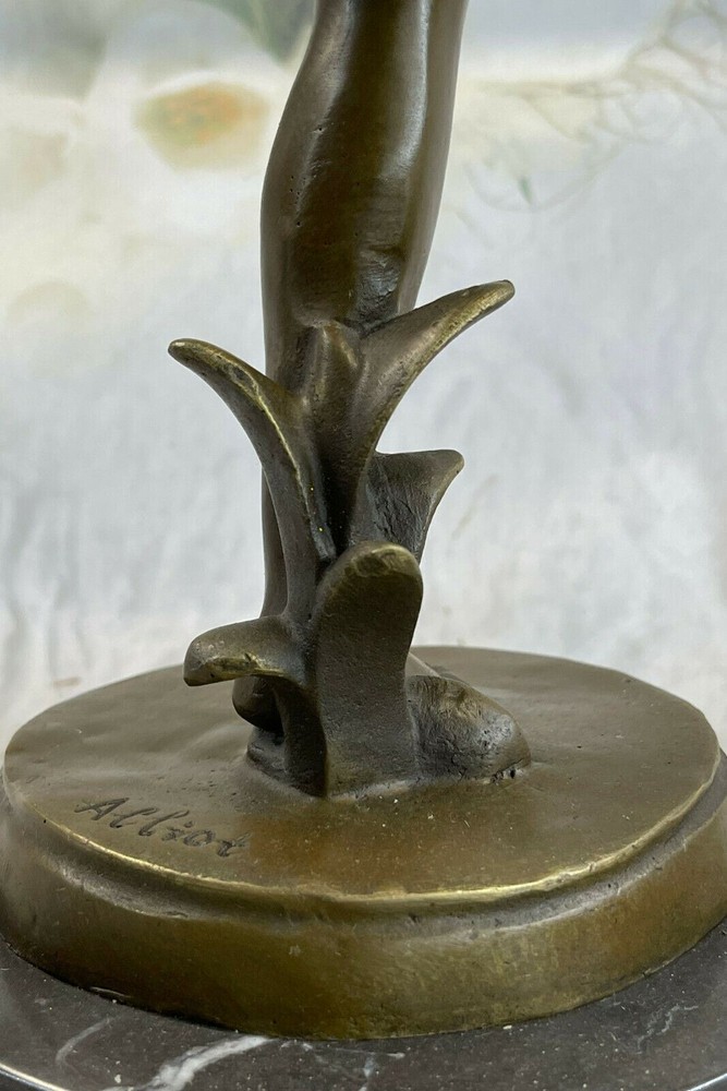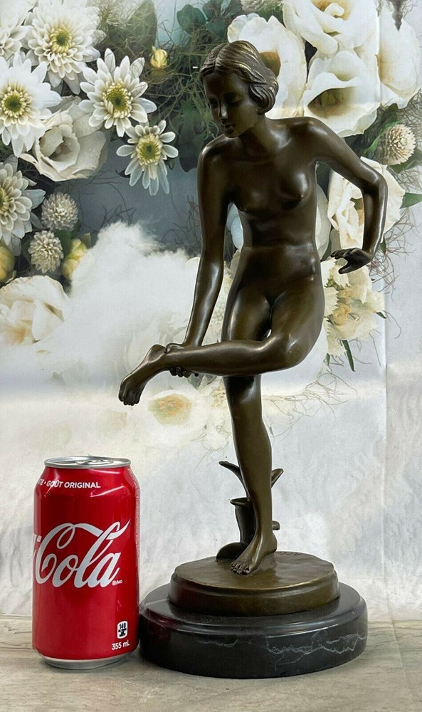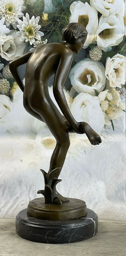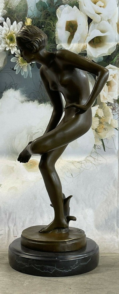 Art Deco Sculpture Nude Girl Woman Nakded Goddess Bronze Statue Figurine Deal NR Art Deco Sculpture Nude Girl Woman Nakded Goddess Bronze Statue Figurine Deal NR Condition : This sculpture is in perfect condition. Bronze Dimensions with Marble Base: Height 15" X Width 9" Marble Dimensions: Diameter 6" Height without base:14" Weight:10 LBS Inventory:64EP1287446 This vintage reproduction art deco bronze sculpture, attributed to Lucien Charles Edouard Alliot, offers a captivating glimpse into the elegant aesthetics of the early 20th century. Alliot, a French artist born in 1877, was known for his contributions to the Art Deco movement, and this sculpture exemplifies his stylistic prowess. The piece features a nude woman, her pose exuding a distinct Art Deco flair with one leg gracefully raised and held in her hand. This stylized representation showcases the fusion of classical form with the geometric and streamlined elements characteristic of the Art Deco era. The sculpture is elegantly mounted on a black marble plinth, adding a touch of sophistication to its presentation. The choice of marble not only complements the bronze material but also serves as a testament to the attention to detail and craftsmanship inherent in Alliot's work. The artist's signature, discreetly inscribed as "Alliot," adds an authentic touch to the piece, affirming its provenance and further contributing to its vintage charm. As a representation of Alliot's artistic vision and the broader Art Deco movement, this bronze sculpture captures the essence of the era's fascination with modernity, geometry, and the human form. Its combination of grace and boldness, executed with finesse, makes it a timeless tribute to the artistic legacy of Lucien Charles Edouard Alliot and the enduring allure of Art Deco aesthetics. Playful Nude Girl Bronze Statue Sculpture Figure after Lucien Alliot 15\" x 9\" EP-128 Video will open in a new window Using the eBay App? Paste link into a browser window: [isdntekvideo] Shipping Terms : Most of our items are shipped via USPS (United States Postal Service) mail or UPS. Most orders are shipped within 24-48 hours of purchase. Please be aware that not all items are available for USPS shipping due to size and weight. We do ship to Hawaii, Alaska, Canada, Puerto Rico, APO/AE, and U.S. Virgin Islands, however, an additional charge may be required. Please contact us before making any purchases in these areas. For Non-USA customers, you may be responsible for all duty, tax, brokerage fees that may be due upon delivery (shipping costs cover freight charges only). We also ship internationally. Please refer to the "Shipping and Handling" chart for the rates for each area. Payment : We accept just about any form of payment. PayPal, Master Card, Visa or American Express credit cards. Money orders, cashiers checks, and even personal or business checks. For governmental institutions, we will also accept a purchase order. Please understand that for personal or business checks we have to wait for the check to clear (usually 7 days) before shipping. Condition : New Detailed Hand Crafted Hot Cast Bronze Satisfaction Guaranteed. This is Stock Photo, Slight Color Variation!! Listing and template services provided by inkFrog