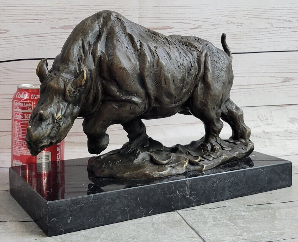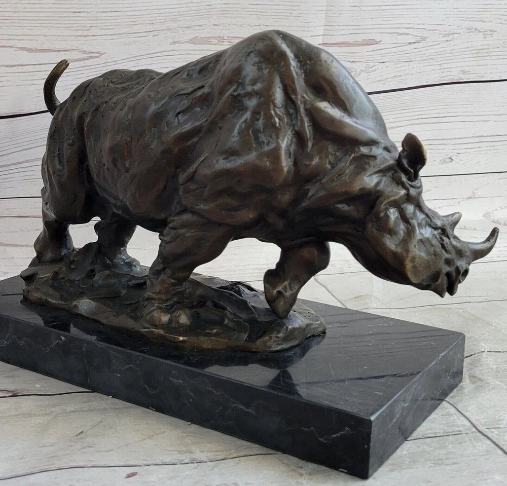 Condition : This sculpture is in perfect condition. Bronze Dimensions with Marble Base: Height 9" X Width 13" Marble Dimensions:12" X 6" Height without base:8" Weight:17 LBS Inventory:85AL3389058 Introducing a captivating bronze sculpture that celebrates the timeless and majestic rhinoceros. With a history spanning millions of years, these remarkable creatures have retained their fascinating and primitive appearance, evoking a sense of awe and wonder. This exquisite sculpture showcases the incredible craftsmanship that brings out the unique features of the rhinoceros. The artist's attention to detail is evident in the depiction of the rhino's thick skin and the intricate ridges that form as it shifts in movement. Every contour and texture has been meticulously crafted to capture the essence of this magnificent creature. The focal point of the sculpture is the rhino's head, which gently nudges the surface of a rock. The positioning allows its iconic horn to touch the ground, symbolizing its connection to the earth and emphasizing its strength and presence. The rhino's powerful stance conveys a sense of confidence and stability. The sculpture is elegantly presented on a black marble base, mirroring the shape of the rock underneath the rhinoceros. This thoughtful design choice adds to the visual appeal and complements the overall composition. The sturdy base ensures stability and enhances the overall aesthetic of the artwork. Crafted using the time-honored "Lost Wax Method," this sculpture is a testament to the artist's dedication to preserving the finest details. Each piece is individually cast and finished, ensuring the highest quality and authenticity. This remarkable sculpture bears the signature of the renowned artist Milo, reflecting his exceptional skill and artistic vision. With his signature, you can be confident in the authenticity and value of this collectible artwork. Display this captivating bronze sculpture in your home, office, or art collection, and let it serve as a reminder of the rhinoceros's enduring presence on our planet and the importance of conservation. This piece by Milo is a true testament to the beauty and magnificence of these ancient creatures. Signed Original Milo White Rhino Bronze Sculpture Marble Base Figurine Home Gift Video will open in a new window Using the eBay App? Paste link into a browser window: [isdntekvideo]