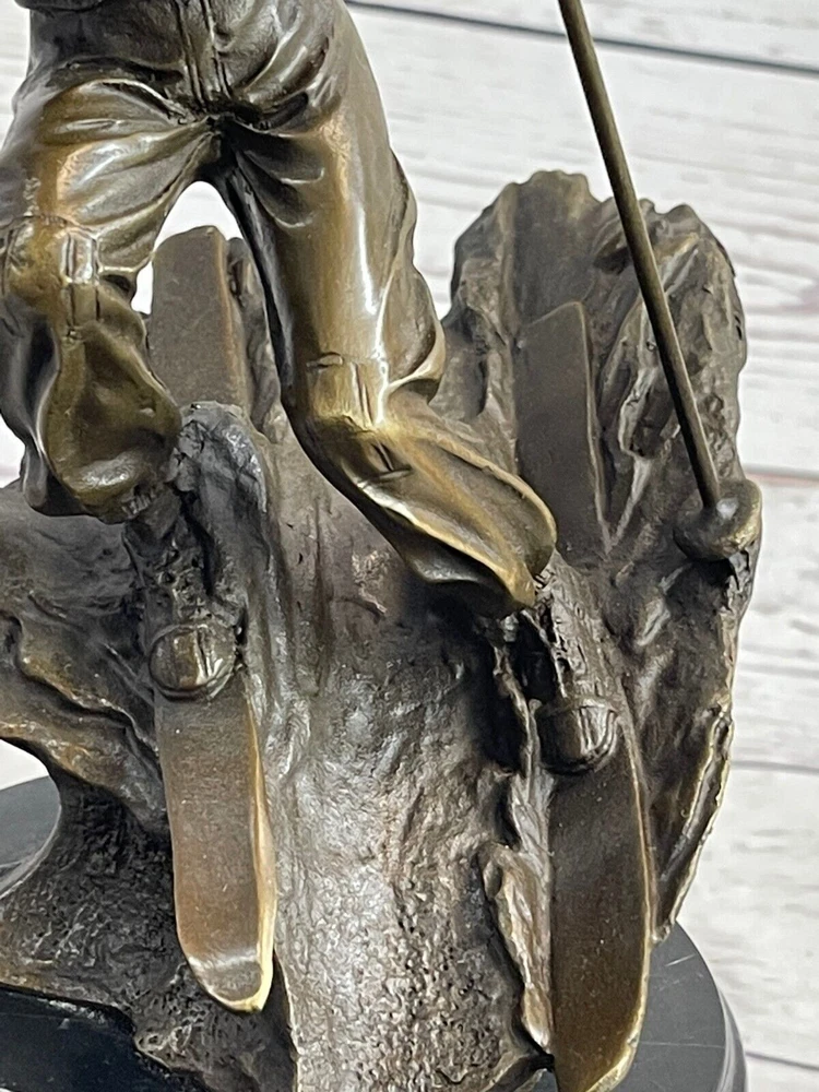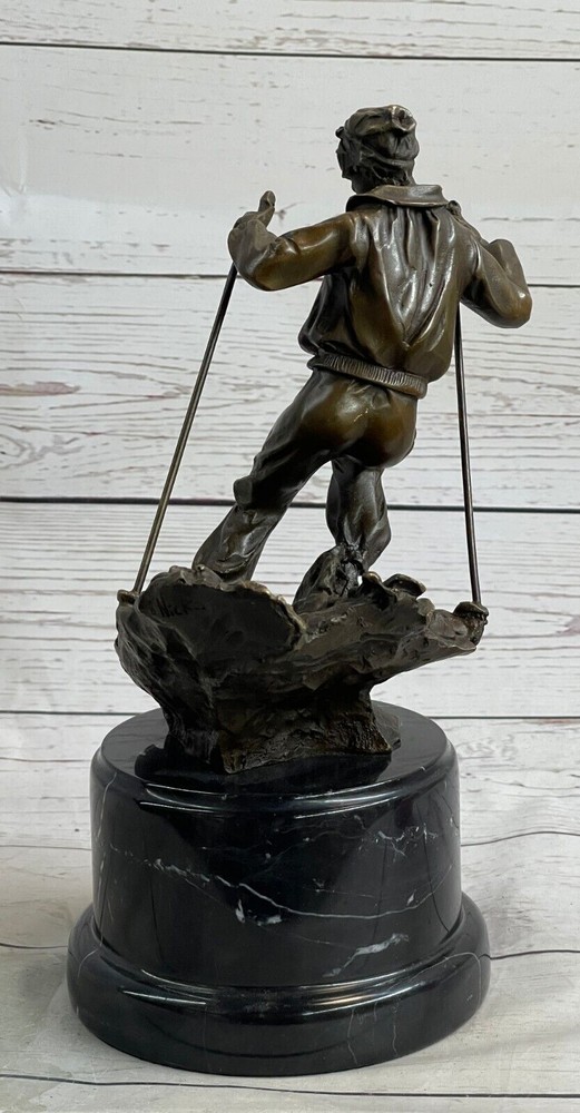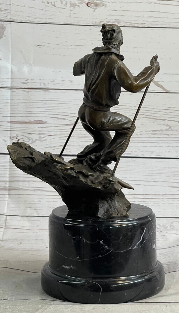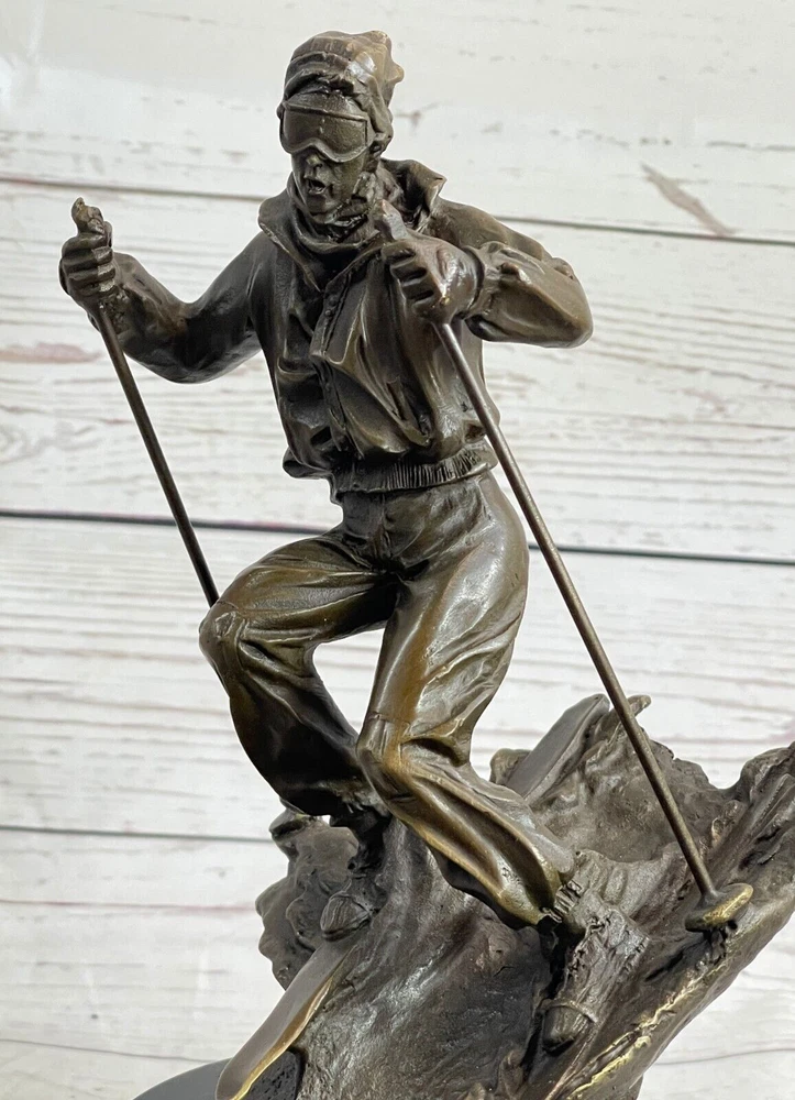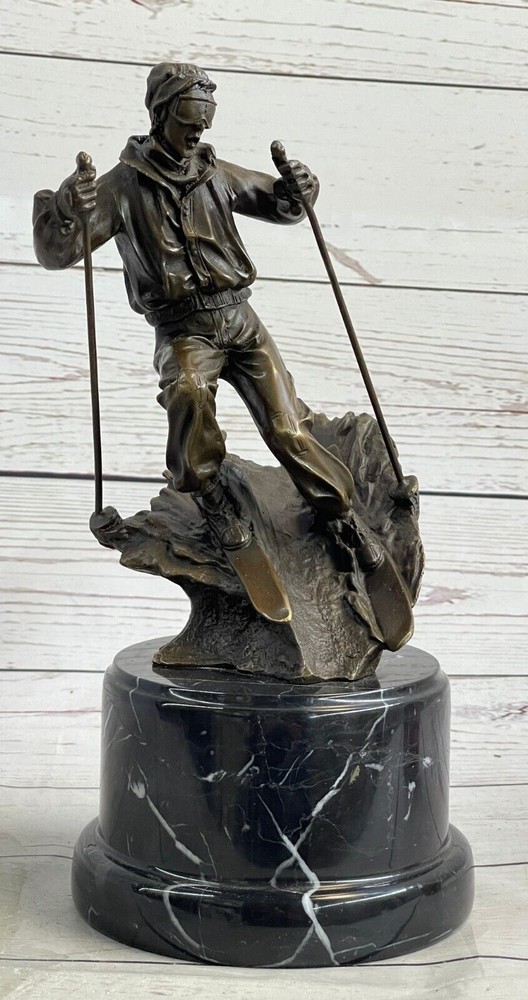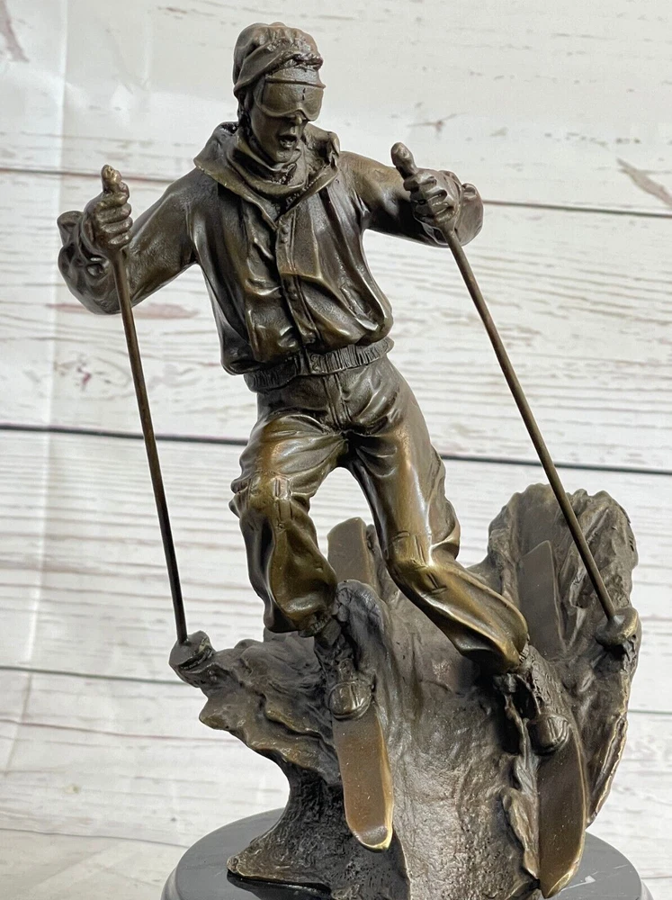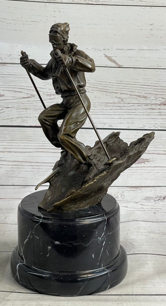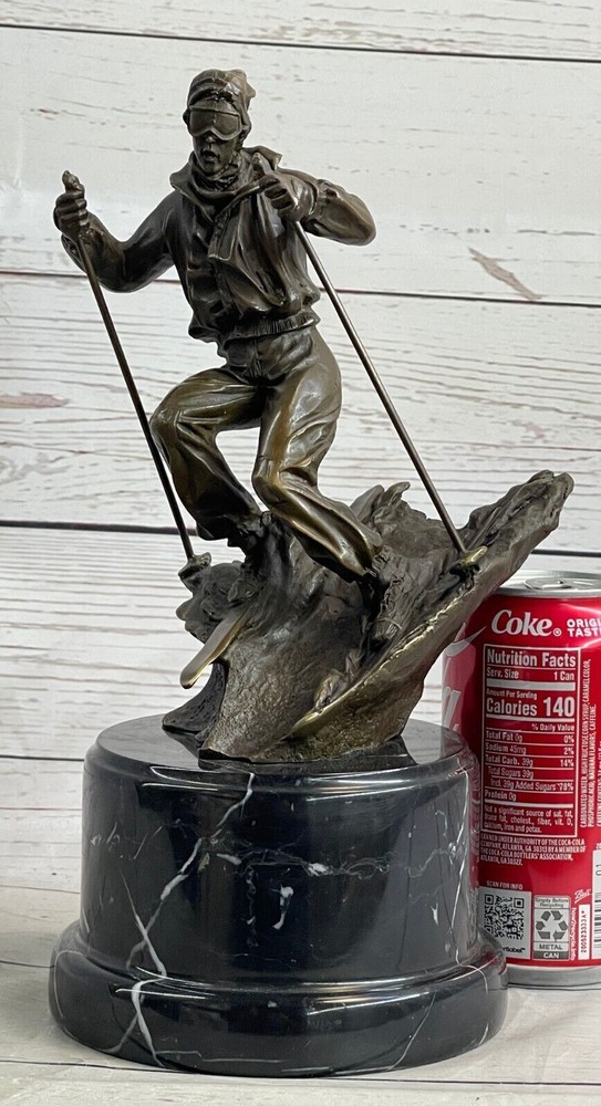 Condition : This sculpture is in perfect condition. Bronze Dimensions with Marble Base: Height 11" X Width 5" Marble Dimensions: Diameter 5" Height without base:7.5" Weight:10 LBS Inventory:36EP79163 Introducing the captivating bronze sculpture of a remarkable skier, whose passion for skiing preceded even his mastery of riding a bike. This young and confident individual fearlessly embraces the slopes with a freestyle approach. With hands tucked into his pockets for warmth, he effortlessly glides along, exuding a casual elegance. Displaying impressive control, he skillfully curves his skis outward, gracefully decelerating his descent. Meticulously crafted from 100% bronze, this exceptional sculpture showcases a captivating brown patina that adds depth and character to its form. Employing the revered "Lost Wax Method," the sculpture was painstakingly cast, ensuring its exquisite attention to detail. Resting atop a magnificent marble base, it harmoniously combines the timeless beauty of bronze with the enduring elegance of marble. This remarkable piece of art is truly one-of-a-kind, and it bears the distinctive signature of the talented artist, Nick, further attesting to its authenticity and artistic merit. Ideal for collectors and enthusiasts alike, this bronze sculpture encapsulates the spirit of skiing and the mastery of the human form in motion, making it a treasured addition to any art collection or interior space. Skiing Skier Bronze Metal Sculpture Statue Trophy Snow Sports Athletics Art Decor EP-791 Video will open in a new window Using the eBay App? Paste link into a browser window: [isdntekvideo]