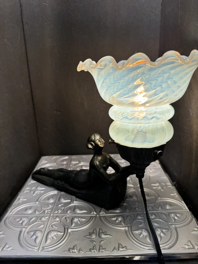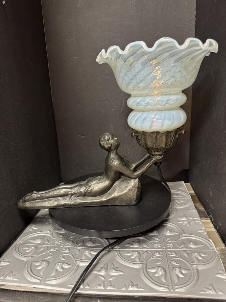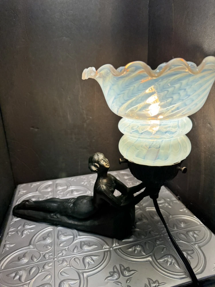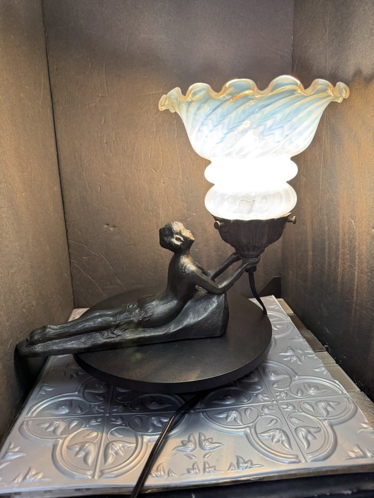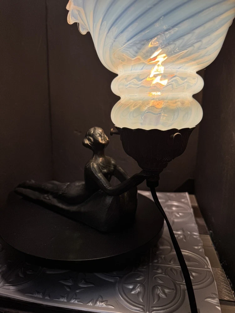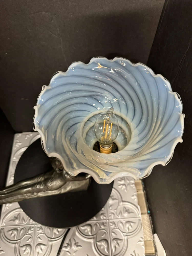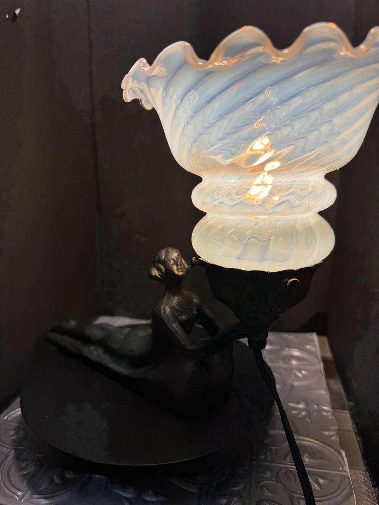 This stunning Art Deco lamp is a true collector's gem! The elegant bronze and glass lady figure with its opalescent swirl design adds a touch of vintage glam to any space. The Chandler signature and Fenton shade make it a rare find, perfect for lovers of 1960s style. The soft white and gray tones create a warm, nostalgic glow—absolutely worth adding to your collection!