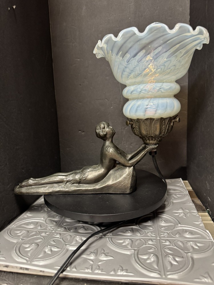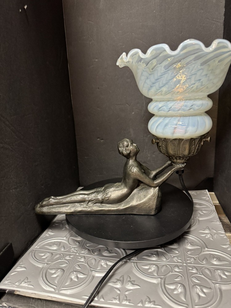 This Art Deco figural lady lamp is a unique addition to any collection. It features a beautiful swirl pattern and is made of bronze, wier, and glass materials. The lamp is in white color and has a gray color finish. This vintage lamp is signed by Chandler and has a large size with a black cord color. It is a Fenton Oplesent Shade type and has a shaded design. The lamp is from the 1960s era and is an original piece. It is perfect for collectors and enthusiasts who appreciate the Art Deco style and vintage designs.