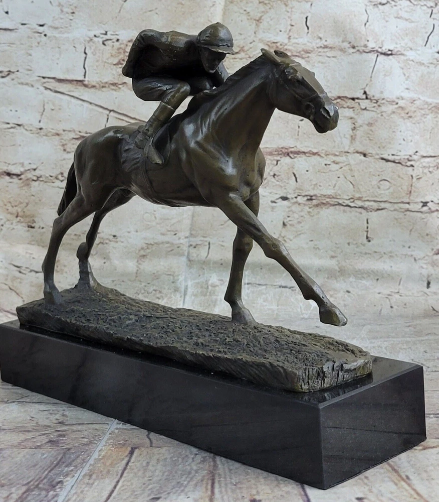 Art Deco Hot Cast Male Jockey and Horse Bronze Trophy Sculpture Figurine Artwork Art Deco Hot Cast Male Jockey and Horse Bronze Trophy Sculpture Figurine Artwork Condition : This sculpture is in a perfect condition. Bronze Dimensions with Marble Base: Height 9"" X Width 11.5" Marble Dimensions:11 1/2" X 4" Height without base:8" Weight:12 LBS Inventory:53Y3764535 Gear up for a thrilling ride like no other with this captivating bronze sculpture! A true masterpiece of motion, this dynamic piece captures the heart-pounding intensity of a high-stakes race. At its center, a steadfast thoroughbred and its skilled jockey surge forward with unparalleled determination, a partnership bound for victory. Every sinew of the horse's powerful frame ripples with energy as it charges down the grassy track, its tail billowing like a flag in the wind. The jockey, an embodiment of unwavering resolve, urges the horse on with fervent encouragement, heels dug firmly into the stirrups. Their unwavering focus is fixed solely on the finish line that beckons in the distance. Meticulously crafted using the revered lost wax method, this sculpture is a testament to the artistry and skill that goes into each and every detail. The horse's musculature is exquisitely defined, a tribute to the athleticism and grace of these majestic creatures. As the wind whips through their hair, the scene comes alive with a sense of motion and vitality that is truly mesmerizing. Whether displayed in a grand gallery or as a focal point in a cherished space, this action-packed piece commands attention and ignites a sense of awe. For those who cherish the spirit of competition and the thrill of the racetrack, this sculpture is the ultimate embodiment of ambition and dedication. An ideal gift for equestrian enthusiasts or anyone who resonates with the pursuit of excellence, it bears the distinguished signature of Milo—an assurance of artistic authenticity and a symbol of the passion that drives both horse and rider to reach for the stars. JOCKEY RIDING HORSE BRONZE STATUE FIGURE FIGURIN HOT CAST MARBLE BASE SCULPTURE www.bronzhaus.com Video will open in a new window Using the eBay App? Paste link into a browser window: [isdntekvideo] Shipping Terms : Most of our items are shipped via USPS (United States Postal Service) mail or UPS. Most orders are shipped within 24-48 hours of purchase. Please be aware that not all items are available for USPS shipping due to size and weight. We do ship to Hawaii, Alaska, Canada, Puerto Rico, APO/AE, and U.S. Virgin Islands, however, an additional charge may be required. Please contact us before making any purchases in these areas. For Non-USA customers, you may be responsible for all duty, tax, brokerage fees that may be due upon delivery (shipping costs cover freight charges only). We also ship internationally. Please refer to the "Shipping and Handling" chart for the rates for each area. Payment : We accept just about any form of payment. PayPal, Master Card, Visa or American Express credit cards. Money orders, cashiers checks, and even personal or business checks. For governmental institutions, we will also accept a purchase order. Please understand that for personal or business checks we have to wait for the check to clear (usually 7 days) before shipping. Condition : New Detailed Hand Crafted Hot Cast Bronze Satisfaction Guaranteed. This is Stock Photo, Slight Color Variation!! Listing and template services provided by inkFrog