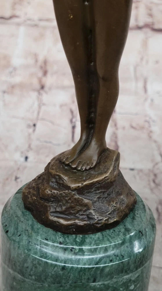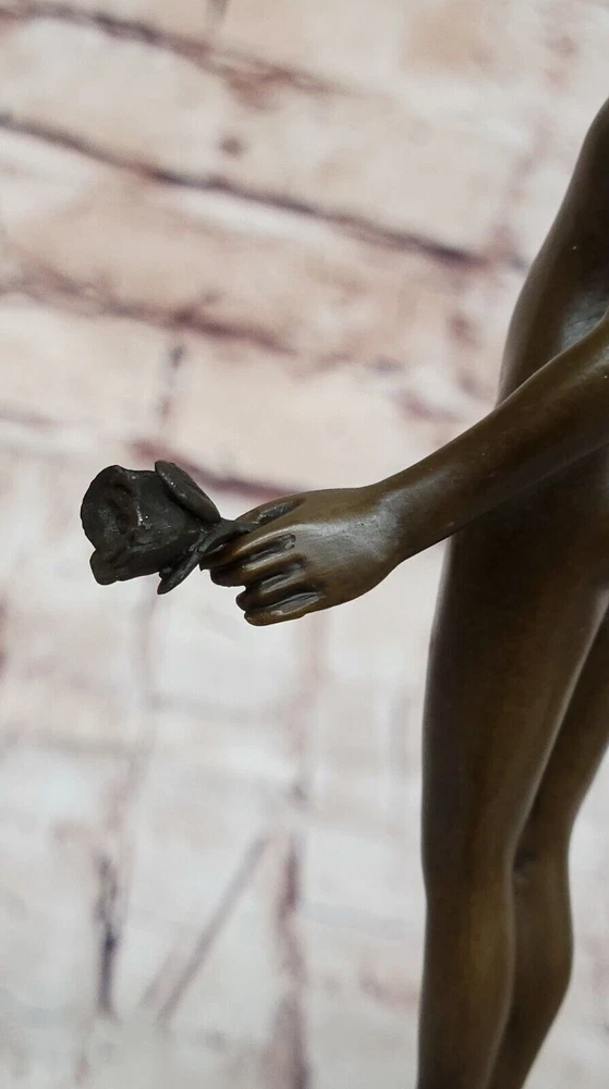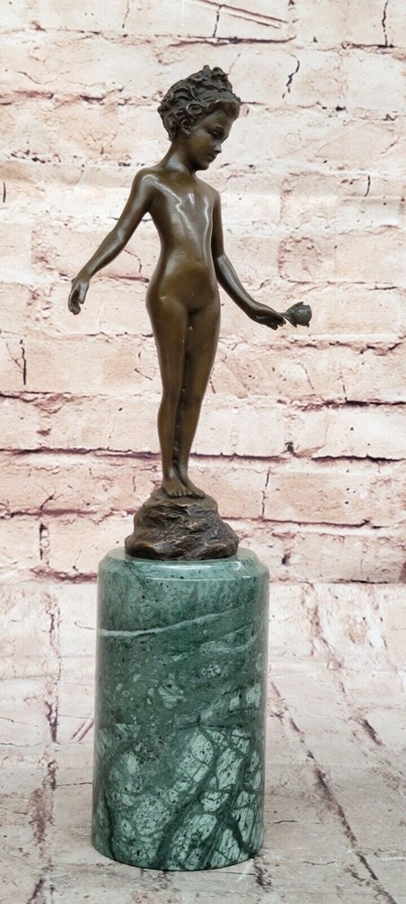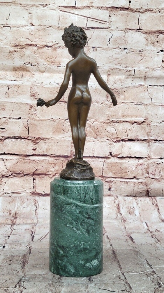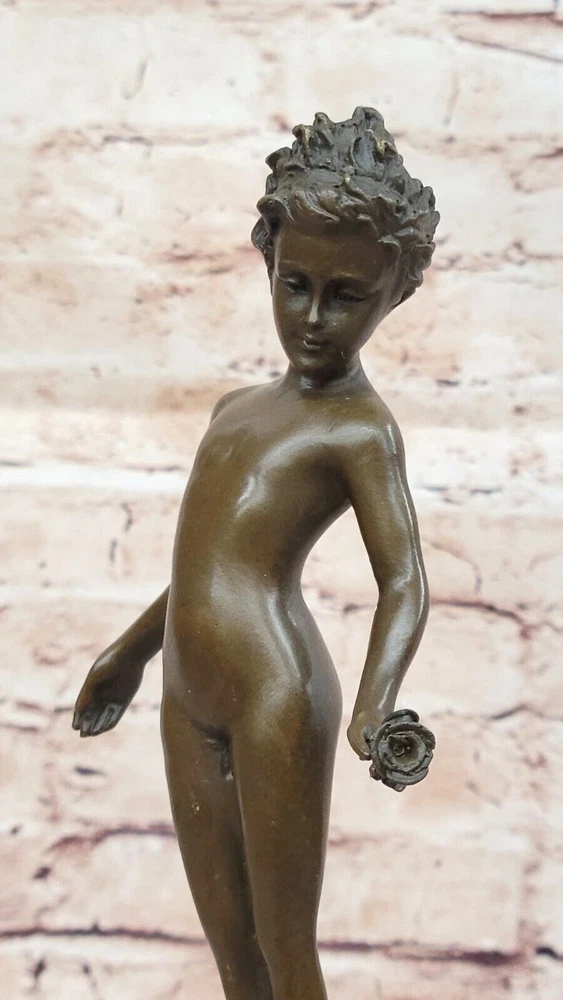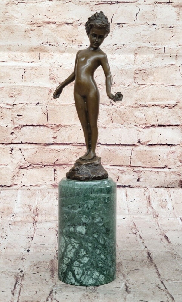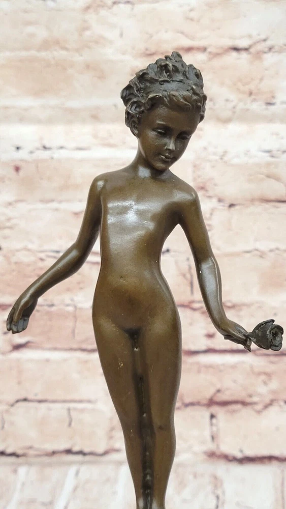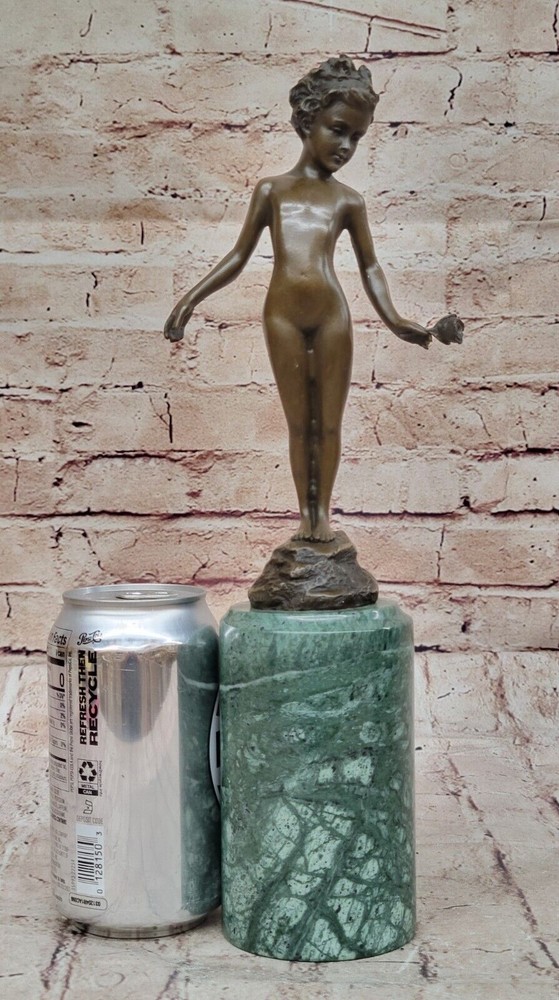 Condition : This sculpture is in perfect condition. Bronze Dimensions with Marble Base: Height 13" X Width 4" Marble Dimensions: Diameter 3" Height without base:8" Weight:5 LBS Inventory:41B7452014 This stunning bronze sculpture depicts a beautiful and confident young girl standing tall with her chest puffed out. In her hand, she holds a single lone-stemmed flower, offering it to the world with grace and poise. Her wild curly hair adds to her natural beauty, while her slender figure exudes confidence and strength. Crafted using the "Lost Wax Method," this sculpture is 100% handmade and features a gorgeous brown patina finish that brings out the intricate details of the piece. The sculpture is mounted on a high-quality marble base, adding to its elegance and beauty. This beautiful piece of art is signed by the renowned artist Milo and is sure to be a conversation starter in any setting. Whether displayed in a home, office, or gallery, this sculpture is a true work of art that captures the beauty and confidence of youth. Signed Milo Bronze Sculpture Statue Young Girl Nude Art Deco Nouveau Figurine Video will open in a new window Using the eBay App? Paste link into a browser window: [isdntekvideo]