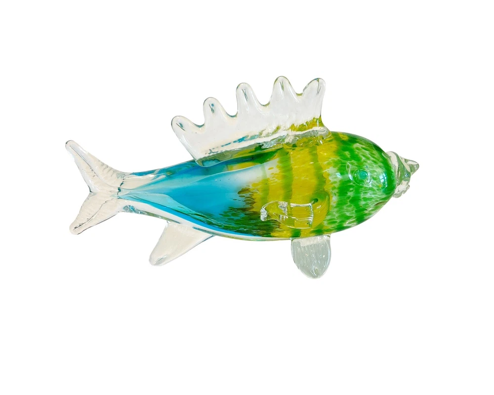 This stunning hand-blown glass sculpture features a vibrant tropical fish design in shades of blue, green, yellow, and clear. Crafted with high attention to detail, this 11-inch figurine has a 3D effect and a glossy finish that makes it a standout piece in any collection. The fish subject is perfect for those who love ocean and fish-themed decor. This original art glass piece is handmade and weighs 2lbs. It is a unique and authentic item that will add a touch of elegance to any space. Smoke free home Please visit my store at https://www.ebay.com/str/theuniqueredhead . Thank you for your consideration. Please message me if you have any questions. I do combined shipping on my items in the store.