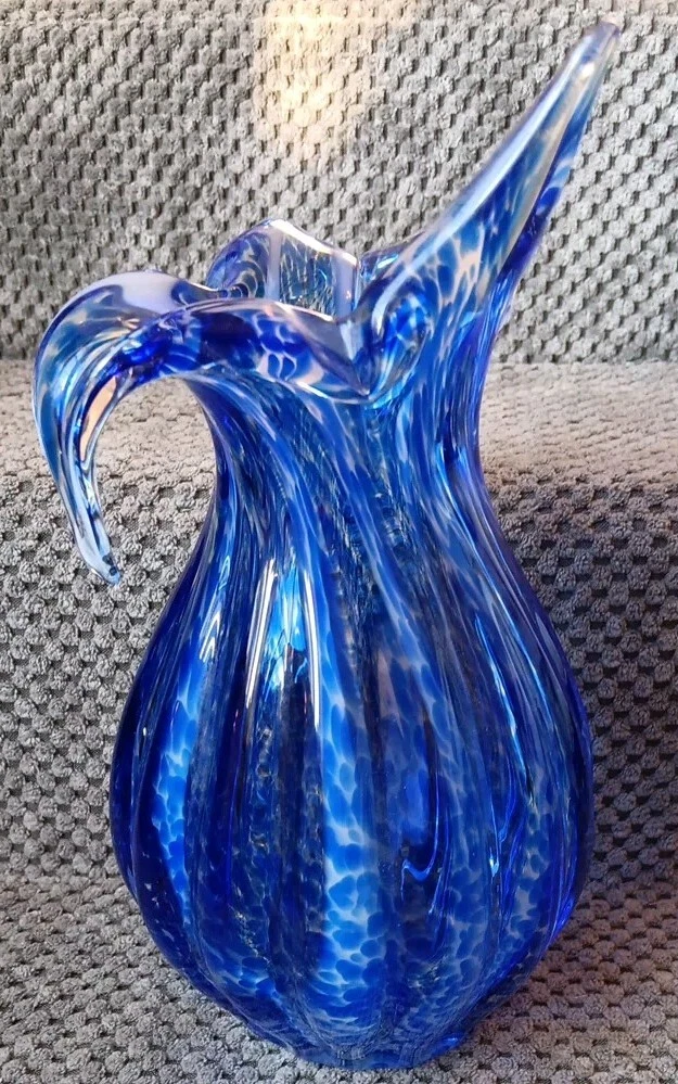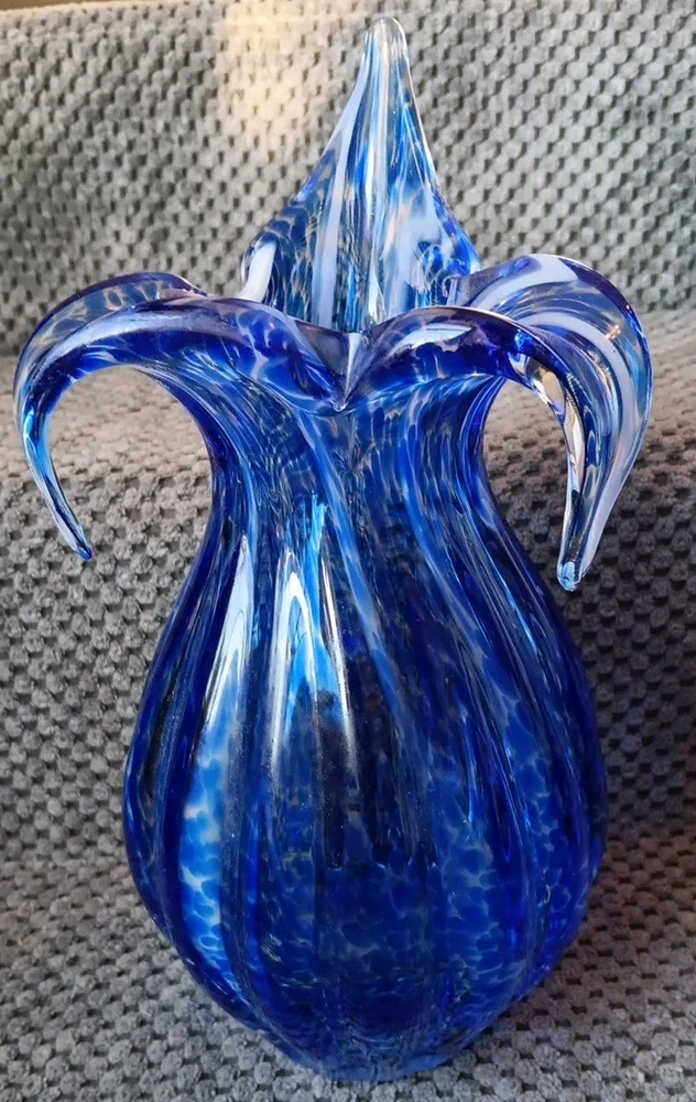 Art Glass Vase Hand Blown Cobalt Blue Spotted Ribbed Calla Lily Vase 8.5"