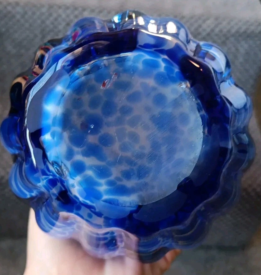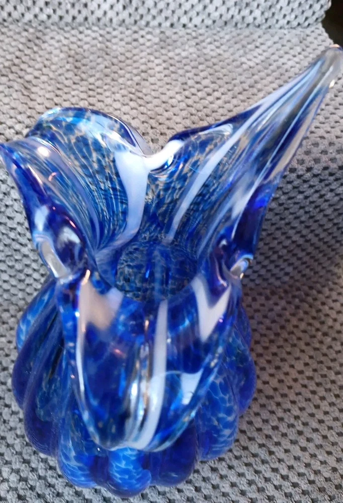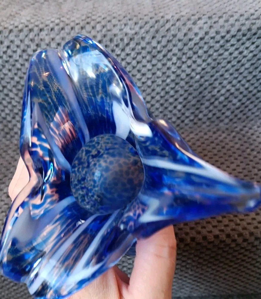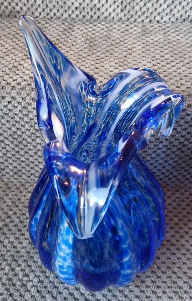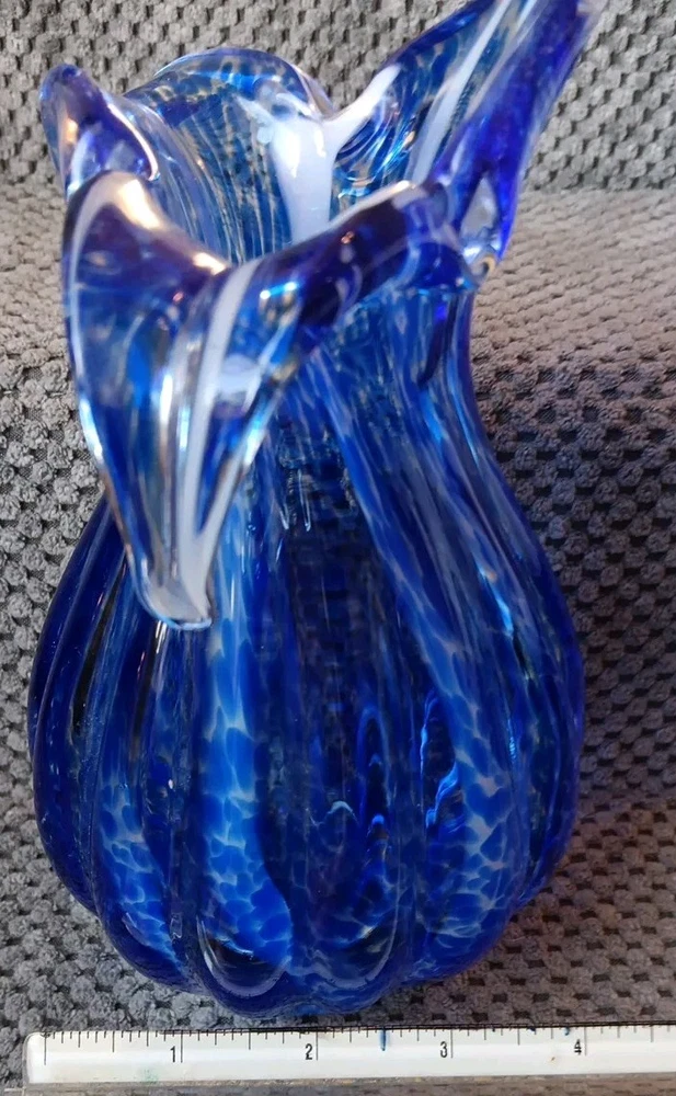 Production Style:Art GlassOrigin:UnknownBrand:Unbrandedgtin13:Does not applyStyle:Art DecoUPC:Does not applyMPN:Does Not ApplyItem Height:8.5 inItem Length:8.5 inCharacter:vaseColor:Blue with White StreaksGlassmaking Technique:Hand BlownTheme:FlowerShape:Flower BudType:Flower VaseMaterial:GlassDepartment:Adults