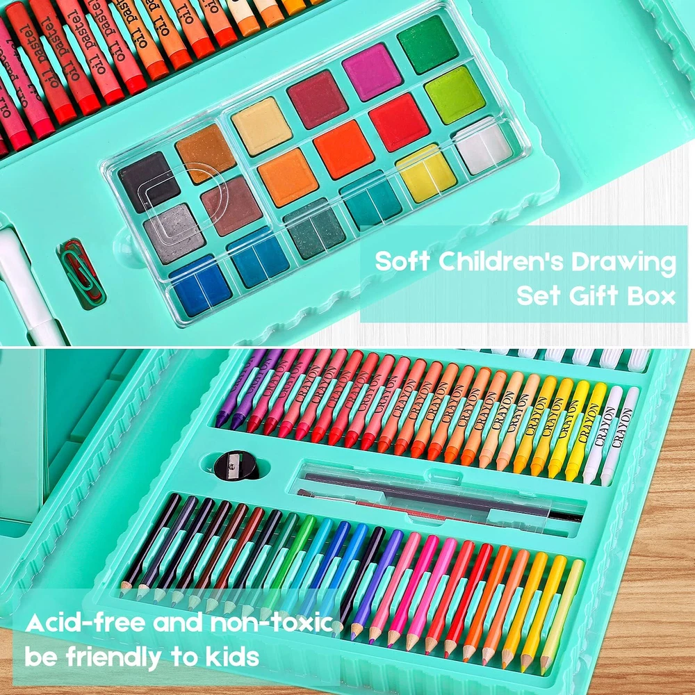 222 Pieces Double Sided Trifold Easel Art Set, Drawing Art Box with Oil Pastels, Crayons, Colored Pencils, Markers, Paint Brush, Watercolor Cakes, Sketch Pad 【Premium Art Kit】This kit has everything you need to get started creating in a compact potable case! You can begin drawing, coloring and painting as soon as you open the art box. Specially designed with Double Sided Trifold Easel, 1 sketchbook, 1 coloring book, 1 Gift Box. Great art set for any level of artist, especially for child who loves to doodle or wants to inspire and enjoy the joy of drawing and painting. This art case makes a perfect Gift for kids, girls and boys! 【Gift Box Packed, Easy to Carry and Use】 The art sets case includes double sided pop-up easel inside, making it easy for your young artist to color anywhere creativity strikes, or share with friends or family. Convenient portable carrying case folds up so it can be used at home or on the road. Great for traveling and makes a great gift for kids, teens, girls, boys ages 6 7 8 9 10 11 12 years old. 【Enough Art Kits】The art set case includes everything your child needs to explore their creativity: 48-Oil pastels, 47-Paper clips, 24-Crayon, 24-Colored pencils, 18-Water color cakes ,12-Water color pens, 10-A4 White papers, 4-Larger clips, 1-Drawing pad, 1-Coloring book, 1-Palette, 1-Sketch pencil, 1-Paint brush, 1- Pencil sharpener, 1- Ruler, 1-Eraser, 1-Glue, 1-Ponge, 1-Plastic art box. They are great art sets for young children who are beginners and exploring their curiosity. 【Safe Art Kits】Made with quality materials, this art drawing kit is safe and no harm for kids and adults. All of the crayons, pencils, markers and pastels in this art kit are safe and non-toxic, conforms to ASTM D4236. Safe art kits to use for any level of artist. Great Art Kits Gifts for Christmas Gift, Birthday Present, Children's Day, Mother's Day, Easter Day, Valentine's Day, Thanksgiving Day, Party, New Year, Back to School Supplies Gift. 【Quality Assurance】At , for all our drawing supplies art sets, we prioritize quality and customer satisfaction. Our art sets are made of premium materials to ensure the durability and persistence of all your art projects. If you have any problems during the purchase, please contact us and we'll be glad to assist you to ensure your satisfaction.