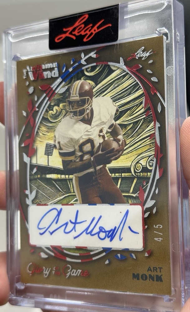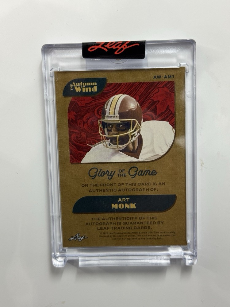 The product is a limited edition Art Monk autographed trading card by Leaf, featuring the Hall of Fame football player Art Monk’s signature on a foil design. There is only 5 of this print which makes it highly collectible. This card is part of the NFL Football League (NFL) collection from the year 2025, making it a valuable and sought-after item for football enthusiasts and collectors alike. With only five cards available, this particular card is a rare find and a unique addition to any sports memorabilia collection.
