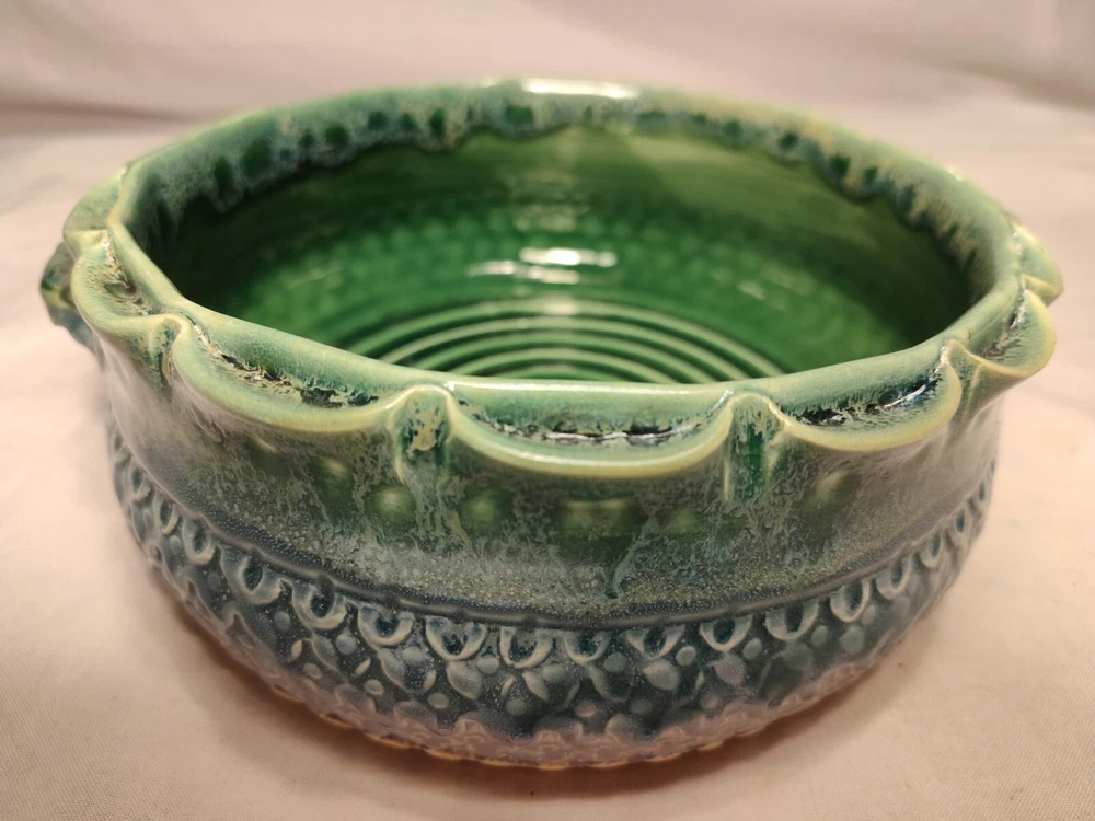 Earthen Clay Pot 7" Pottery Vintage North Carolina USA Wonderful handmade pot with raised relief and a beautiful combination of colors and patterns. The artist Hope Fregerio hails from Charlotte North Carolina. The pot measures just over 7 inches in diameter and 3 inches tall. Signed on base.