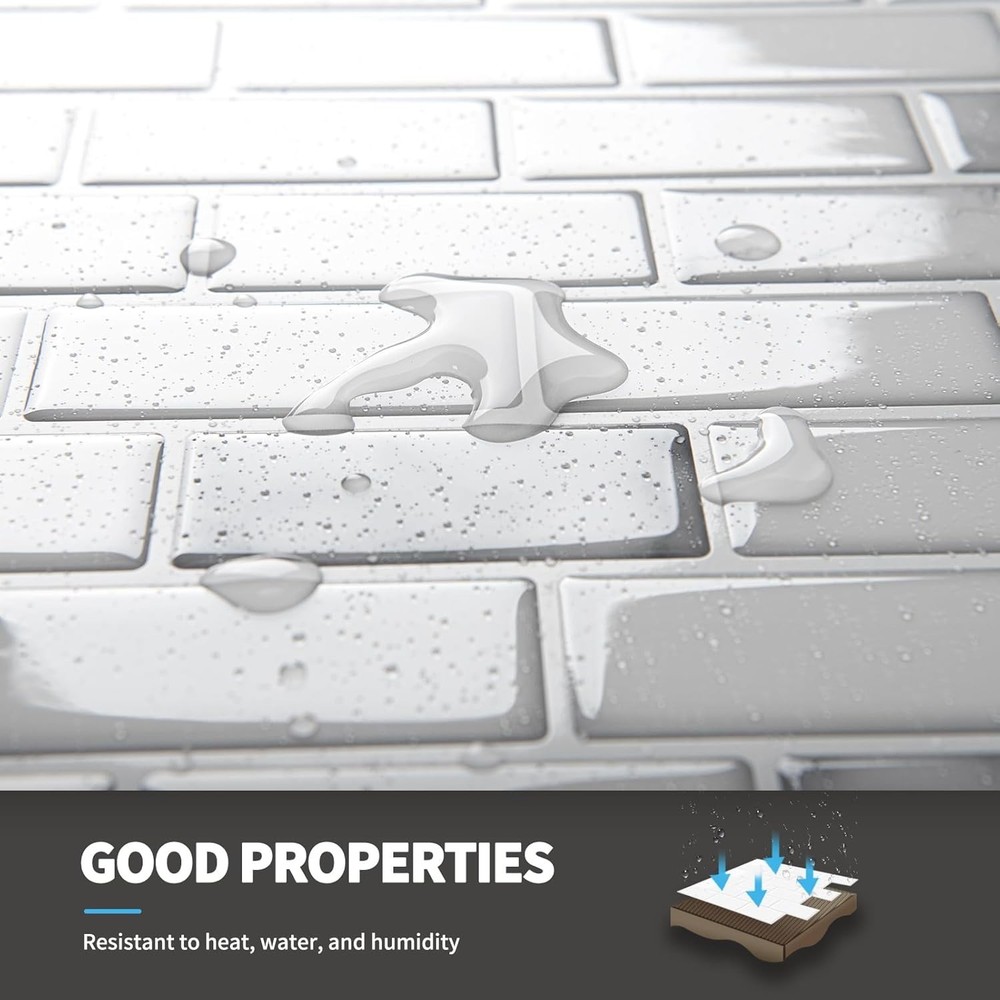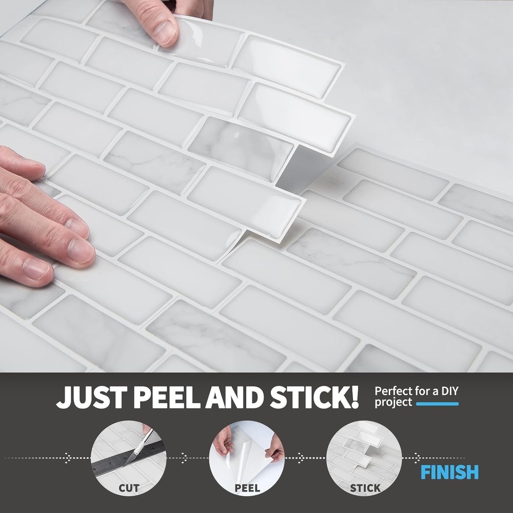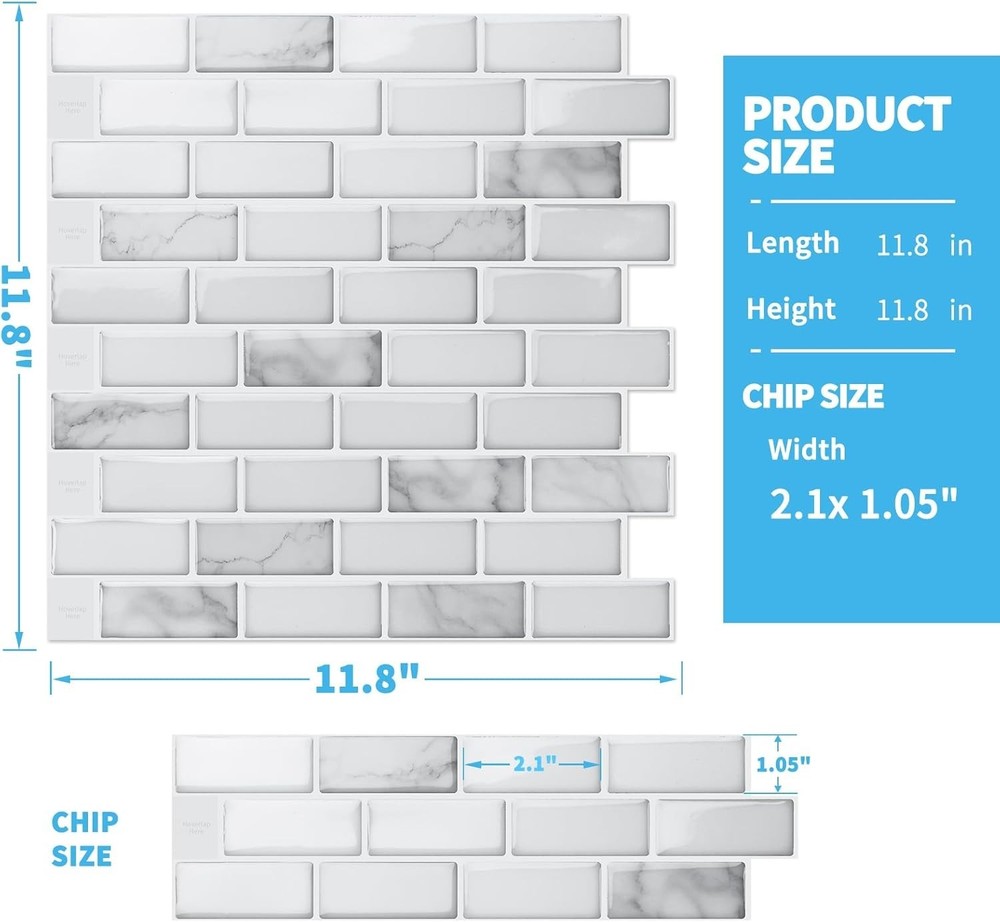 10 sheets premium self-adhesive tiles, 12" X 12" each Upgraded strong back glue, especially designed for kitchen, shower and fireplace Some non-raised surface, such as cement wall, plywood wall, gypsum wall, textured walls can be applied. Ensure that the wall is flat and dry before installation. Thickened top gel giving a better 3-dimensional effect than normal peel & stick tile Just peel and stick, no grout, no glue, no special tools and no mess
