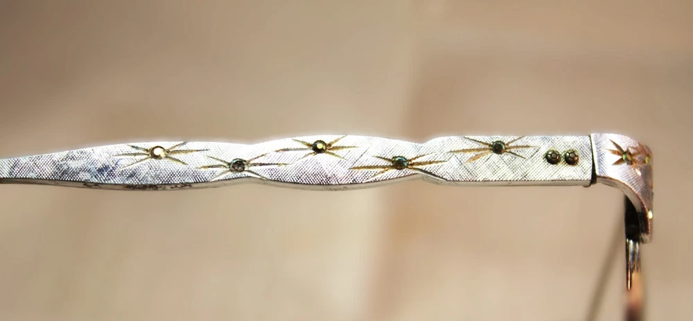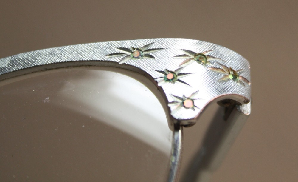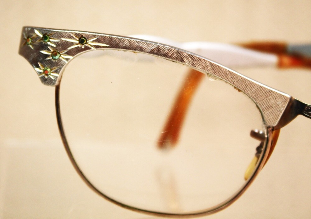 ArtCraft Vintage Silver Cat Eye Eyeglasses Frames USA Women Fashion Starburst design. Only two of the rhinestones are missing on the frame. Some don't show up in the picture because the light is not hitting all that are in the picture. The covers on the ear pieces are in bad shape, but they can be replaced.