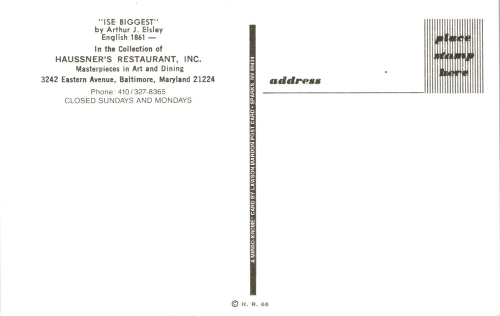 MAKE AN OFFER. THE MORE YOU BUY THE BETTER DEAL I WILL ACCEPT The postcard features a painting titled The Biggest by artist Arthur J. Elsley, who was English and active during the 19th century. The painting is part of the collection at Haussner's Restaurant, Inc. in Baltimore, Maryland. Haussner's was known for its combination of art and dining, showcasing masterpieces alongside delicious food.