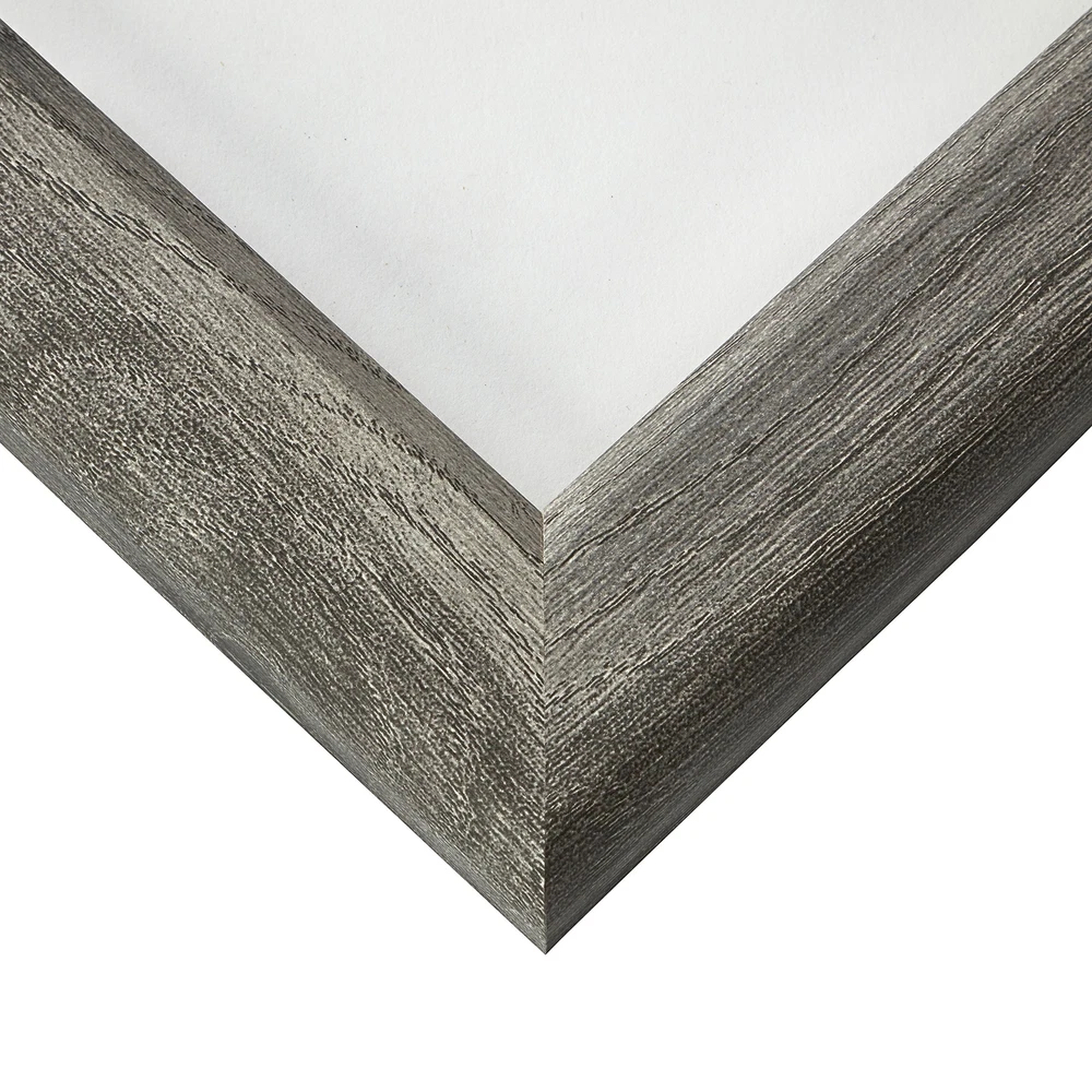 Contemporary style; grey barnwood appearance; smooth laminate wrap finish (NOT ACTUAL BARNWOOD) Frame includes: clear acrylic facing, rigid cardboard backing and wire hanging hardware kit (some assembly required) Frame holds a 16 by 22-Inch photo/print/poster (viewable area reduced by .25" on each side due to frame lip) Frame moulding is 1.25 inches wide; solid MDF construction Frame is designed for WALL HANGING only (hanging hardware allows for portrait or landscape orientation)