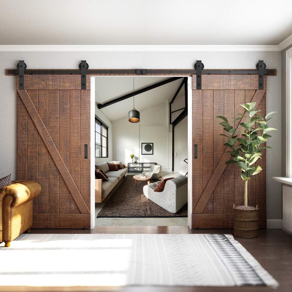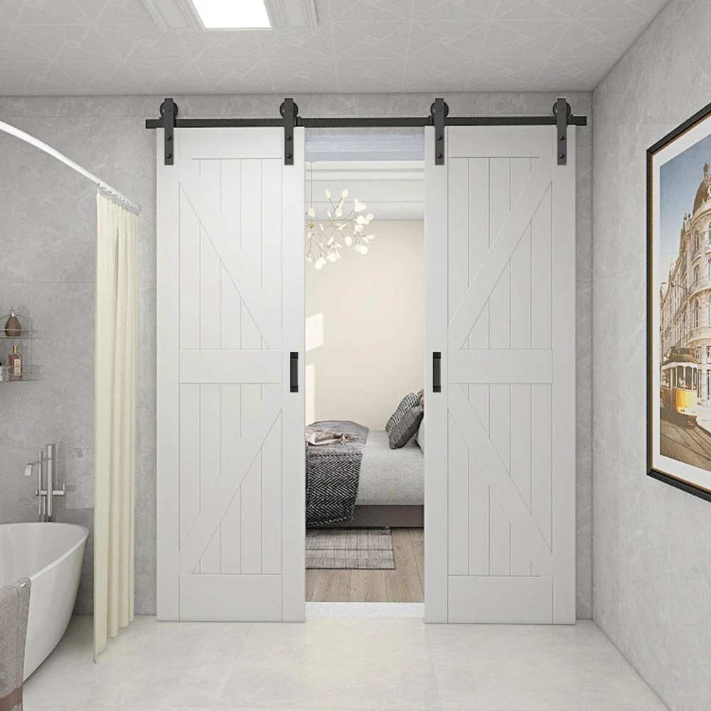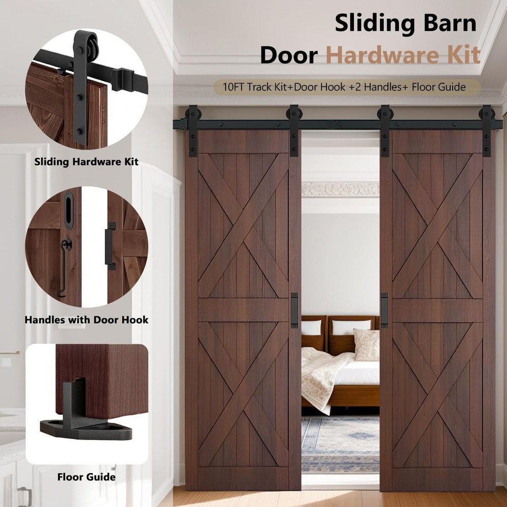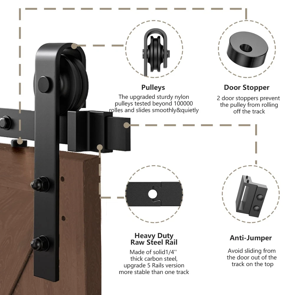 barn door hardware kit hangers ▶【Heavy Sturdy and Reliable Hardware kit】:Our barn door hardware kit is built to last, featuring high strength industrial grade tracks and J pulleys that can easily support loads of up to 380 lbs wooden door. It is suitable for doors panels with a thickness ranging from 1 3/8 - 1 3/4 inches, ensuring a strong and secure installation. We offer 5ft, 6ft, 6.6ft 9ft, 8ft soft close barn door hardware kit for single barn door and 10ft 12ft double slider track for double barn door hardware kit. ▶【Smooth and Quiet Operation Sliding Door Track kit】: Two anti-jump disks and up-side-down T-shaped guide, our barn door hardware provides stability and prevents swinging as the door moves along the rail. The floor-mounted installation adds an extra level of stability to the sliding door system, ensuring that your door glides smoothly along the track without any wobbling or jumping. Enjoy a smooth and quiet sliding experience, adding a touch of modern convenience to your space. ▶【Versatile Barn Door Kit Application】: Whether you have cement walls or wood walls, our barn door hardware kit is designed to accommodate both. Its rustic style makes it a perfect fit for various indoor and outdoor settings, including kitchen, bedroom, shower room,laundry,dressing room, storehouse,clubs, pubs, while its waterproof and rustproof construction also makes it suitable for barns, garages, stables, and more. ▶【Complete Sliding Barn Door Hardware kit】: With 5 rails included and all the necessary in the Barn Door Accessories Pack components for easily install the track on the floor allowing for smooth and effortless movement of your barn door. It consists of 6 floor-mounted design rails, 9 wall spacers, 4 T-shape hangers, 2 T-shape floor guide, 4 Door Stopper, 2 slide room door hook, 4 rubber ends and 2 hex key. You'll have everything you need to set up your barn door system (door not included) ▶【Ideal for Multiple Rooms】: Embrace the modern twist on the classic barn door design and enjoy the space-saving benefits it offers. This versatile kit allows you to open up multiple rooms without any hassle. Perfectly suited for hallway, living rooms, bedrooms, storage, bathroom and study room even farmhouse -make the right choice for your house and elevate your living spaces. Its sleek and modern design seamlessly blends with any decor style. Even use for hanging door.