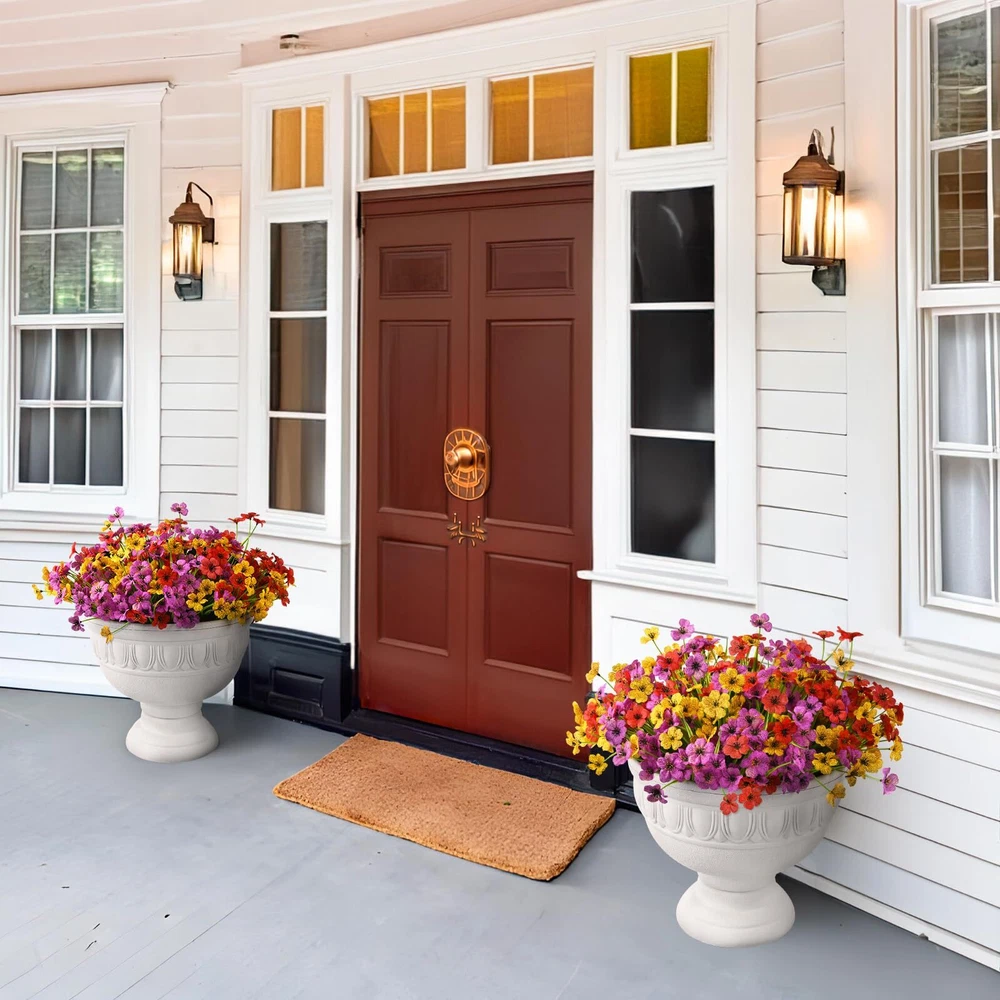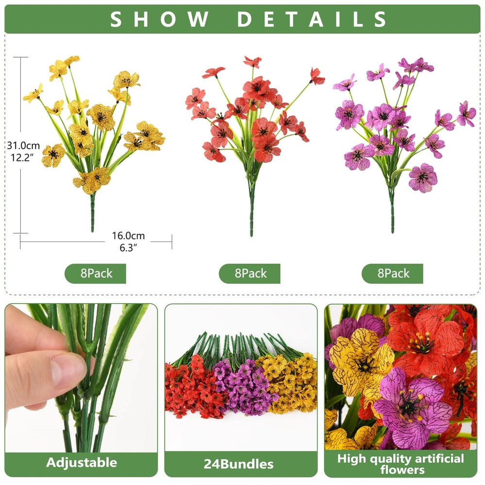 24 Bundles of Artificial Outdoor Flowers Branches:This package comprises a total of 24 bundles,featuring 8 branches each of hot red,purple,yellow daisy flowers.Colorful blooms allows for creating stunning flower arrangements and bouquets. High Quality:These artificial outdoor plants are made of High quality material,Each flower come as close to real as can be,offer true-to-life petal and foliage textures.It 's UV resistant,It will blooms all year round. Realistic Artificial Flower:These faux outdoor plants are real looking,these artificial branches exude a stylish and authentic appearance,rendering them ideal decorations for your home, garden,yard,patio,balcony.Both indoors and outdoors.A must-have for spring and summer decor. Suitable for Indoor Outdoor Decoration:These true-to-life fake outdoor daisy flowers infuse a charming and welcoming vibe into your front porch, walkway, garden, and more.Additionally, they serve as versatile decorations suitable for weddings, hotels,office, guesthouses, parties or other indoor outside place decoration, create an illusion of enlarged space. Variety of Bundle Choices:Elevate your home's ambiance with these 24 bundles of daisy flowers,colorful flowers with green leaves,There are various vibrant colors to choose,no watering needed and adjustable branches make DIY easier.