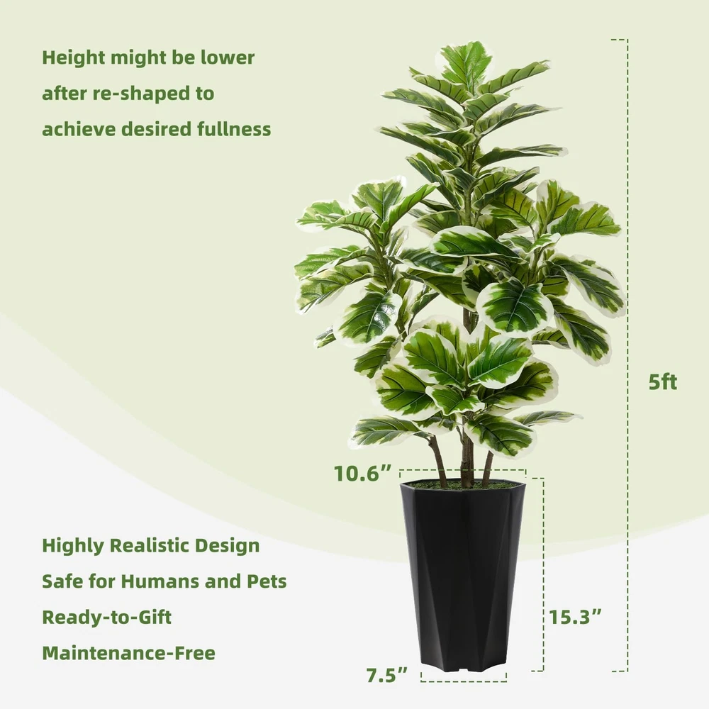 Rubber Tree Artificial 5ft Perfectly Proportioned Planter: Designed to complement the fake Lyrata tree, our planter offers the ideal blend of style and functionality. Each set includes everything you need: the tree, planter, and artificial moss, so you can skip the extra purchases and enjoy a hassle-free setup. Highly Realistic Design: Crafted with polyester and plastic, each artificial tree is carefully hand-assembled with wire stems to deliver a lifelike appearance that’s hard to distinguish from the real thing. The rich, natural color variations enhance its authenticity, making our fake plant a striking addition to any space. Year-Round Freshness: Bring the beauty of nature into your home with our fake tree, which maintains its vibrant green appearance throughout the year. Unlike real plants, it won’t wither in the winter or suffer from the summer heat—always lush, always beautiful. Adjustable Branches & Leaves: Customize the shape and fullness of your floor plant by simply bending, separating, and fluffing the branches and leaves. Built with durable, safe materials that are perfect for family homes and pet-friendly environments. Zero Maintenance: Enjoy the beauty of a thriving tree without the upkeep. Our faux trees indoor require no watering or trimming—just the natural, relaxing beauty of greenery without the effort.