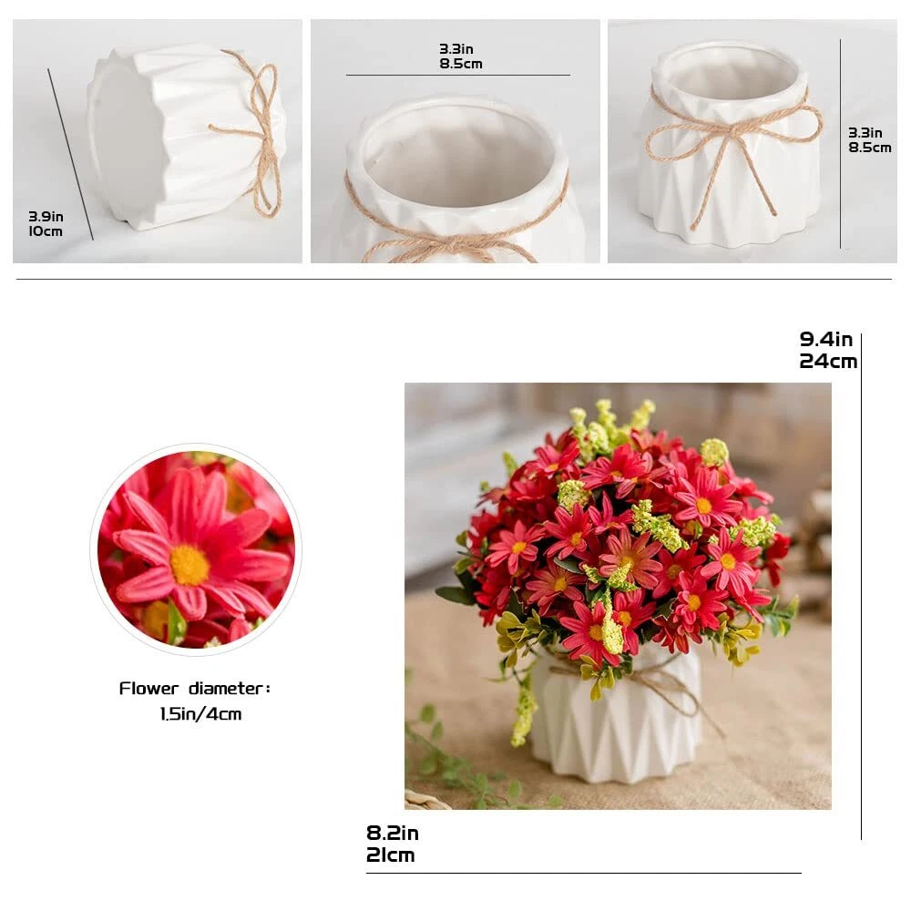 SPECIFICATION: Flower material: Silk Leaves material: Plastics Stem material: iron wire + environmentally rubber Total length of flowers :9.4 inch Diameter of rose flower head:1.5 inch Diameter of vase’s top: 3.3 inch Diameter of vase’s bottom:3.9 inch Height of vase:3.2inch Application of the silk rose flowers: Putting them in a porcelain pitcher vase and they make the whole room look gorgeous. They will brighten up your life and creat more romantic atmosphere to your house,wedding and party. Perfect gift to friends, families for wedding, party, anniversary, home. Best gift for your loved ones on Birthday Christmas valentine's day Thanksgiving Mother’s Day Father’s Day. Features: Material: plastic and ceramics Wide selection of materials, unique shape,Can be widely used in many places No need for water and soil, nutrients, easy to maintain, not affected by natural climate The form is realistic, people can also customize the shape according to their own preferences They don't need water, sunlight, fertilizer, or tender care. You can change the color and the feel of a room by artificial flowers which are considered to be a relatively small investment. You never have to worry that they will wither.Always fresh, you can add the right amount of water to make it look more realistic. Package : Pack of 10 bouquets ,and 1 ceramics vase. Features : These lifelike artificial potted flower plants can bring green life and freshness to your living space. Material : Flowers and leaves are made of silk. Wire wrapped with plastic is used for firmness and angle-adjustable in creating the stems. Arrangement : 1 bunch 20 flowers silk rose flowers and Plants with vase,arrange it by the picture or yourself. The best home decor : Bring more color and beauty to home or office, suitable for decorating your table, table bonsai, counter and windowsill etc. Also sweet gift for mother's day, birthday, valentine's Day.