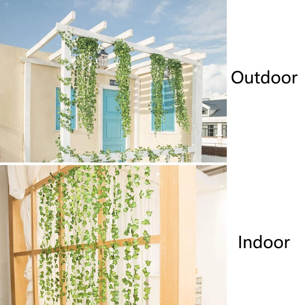 WORTHY BATCH DECORATION APPLICATION : There are totally 84 feet artificial ivy vines、50*green cable ties included in one bag (Each ivy hanging vine approx 7ft long,leaves diameter approx 1.4-1.8inch.comes with 12 Strands artificial ivy vine,plastic vine silk leaves.). Batch application is more cost-effective, such as wedding, garden, and shopping malls. HIGH QUALITY MATERIAL : Artificial ivy garland made of high quality,leaves are made of cloth, stems are made of plastic,very easy to use,tight connection, not easy to fall.featuring wonderful,shapely leaves and green hues, looks lifelike and will add elegance to your landscape. IDEAL DECORATIONS FOR PARTY AND HOME : Artificial ivy is a magic decor. A little placement will immediately break the monotony, spread greenery, and arouse pleasant and peaceful feelings. Moreover, fake ivy can perfectly match anywhere and any theme party by creating a special atmosphere of nature and vitality.You can hang them on the wall, doors, swing, mirrors and anywhere as you like to enjoy with our artificial hanging ivy garland. SUITABLE FOR INDOOR AND OUTDOOR DECORATION : With 50*green cable ties, fake ivy vines can be easily fixed on pillars, fences, walls, and trellis.It can be used both indoor, like bedroom, living room, kitchen, staircase, privacy screen, and outdoor, e.g. balcony, swing stand, and at party such as baby shower. It is also ideal for filling flower boxes, vine garland and windowsills.Other poses including wedding arches, garlands, and hanging plant baskets can also be achieved without worrying about