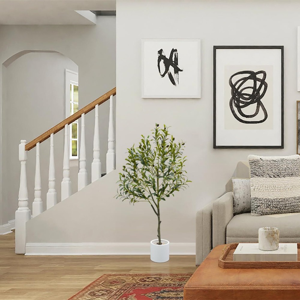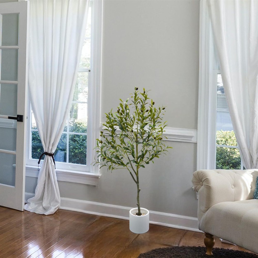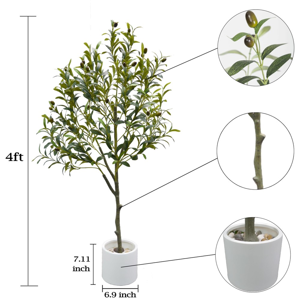 4ft Tall Artificial Olive Tree with Plastic White Pot, it very suitable for decoration with Fake Olive Plant. The trunk texture look like Nearly Natural, and the High Quality Olive Leaves and Fruits make the tree more perfect. There is wire inside the olive branch. When you receive it, you'll need to "fluff out" the branches to achieve its intended appearance. Indoor or Outdoor Decor: This Faux Olive Tree perfect to display in your Home(Living room, Bedroom, Big Entryway, Dining Room, Modern Decoration Indoors and Outdoors, Patio, Small Indoor Garden on Grass), Office or Store. This Artificial Olive Tree no Maintenance or water Needed, Cost Effective and Long Lasting, Non-toxic and No-allergies. Safety packaging: Our Fake Olive Plants are equipped with foam packaging to ensure safe transportation to your home.