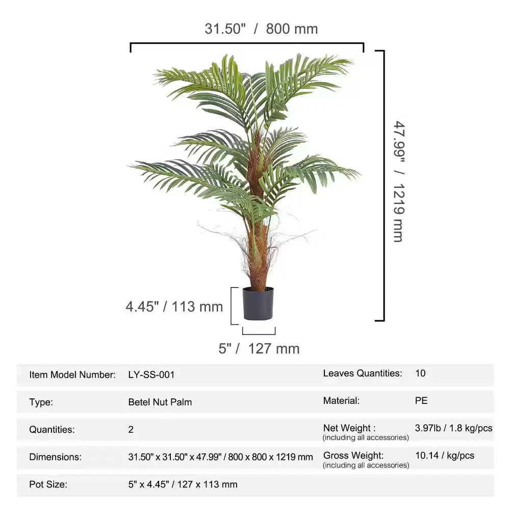 Fast Shipping On All Items 30 Days Money Guarantee Customer Support Excellent Service 100% Satisfaction Satisfaction Guaranteed Artificial Palm Tree 4 Ft. Tall Faux Plant, Artificial Leaves and Moss-Covered Potting Soil Lifelike Fake Tree Specification Color Family Green Container Finish Family Black Container Material Plastic Container Type Pot Indoor/Outdoor Indoor Material Plastic Plant Type Palm Product Weight (lb) 6.17 lb Returnable 90-Day Container Depth (in) 4.45 in Container Height (in) 4.45 in Container Width (in) 5 in Product Height (ft) 3.93 ft Product Height (in) 47.24 in Product Width (in) 31.5 in 31.5 inches x 4.45 inches x 3.93 ft. Weight: 6.17 lb Item Description Lifelike faux plant with moss-covered soil for enhanced look Made of high-quality PE to ensure durable use Measures 47.24 in. H x 31.5 in W X 31.50 in D Premium Artificial Trees - Perfect Greenery for Your Home. Our artificial trees are incredibly lifelike. Choose the perfect size based on your space and preferences - they won’t take up too much room but will bring a lush, natural atmosphere to your living space. Bring 1-home today and elevate your surroundings with vibrant greenery. About us We offer the best prices around on high quality products. Our E-store includes media such as books, movies, music and games while offering electronics, toys, sporting apparel, clothing, tools, general home, garden items and more. Shipping We are always working hard to ensure your package arrives as soon as possible. Please understand that some factors like weather, high postal traffic, and the performance of shipping companies are outside of our control. We offer free shipping to the lower 48 states and ship within 2-3 business days of payment, usually sooner. We do not accept P.O. Boxes. Please provide a physical address. For shipping outside of the continental USA, we only use eBay's Global Shipping Program.The item is shipped to KY and then sent to the rest of the world. International customers are responsible for all duties and taxes. Continue to check out to calculate costs for shipping the item to your country. Messages regarding eBay's Global Shipping Program MUST be directed at eBay EXCLUSIVELY. Returns We offer a 30-Day Return Policy on items in which you are not completely satisfied with. You have the option of a full-refund or an exchange of the item. No returns are available on items shipped outside of the USA Satisfaction We try over very best to make sure every customer is completely satisfied. If there's a problem, message us! We're happy to help. Payment Options Shop With Confidence