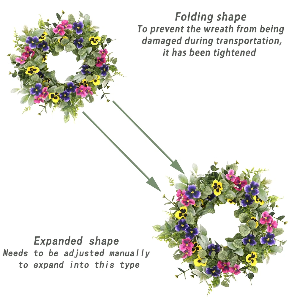 Artificial Spring Summer Wreath with Pansy Flowers,Flocked Lamb Ear Leaves,Eucalyptus Leaves,Fern Branches for Front Door Indoor Outdoor Farmhouse Wall Holiday Decor, White Gift Box Included High-quality Material: This artificial Spring Summer wreath is made of silk which can be used all year round Unique Design: This Spring front door wreath is decorated with a full circle of Flocked Lamb Ear Leaves,Pansy Flowers,eucalyptus leaves,fern branches, creates a romantic look that makes for a wonderful style for spring door decoration. Elegant and vivid colors make for timeless seasonal home decor Perfect Size: The outer diameter is about 20", the inner diameter is about 10", perfect size for indoor and outdoor decoration Easy Maintenance: Highly realistic handmade artificial wreath makes it durable and requires no special maintenance. Just wipe it with a wet tissue or towel to keep it neat Multi-occasions: The wreath can be used indoor or outdoor, place it on your front door, or hang it above your fireplace. It's also perfect for decorating weddings, birthdays, stages, bedrooms, offices, dining rooms, and others SHIPPING Domestic Buyers - We have confidence in our products, but if you are not fully satisfied please contact us within 30 days of purchase and you will get full refund. - We ship within 3 business days of payment, usually sooner - We offer FREE shipping on all orders! - We only ship to the lower 48 states, no APO/FPO addresses or PO Boxes allowed International buyers – please note: Import duties, taxes, and charges aren't included in the item price or postage cost. These charges are the buyer's responsibility. - Please check with your country's customs office to determine what these additional costs will be prior to bidding or buying. * Order Cancellation Policy ** You can return a product for up to 30 days from the date you purchased it. 1. The seller reserves the right to cancel the special case only due to eBay cancellation fee. 2. The decision of seller is the final. 3. The seller will respond to the cancellation request within 2 business days. Please wait for the result of cancellation. 4. In case the cancellation is not completed by some reasons, the buyer can follow the options below to get the refund. 4.1 The buyer can reject the item when it arrives. 4.2 The buyer can send the item back to the seller within 30 days If the buyer receives item (USA Shipment ONLY). The seller will provide the FREE return label to the buyer when the buyer opens " Return Item" case on eBay by using the reason as "Change my mind" ONLY. 5. When buyer has placed the order. The order will be processed and completed by automatic warehouse system within 5 minutes. In case that buyer sends the cancellation request after 5 minutes of placing the order, the request will be rejected. **Sending direct message to cancel the order is not allowed for every case.* Return Policy For the return case - If buyer would like to return the items for refund or replacement, please CONTACT SELLER to receive the free return label from seller. The refund or replacement will be processed with the tracking number of return label which is provided by seller only. The other ways of return which are not approved by seller will not be processed for the refund or replacement.