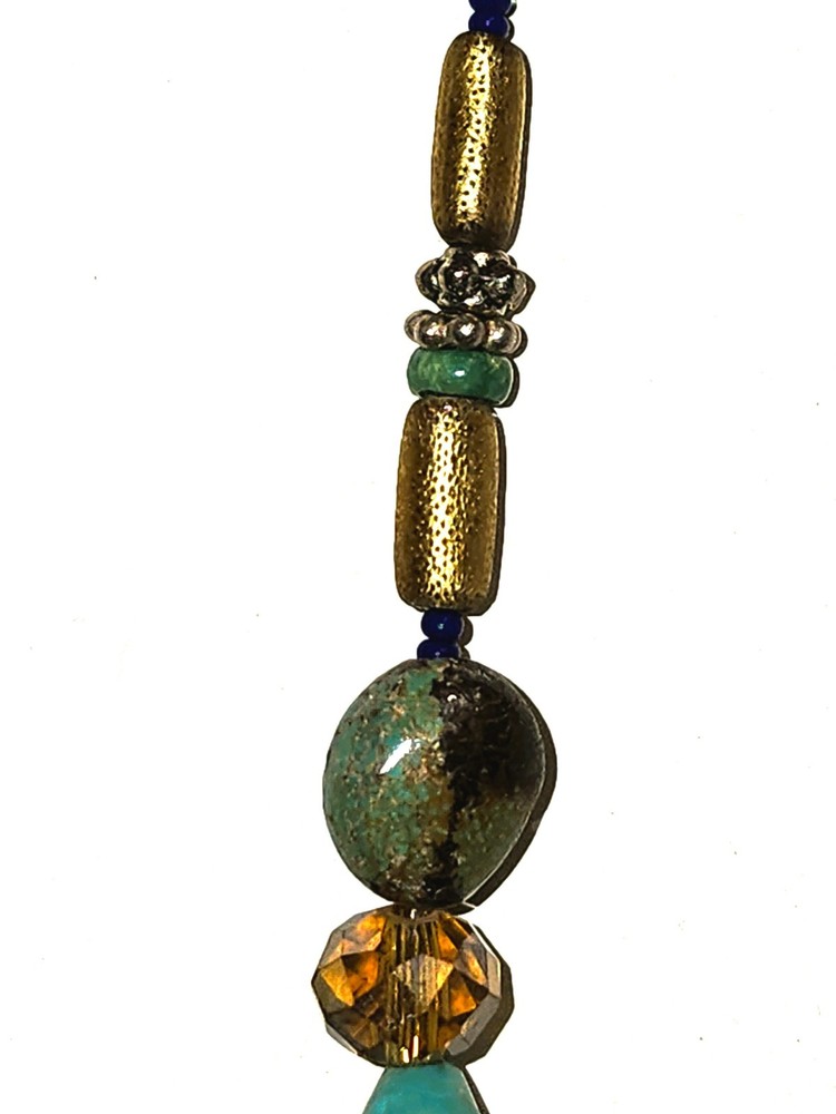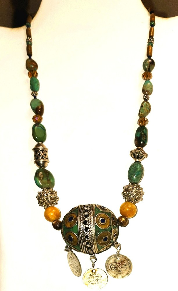 This artisan-made necklace of enameled Berber beads with genuinely vintage, handmade silver beads with turquoise and yellow jade features a unique combination of colors chosen to match the center bead. The asymmetry of the sides is owed to the unique nature of the silver beads. The necklace is inches in length, showcases intricate craftsmanship and a vibrant multicolor design. With its antique appeal and handmade quality, this piece is a standout addition to any jewelry collection, perfect for those who appreciate original and artisanal pieces. Typically, Ground Advantage is used.