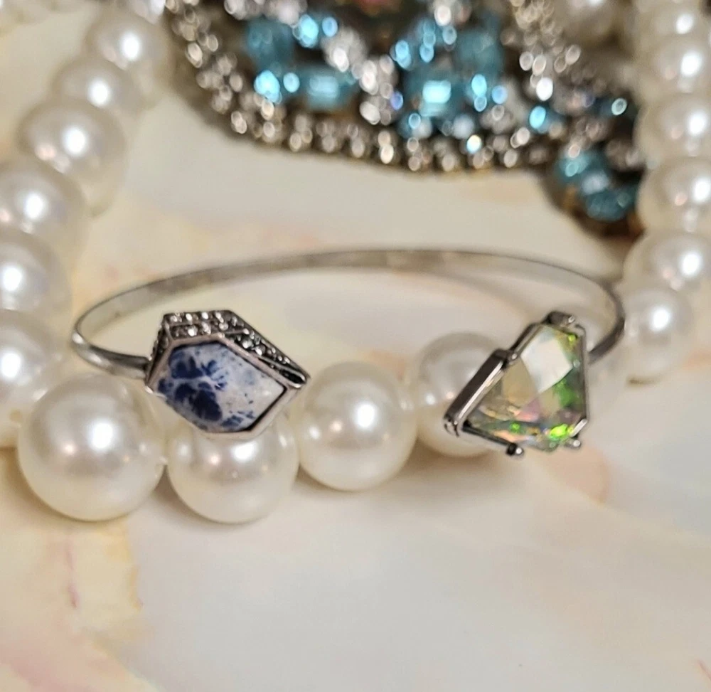 Elevate your style with this stunning Artisan bracelet, perfect for any nature-inspired outfit. The silver bangle is adorned with a beautiful blue Lapis stone and shimmering Aurora Borealis crystals, adding a touch of elegance to your look. Handmade with natural stones, this bracelet is a unique piece that will make a statement in any collection. The Artisan brand is known for their high-quality jewelry, and this bracelet is no exception. Whether you're dressing up for a special occasion or adding a touch of sophistication to your everyday look, this bracelet is the perfect accessory. This vintage-inspired cuff flaunts a slim silvertone band that is capped on either side by Lapis & sparkling crystal accent stones for glamorous allure. Simple yet elegant! 3" W Silvertone/crystal