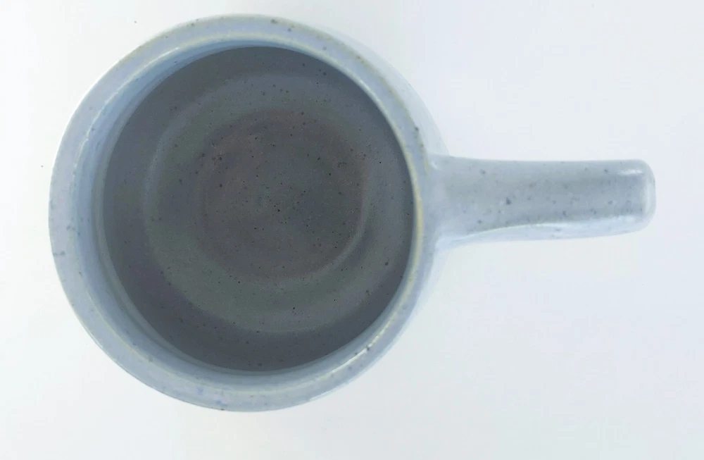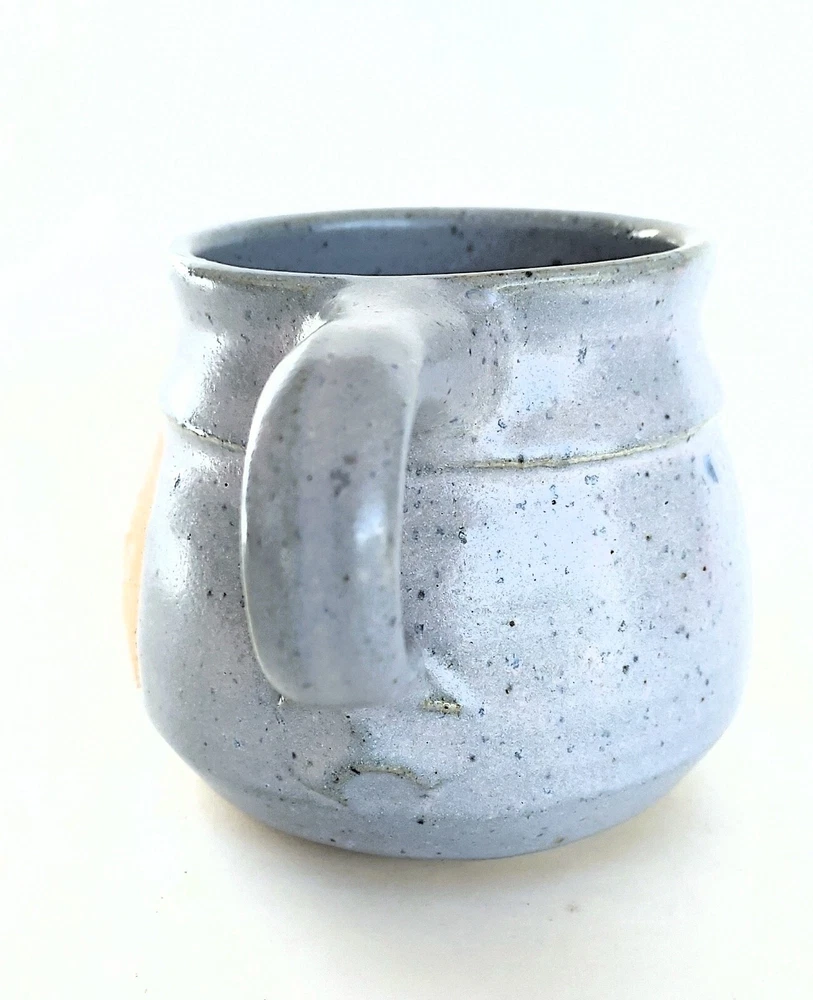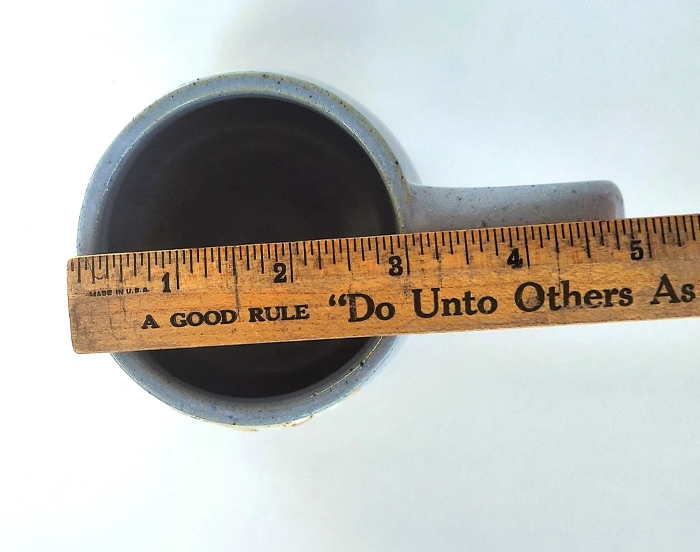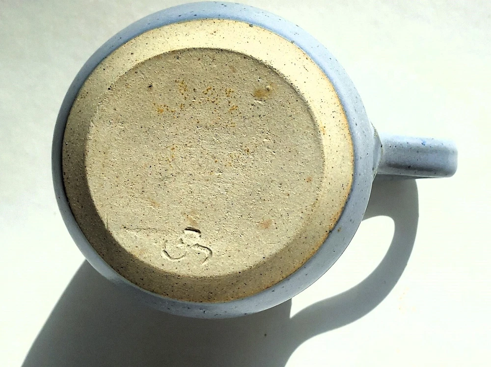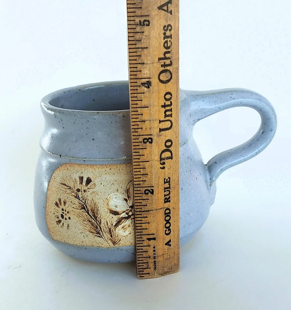 Artist signed rustic pottery mug. Periwinkle blue with imprint of leaves and flowers. Pre-owned - Very good condition. No chips, scratches, or stains. See photo as added description. Aprox. 3.5 inches tall x 3 inches in diameter. 5 inches across with handle.