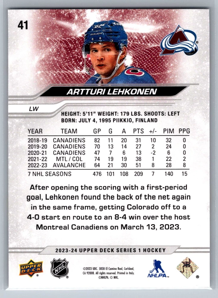 Season: 2023 Graded: No Team: Colorado Avalanche Player/Athlete: Artturi Lehkonen League: NHL Sport: HOCKEY Manufacturer: Upper Deck Set: 2023-24 Upper Deck Year Manufactured: 2023 Type: Sports Trading Card Autographed: No Card Number: 41