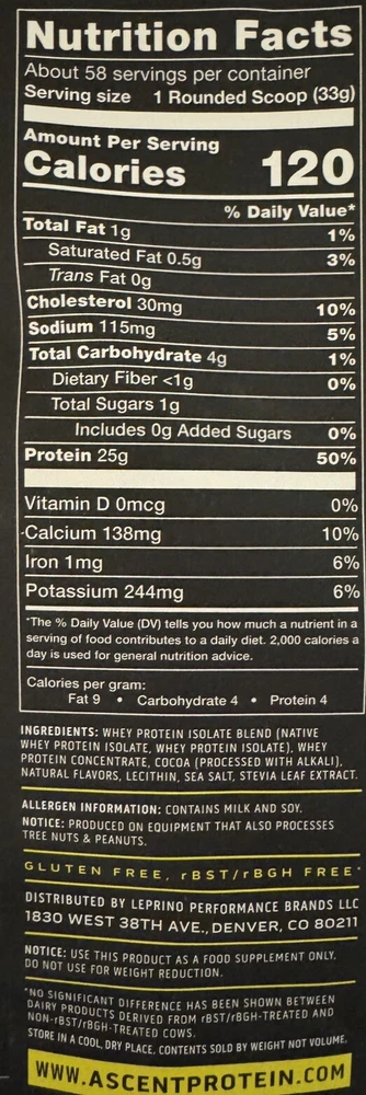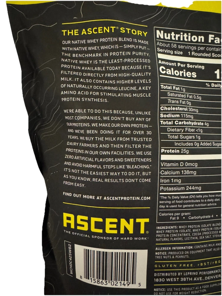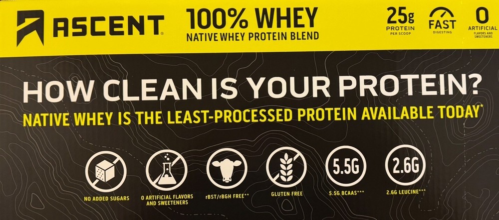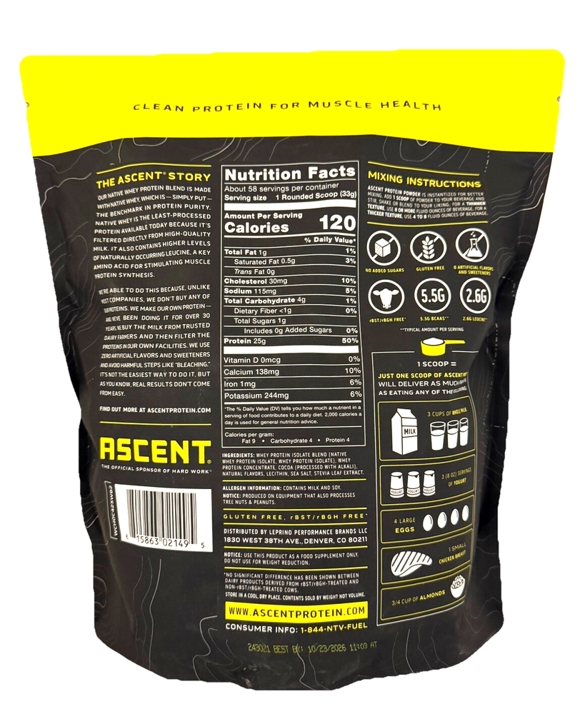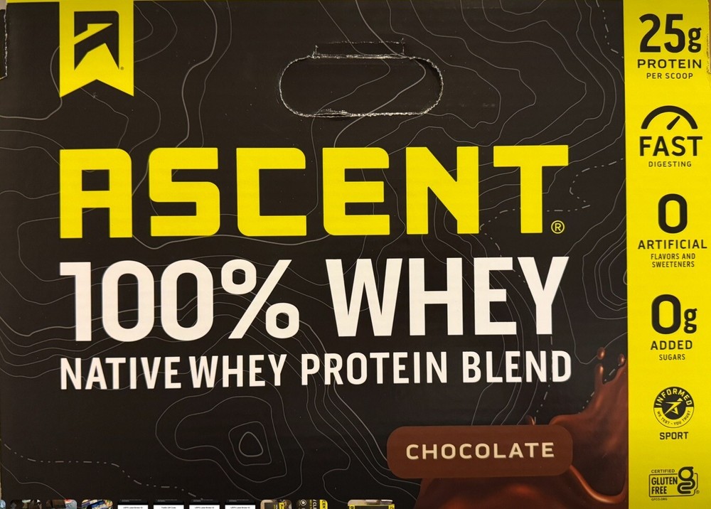 π« Ascent 100% Whey Protein Blend - Native Whey β Chocolate β 4.25 LBS β Clean, Post-Workout Recovery π¦ Whatβs Included: βοΈ 4.25 LBS (68 oz) of Ascent 100% Whey Protein Blend β Chocolate Flavor βοΈ 58 Servings per container βοΈ 25g of Protein per scoop βοΈ Fast-Digesting & Gluten-Free βοΈ Zero Artificial Flavors & Sweeteners π Why Choose Ascent Whey Protein? πͺ Premium Protein for Muscle Recovery β With 25g of protein per scoop, Ascent delivers the same amount of protein as 3 cups of whole milk, 3 servings of yogurt, 4 large eggs, or a small chicken breast. π₯ Clean & Pure β Made with Native Whey, the least processed whey protein available today, ensuring high purity and fast digestion. 𧬠Naturally Occurring Nutrients β Contains higher levels of naturally occurring leucine, a key amino acid that stimulates muscle protein synthesis. π± No Artificial Ingredients β No added sugars, artificial flavors, or sweeteners, making it a clean, guilt-free post-workout recovery shake. πΊπΈ Proudly Made in the USA β Ascent is committed to providing premium, clean products made in the USA. π§π€π§ Official Sponsor of Hard Work β Ascent Whey Protein is the official sponsor of athletes who push their limits every day. π« Flavor Profile: Indulge in the rich, creamy chocolate flavor that makes your post-workout shake a treat, not a chore! π Expiration Date: October 2026 β Fresh & ready to fuel your workouts for months to come! π§΄ Nutritional Highlights (Per Serving - 1 Scoop): 25g of Protein 5.5g of BCAAs 2.6g of Leucine 120 Calories Gluten-Free No Artificial Sweeteners or Flavors π₯ Perfect For: Post-Workout Recovery β Replenish your muscles after a hard workout with fast-digesting protein that your body craves. Daily Protein Boost β A convenient way to add clean protein to your daily diet, whether you're bodybuilding, gaining muscle, or maintaining lean muscle mass. Snack Substitute β A satisfying, nutritious snack that will keep you feeling full and energized. π Product Details: Brand: Ascent Product: 100% Whey Protein Blend (Native Whey) Flavor: Chocolate Weight: 4.25 LBS (68 oz) Servings: 58 Total Servings (1 Scoop = 25g Protein) Ingredients: Native Whey Protein, Cocoa, Natural Flavors Features: Gluten-Free, No Added Sugars, No Artificial Sweeteners Country of Origin: United States Expiration Date: 10/23/2026 π Why Buy from Us? π Fast & Secure Shipping β We ensure your product arrives safely and quickly. β Top-Notch Customer Service β Reach out anytime with questions or concerns. Weβre here to help! π¬ Love your Ascent Whey Protein? Leave a βββββ positive review to share your experience!