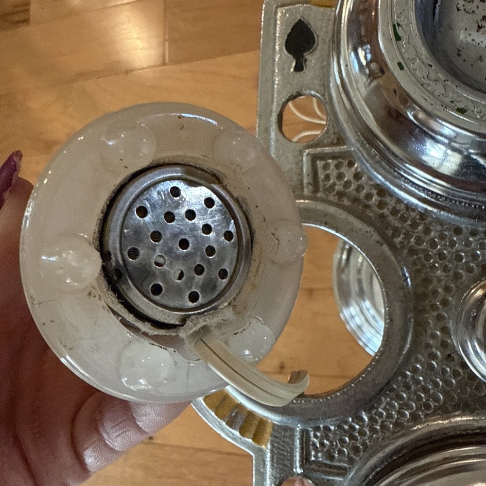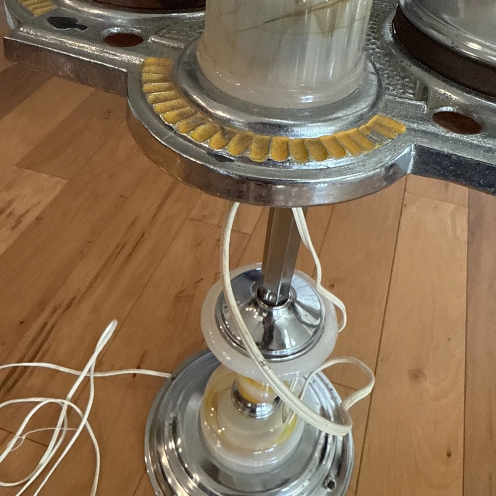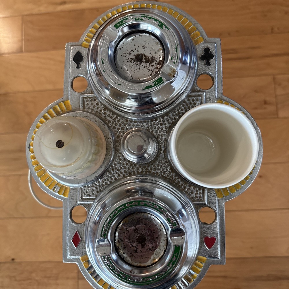 The lighter and light work. This product is a vintage 1920's Art Deco ash tray and lighter table cigarette holder floor lamp. It is a unique and elegant piece that combines functionality with artistic design from the early 20th century. Perfect for collectors of tobacciana items or those interested in vintage decor, this piece adds a touch of nostalgia and sophistication to any space.