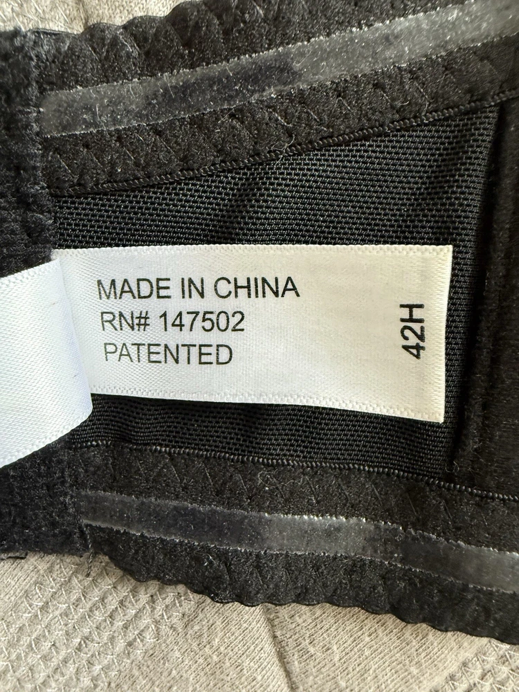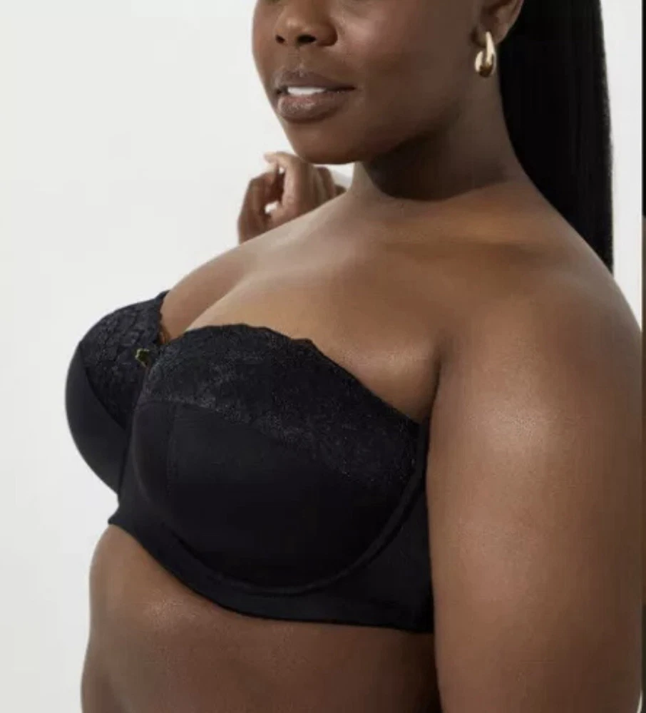This Ashley Stewart strapless bra features a beautiful floral pattern in black color. The bra is designed with wireless support, padded cups, and a hook & eye closure. It is available in size 42H and is part of the Lane Bryant Cacique product line. This modern bra is perfect for any woman looking for comfortable and stylish support. No straps are included.