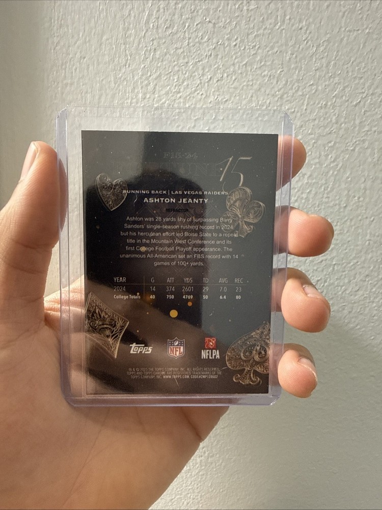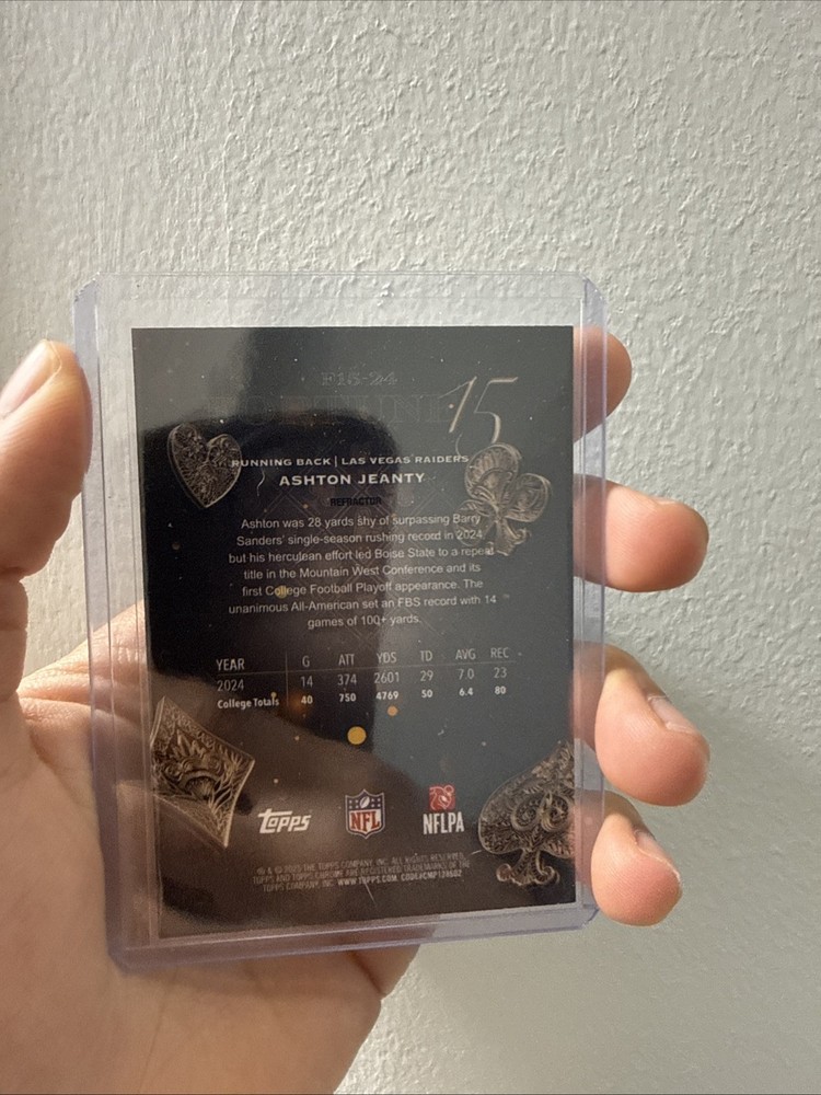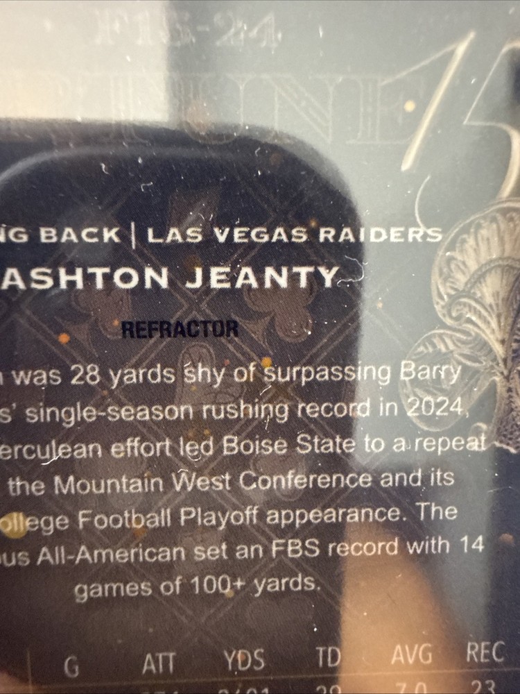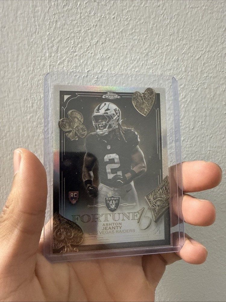 The product is a 2025 NFL Topps Chrome Fortune 15 Refractor Rookie Card featuring Ashton Jeanty, a football player in the National Football League (NFL). Manufactured by Topps, this sports trading card is part of a Chrome series, known for its shiny and reflective design. As a rookie card, it holds value for collectors and fans looking to add to their collection of NFL trading cards. This card would be a sought-after item for those interested in football memorabilia.