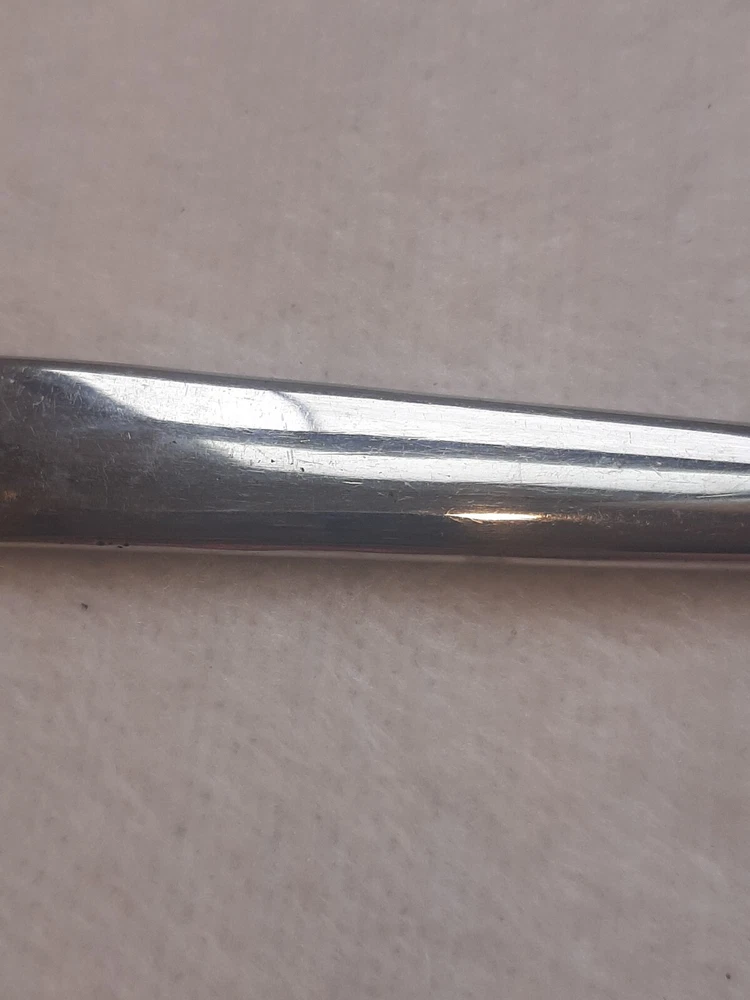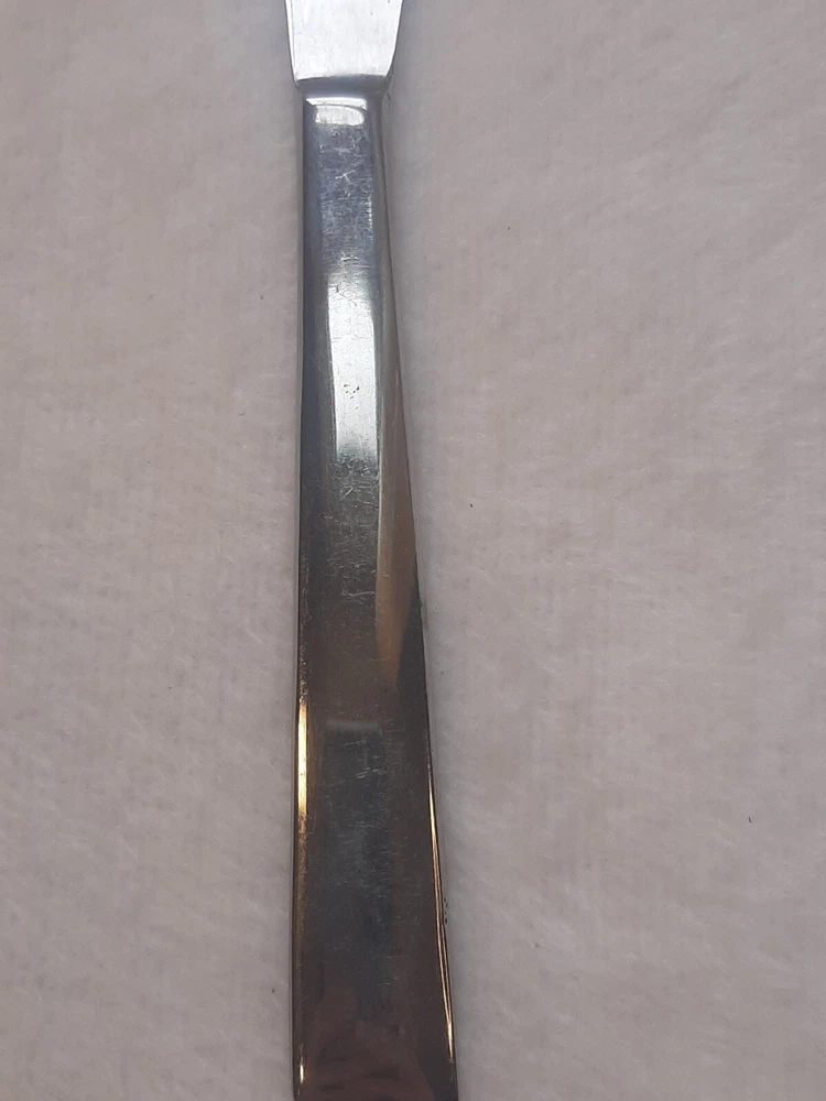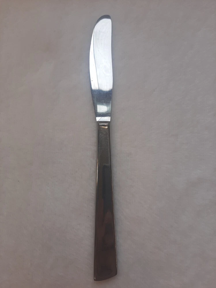 Ashton Stainless Steel Unknown Pattern Angled Tip Dinner Knife Flatware In good pre-owned condition may show signs of wear from use/handling/storage/display. Please view all pics for condition/details/flaws/issues. SOLD AS IS There is/maybe marks/spots/dirt/debris/rust please see photos 1-12, there is/maybe paint loss/sticker loss please see photos 1-12, there is lite discoloration please see photos 1-12, there are surface scratches to item please see photos 1-12, please see all photos for condition/issues/details.