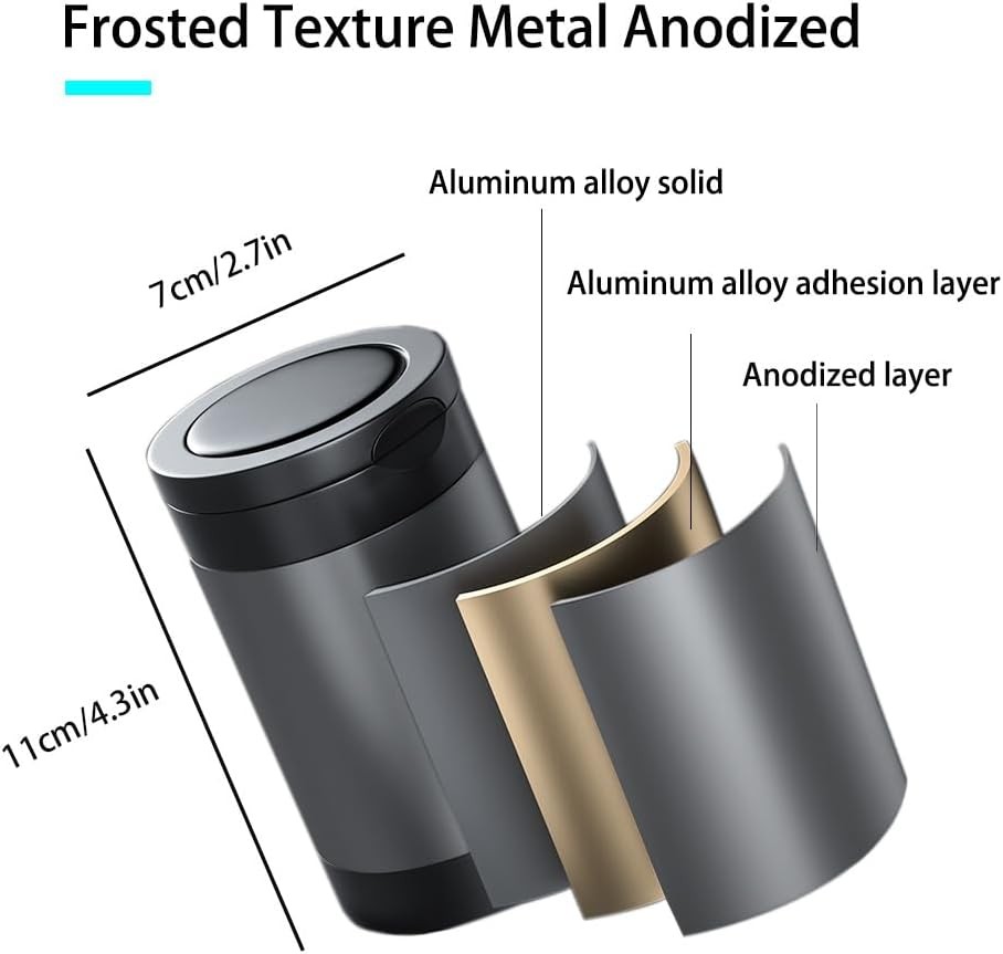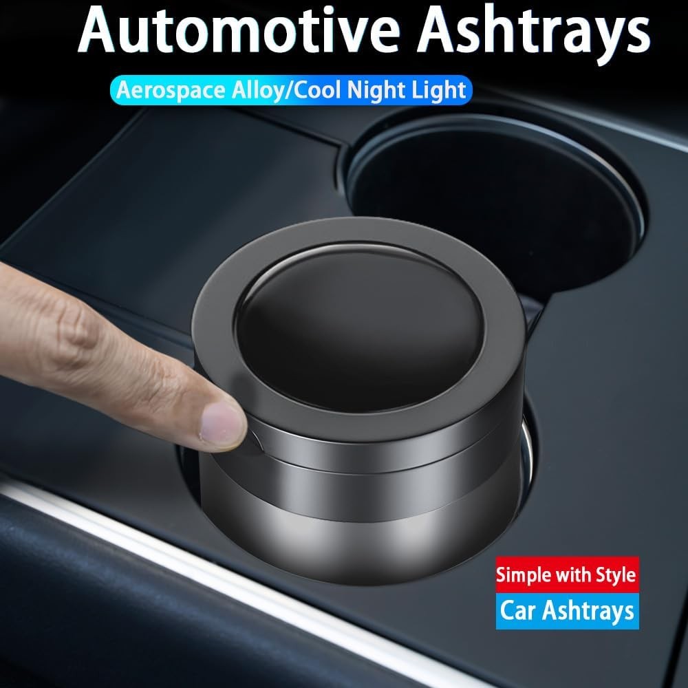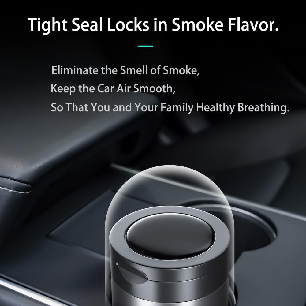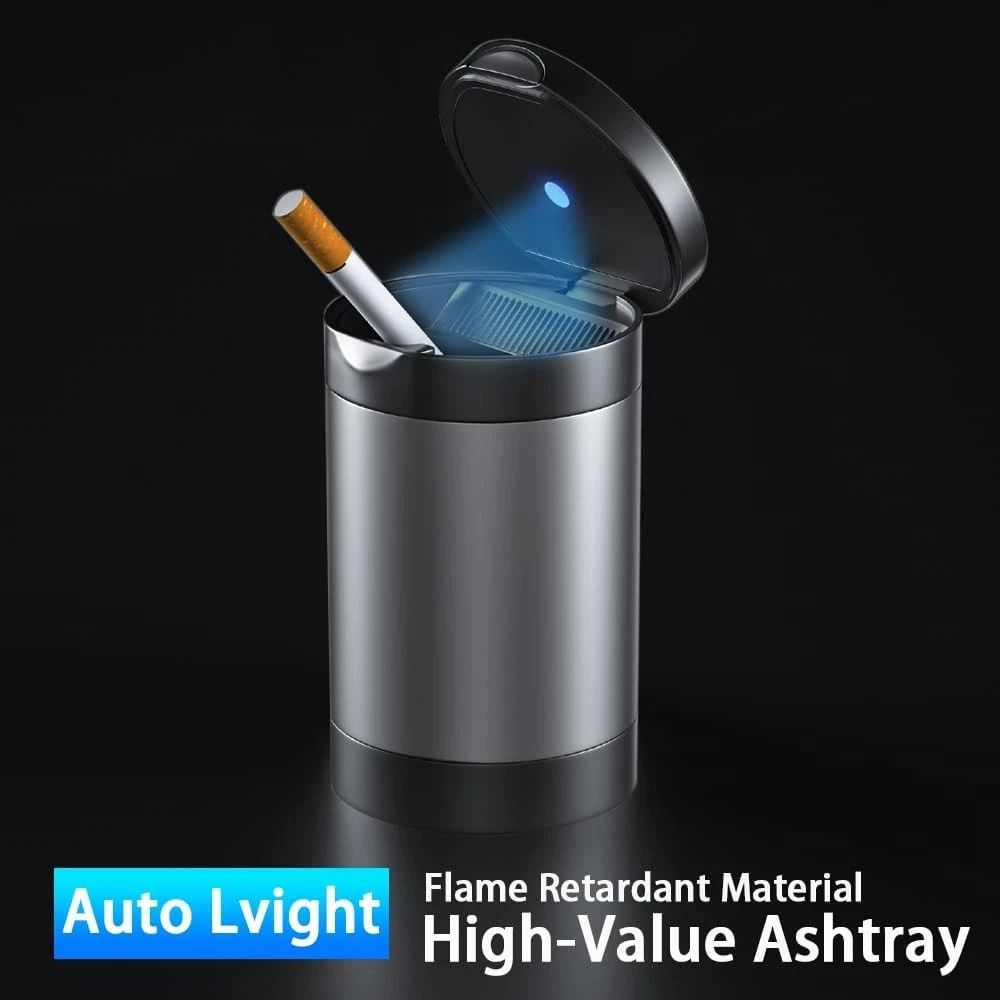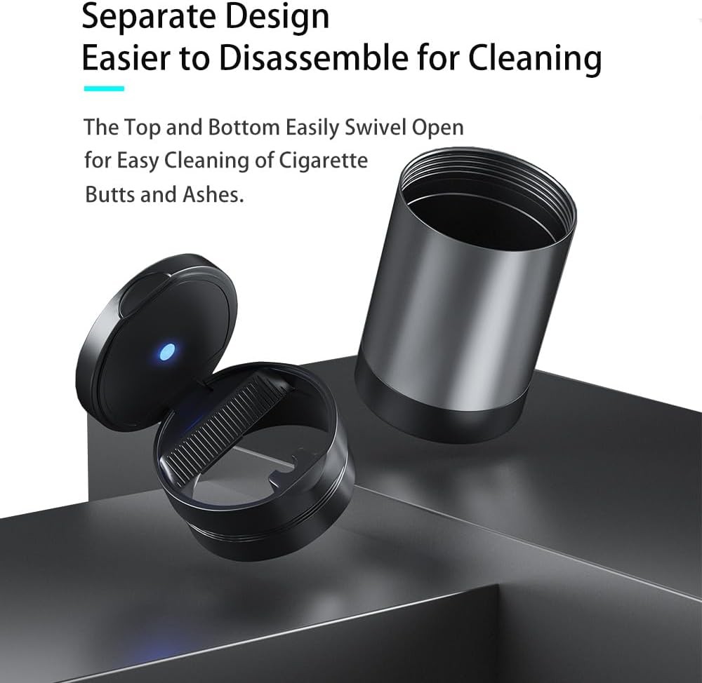 About this item Large Capacity: With Package Dimensions of 2.75"L x 2.75"W x 4.33"H, this ash tray for cars offers ample space, not only for ash but also as a mini car trash can for small waste like crumbs, fruit peels, tissues, etc. Automatic LED Light: The smokeless ashtray features a blue LED light that automatically turns on when the lid is opened, ensuring visibility in low light or dark environments. Durable Materials: The ashtray for car is made of high-quality stainless steel and fire-resistant materials, leaving no burn marks. It is both aesthetically pleasing and durable. Easy to Clean: The top and bottom of the portable ashtray can be easily detached, allowing you to thoroughly clean it after each use. User-Friendly Design: This car ashtray for cup holders features a wide extinguishing platform for quick cigarette extinguishing with a tap, a clip to secure the cigarette, and a lid that reduces oxygen to help the cigarette go out faster. Package Dimensions: 2.75"L x 2.75"W x 4.33"H