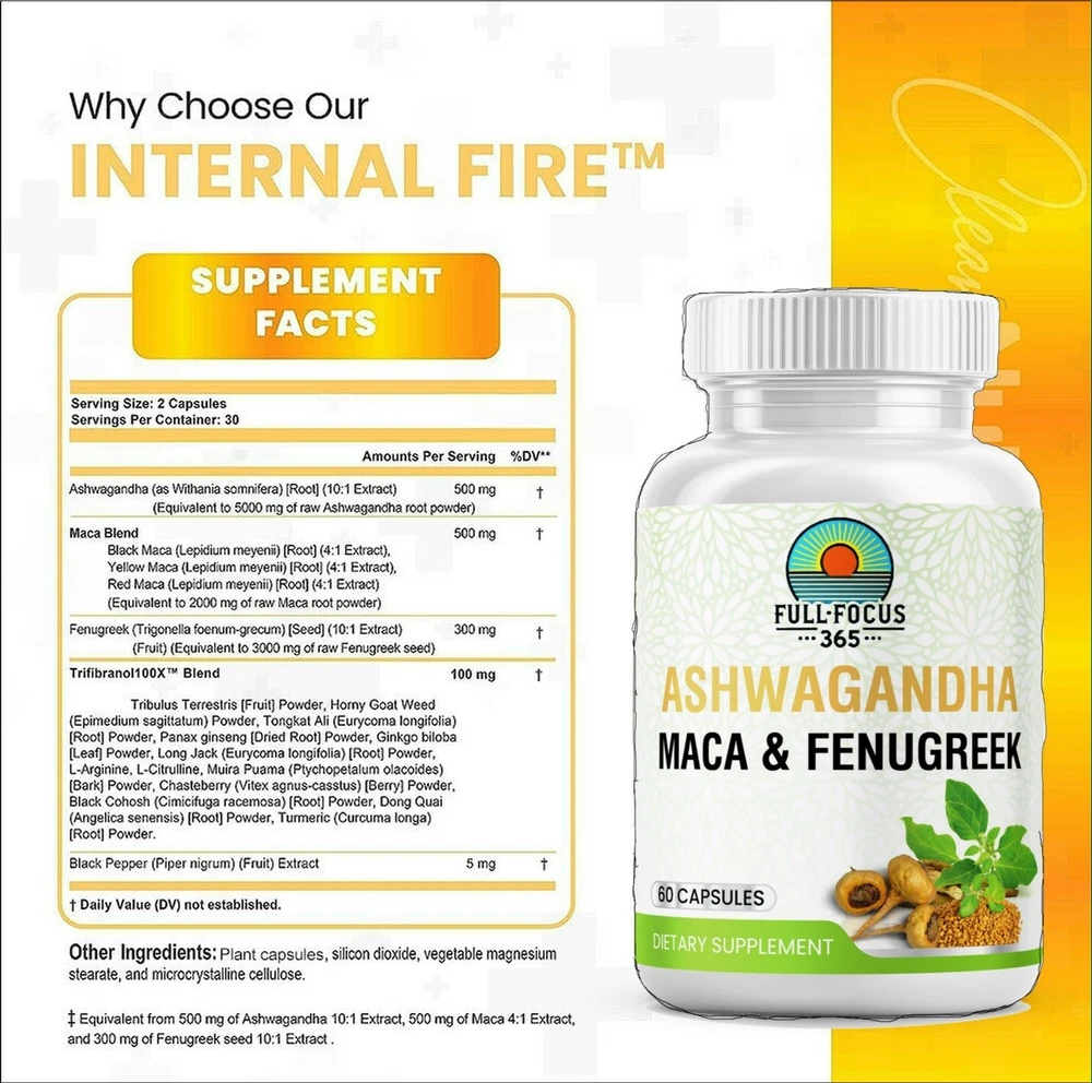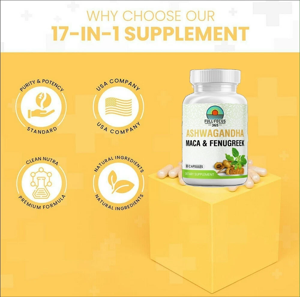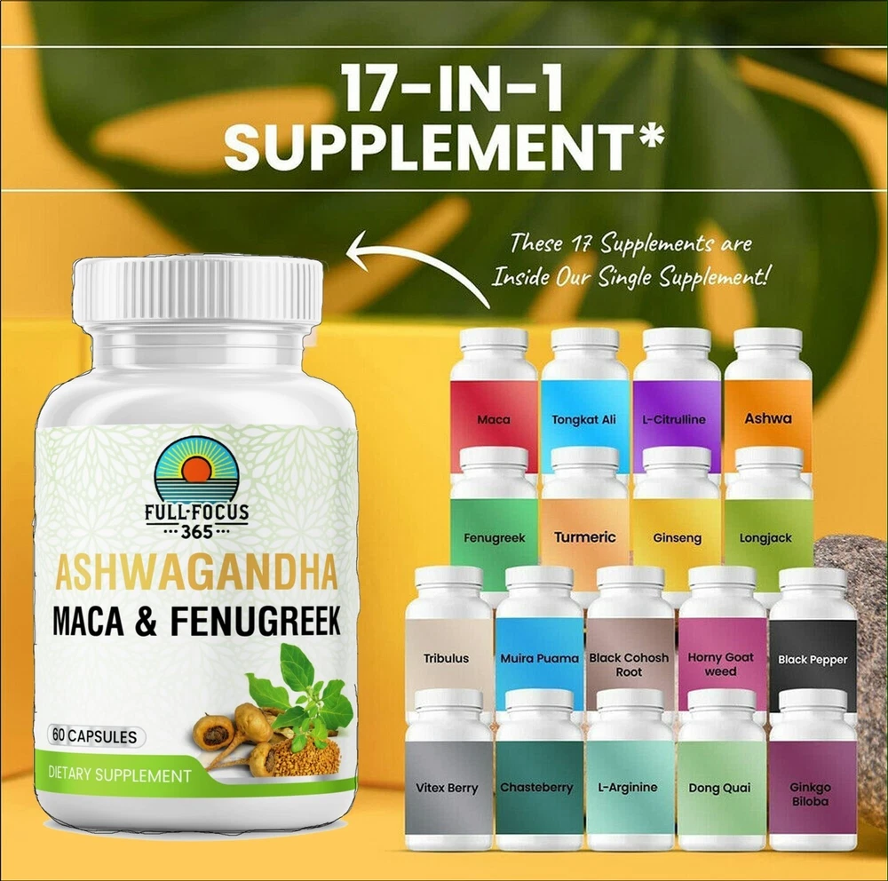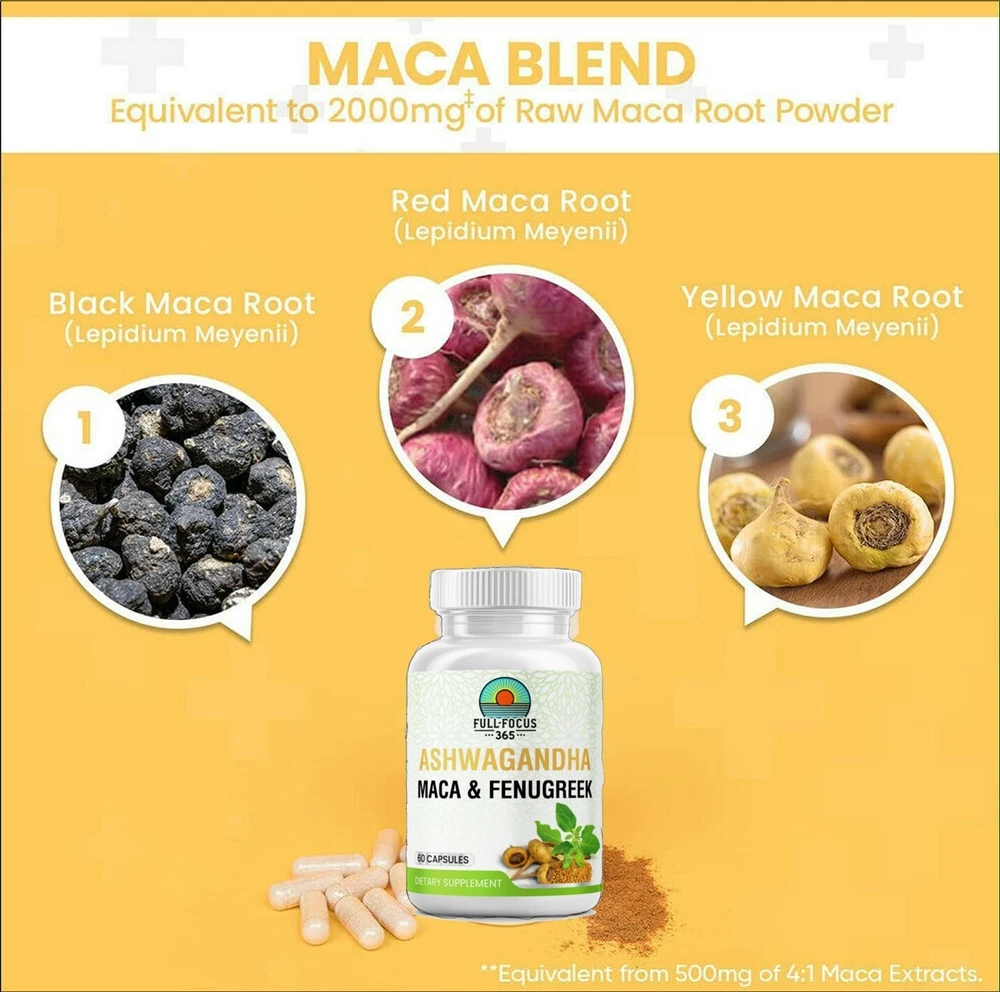 The average person carries between 5 and 20 pounds of waste in their intestines at all times. Regular bowel movements and emptying of the colon are highly recommended to reduce the risk of abdominal pain, bloating, constipation and increased intestinal permeability.SUPER FORMULA: Use our herbal supplement with 5000 mg of Ashwagandha, 2000 mg of Maca Root Extract, 3000 mg of Fenugreek Extract, and more. This complex is carefully formulated to unleash your vitality. ENERGY AND PERFORMANCE BOOST: Rediscover your energy and vitality with our powerful botanical supplements. Highly concentrated ashwagandha and maca root extract powders work synergistically for optimal hormonal balance and mental acuity. This duo is packed with many essential vitamins and nutrients to help you achieve peak physical performance and endurance to push your limits. NATURAL MOOD SUPPORT, SMILE MORE: Unleash your inner peace, improve your mood, and maintain calm through life's many storms with our natural mood support supplements. How to take: See accompanying bottle label recommendations Storage: After opening, please seal and store in a cool place away from direct sunlight. Notice: Please read the portable label carefully. The production date is on the bottle cap or label.