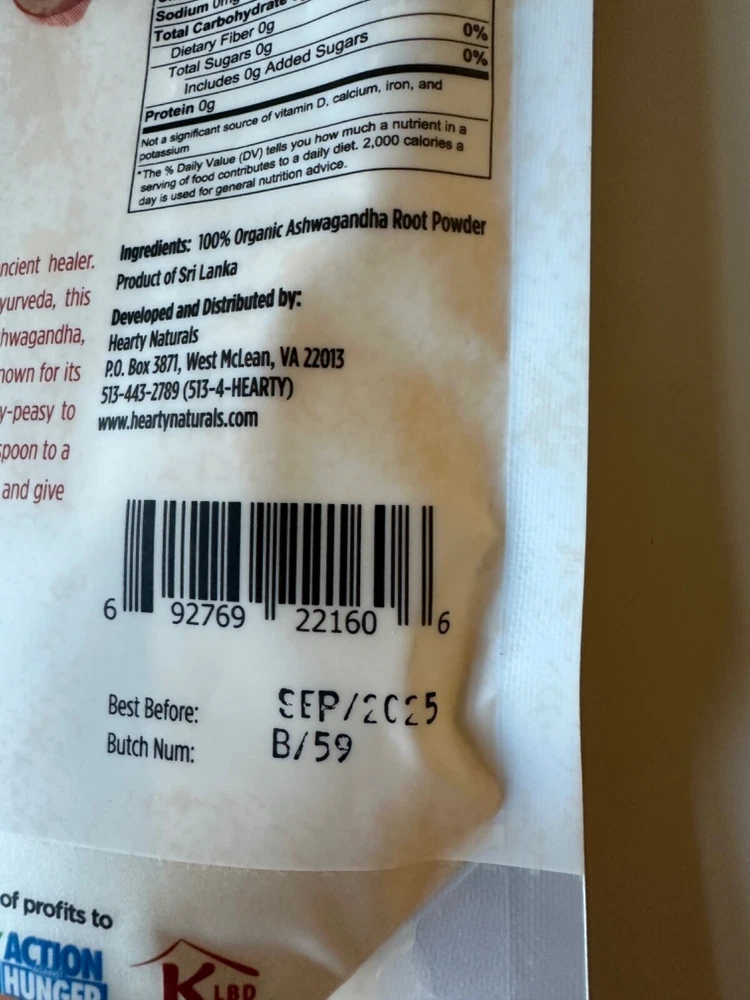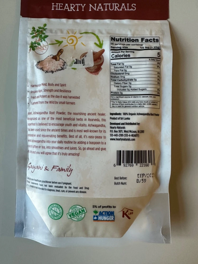 Number of Pills:does not applyCustom Bundle:NoServing Size:0.5 tbspDepartment:UnisexFood Specifications:OrganicUPC:692769221606Active Ingredients:Ashwagandha PowderVolume:4 ozgtin13:692769221606Number of Servings:90Type of Diet:Ayurvedic, Kosher, Non-Vegetarian, Pescatarian, Vegan, VegetarianCalories per Serving:5Type:Green Food/SuperfoodWhen to Take:After Meal, Afternoon, Before Meal, Morning, NightFlavor:AshwagandhaMPN:does not applyMain Purpose:Adrenal Support, Energy Support, General Wellness, Immune Support, Stress ManagementExpiration Date:02/2025Features:OrganicBrand:Hearty NaturalsFormulation:PowderItem Weight:4 ozIngredients:Ashwagandha