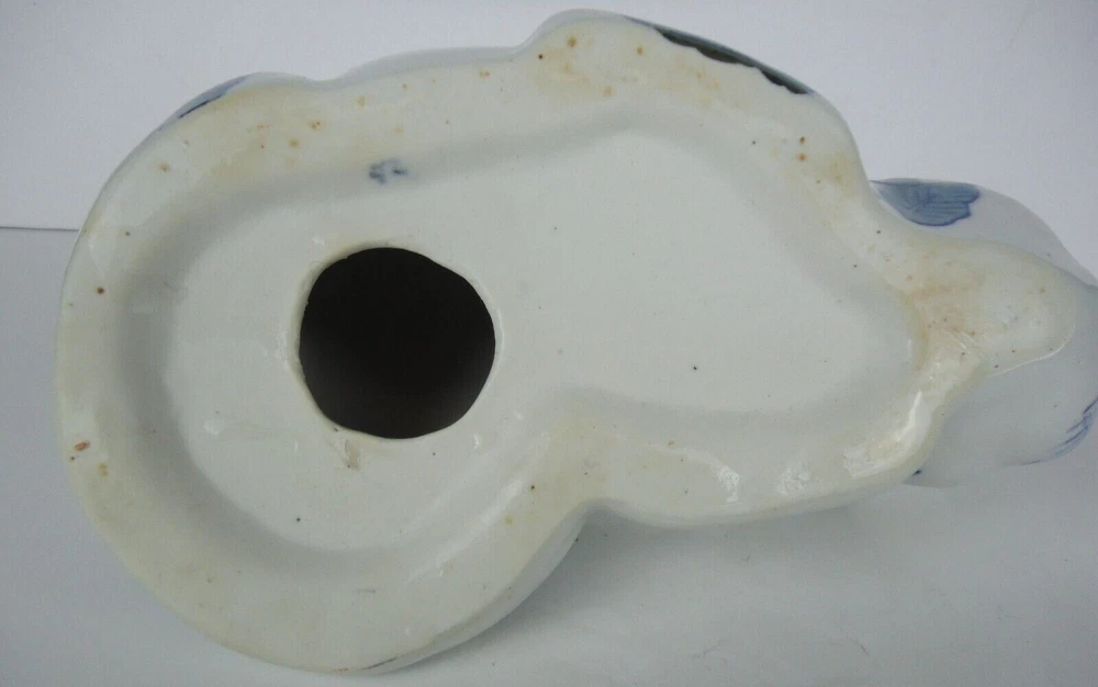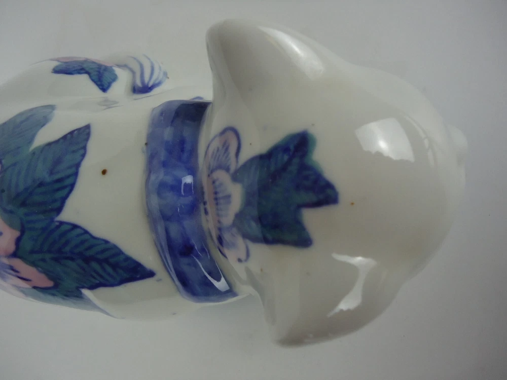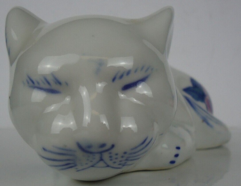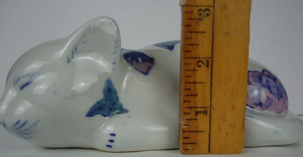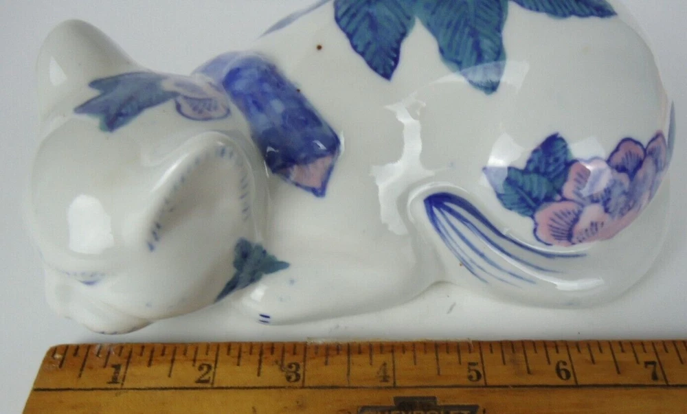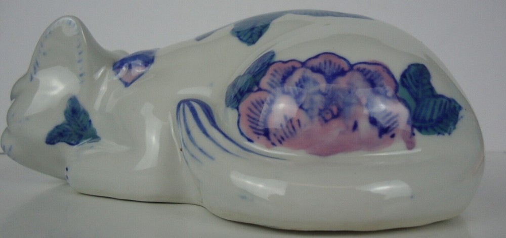Asian Ceramic Sleeping Cat Statue 8x4 Inch Hand-Painted Floral Decor