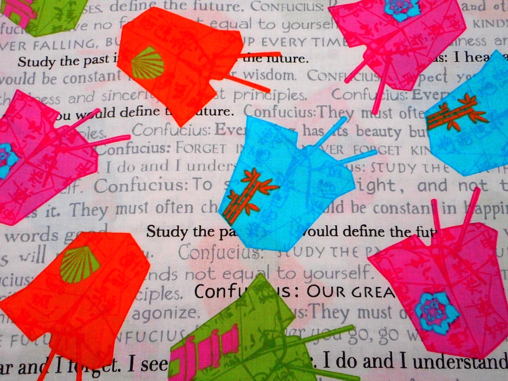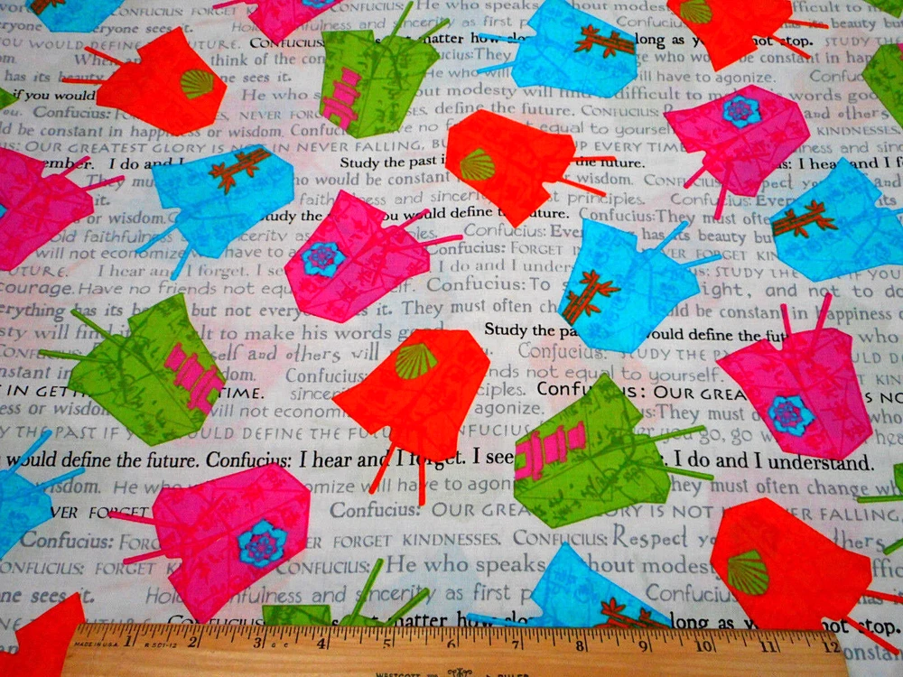 This is a very nice fabric that is 100% cotton. This is a premium quilting cotton by Timeless Treasures. It has Oriental food boxes & chopsticks in bright pink, turquoise, orange & green with words from Confucius in gray & black on a white background. READ: Because computer monitors show colors and shades differently, the fabric colors can vary from the photos. If you have any questions regarding this, please contact me before purchasing the item. I have been a quilter for 30 years and am an accomplished seamstress and would be happy to answer any question you might have. This is for 1 Yard of fabric. If you purchase more than 1 Yard, I will give you one continuous cut. If you have a problem with anything you purchase from me, please contact me before leaving neutral or negative feedback and I will work it out with you. Payment is due within 48 hours. Payments that aren't receive within 5 days automatically go to Ebay's resolution center for non-payment. INSTRUCTIONS FOR COMBINED SHIPPING: I do combine shipping. If you want to do this, put all your items into your shopping cart and request an invoice by using the request total option BEFORE completing the payment process, or I won't be able to combine your shipping. Payment is due upon receipt of your invoice. Thank you for looking and God bless you and your family. IF THERE IS A PROBLEM WITH ANY PURCHASE, PLEASE CONTACT ME, THE SELLER, VIA EBAY'S MESSAGING SYSTEM PRIOR TO OPENING A CASE--OPENING A CASE, EVEN IF RESOLVED SMOOTHLY, CAN HURT THE SELLER'S RATINGS. THANK YOU