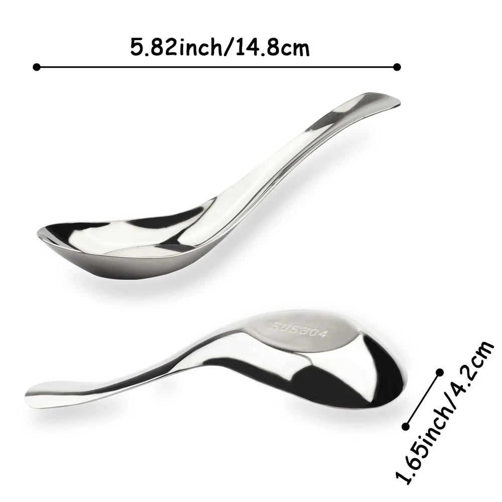 You will receive 6 pieces of soup spoons Perfect Size: measuring about 5.82 x 1.65 inches/ 14.8 x 4.2 cm, approx. 0.4 mm in thickness,perfect for family meals or dinner parties. Premium Quality: These chinese soup spoons made of high-quality thicken stainless steel,durable and resistant to rust and corrosion. Comfortable Grip The ergonomically-designed handle ensures a comfortable and firm grip, comfortable for you to pick and hold These wide spoon head is especially for ladling soup or ravioli, wontons dumpling and other large soup food. Of course, it also suitable for dips,desserts,cereal,stews,chicken/udon noodle,shrimp ramen and more. Perfect Size:you will receive 6 pieces of soup spoons, measuring about 5.82 x 1.65 inches/ 14.8 x 4.2 cm, approx. 0.4 mm in thickness,perfect for family meals or dinner parties. Premium Quality: These chinese soup spoons made of high-quality thicken stainless steel,durable and resistant to rust and corrosion,ensuring they last for years to come. Comfortable Grip: The ergonomically-designed handle ensures a comfortable and firm grip, comfortable for you to pick and hold, without scratching your hands.These wide spoon head is especially for ladling soup or ravioli, wontons dumpling and other large soup food. Of course, it also suitable for dips,desserts,cereal,stews,chicken/udon noodle,shrimp ramen and more. Easy to Clean: Smooth&polished surface of these soup spoons makes them easy to clean and maintain, also easy for you to clean with water or dishwasher,which can serve you for year.These kitchen spoons are stackable and easy to clean without bad smells or lingering odors after washing. Wide Applications: you can apply the Asian soup spoons for formal occasions, such as dinner banquets, festivals, weddings, parties, celebrations, family gatherings, restaurants and more, matching with your tableware, also nice gifts for sending to others.