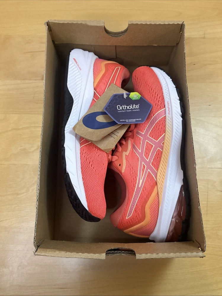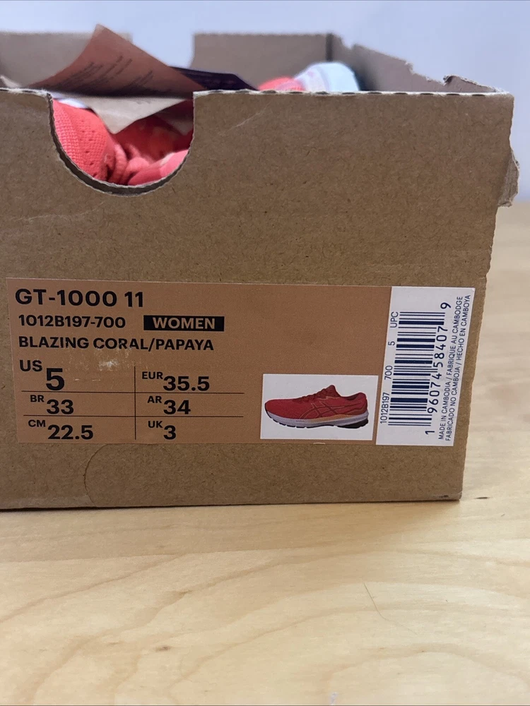 Brand new Asics GT-1000 11 running sneaker in the Blazing Coral / Papaya - women’s size 5 Damaged box - missing lid Ships promptly and securely