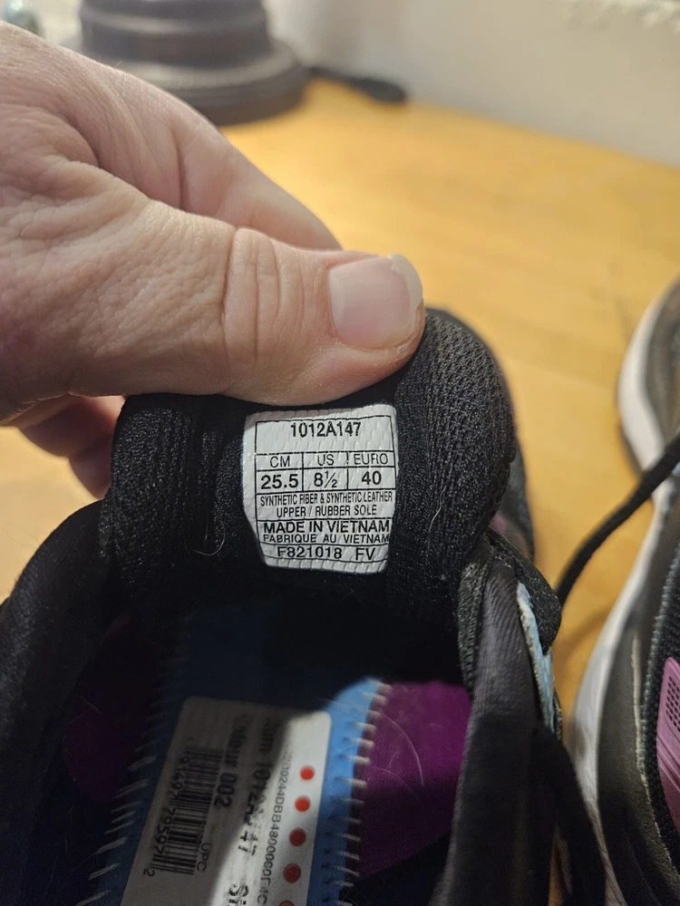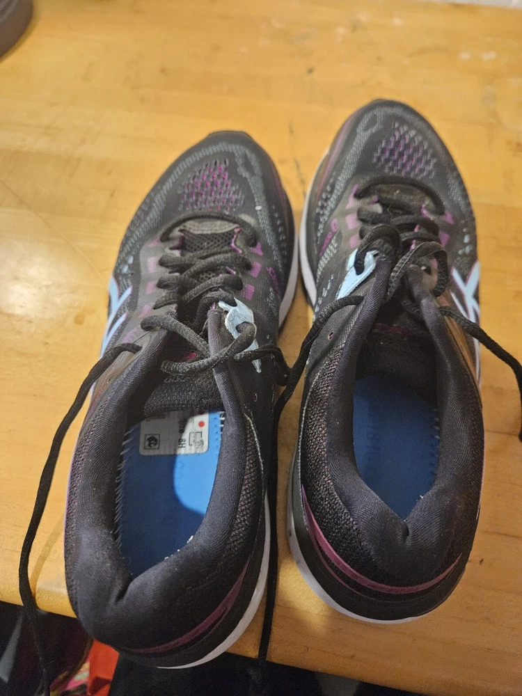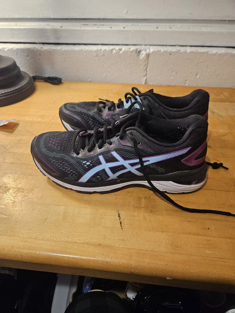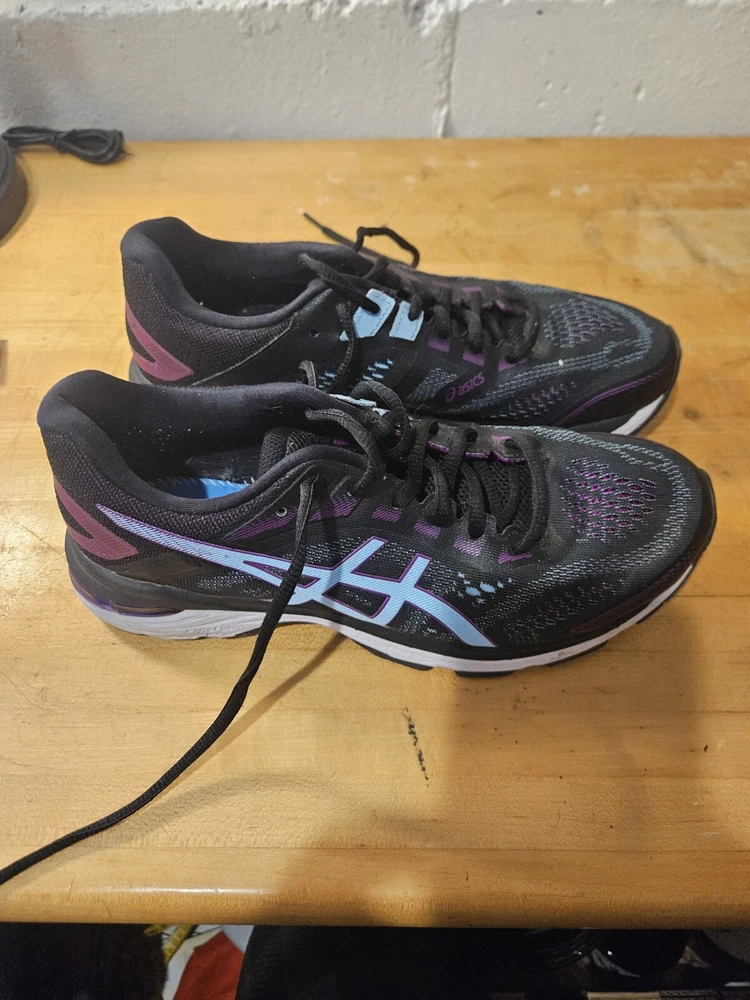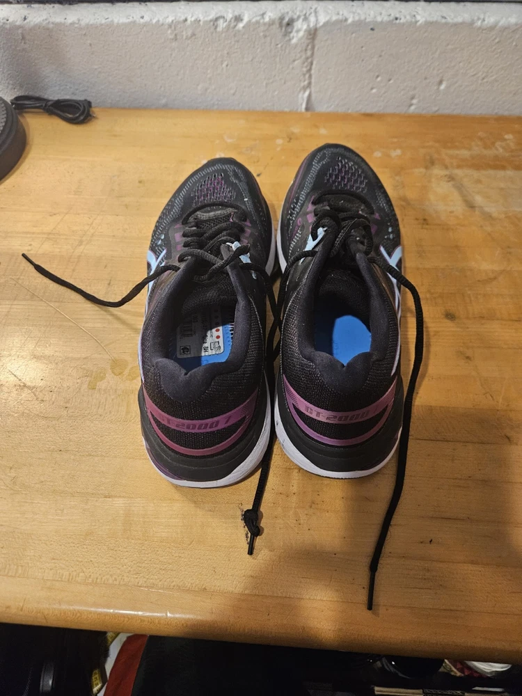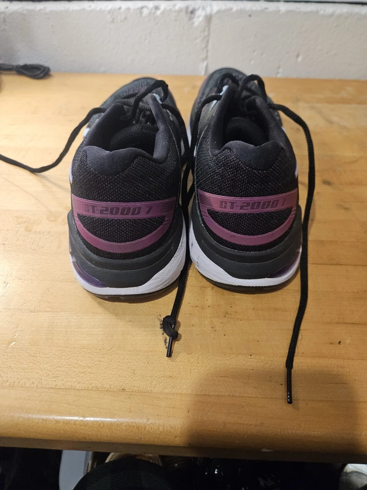 The Asics GT-2000 7 Women's Shoes are size 8.5 in a stylish black and purple color combination. These athletic sneakers feature a lace-up closure and low-top shoe shaft style, designed with mesh fabric for breathability. With arch support, cushioning, and a comfortable fit, they are suitable for various activities like running, jogging, hiking, and gym training. The rubber outsole provides durability, making them ideal for outdoor and indoor workouts. Perfect for both casual wear and active pursuits, these Asics sneakers blend performance and style seamlessly.