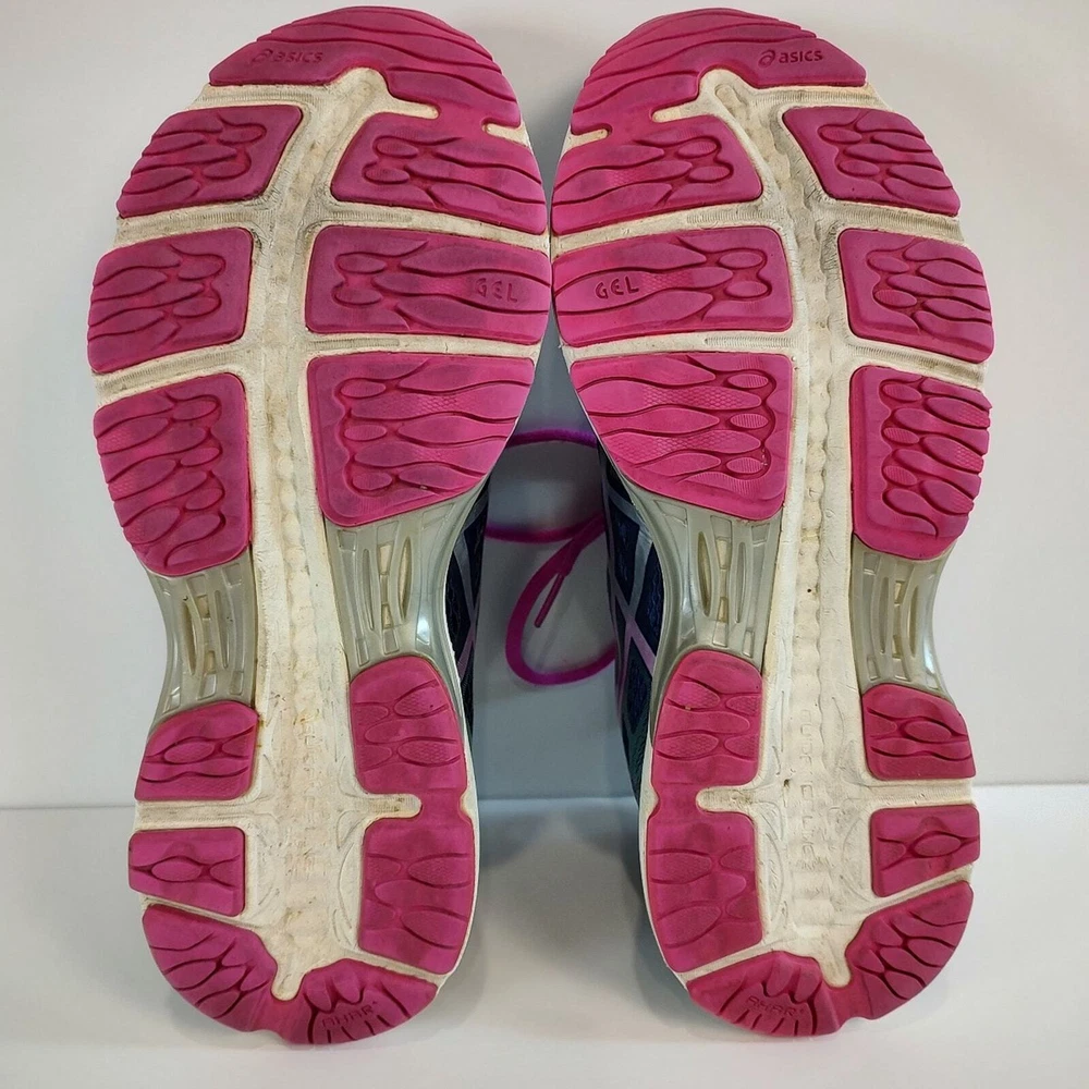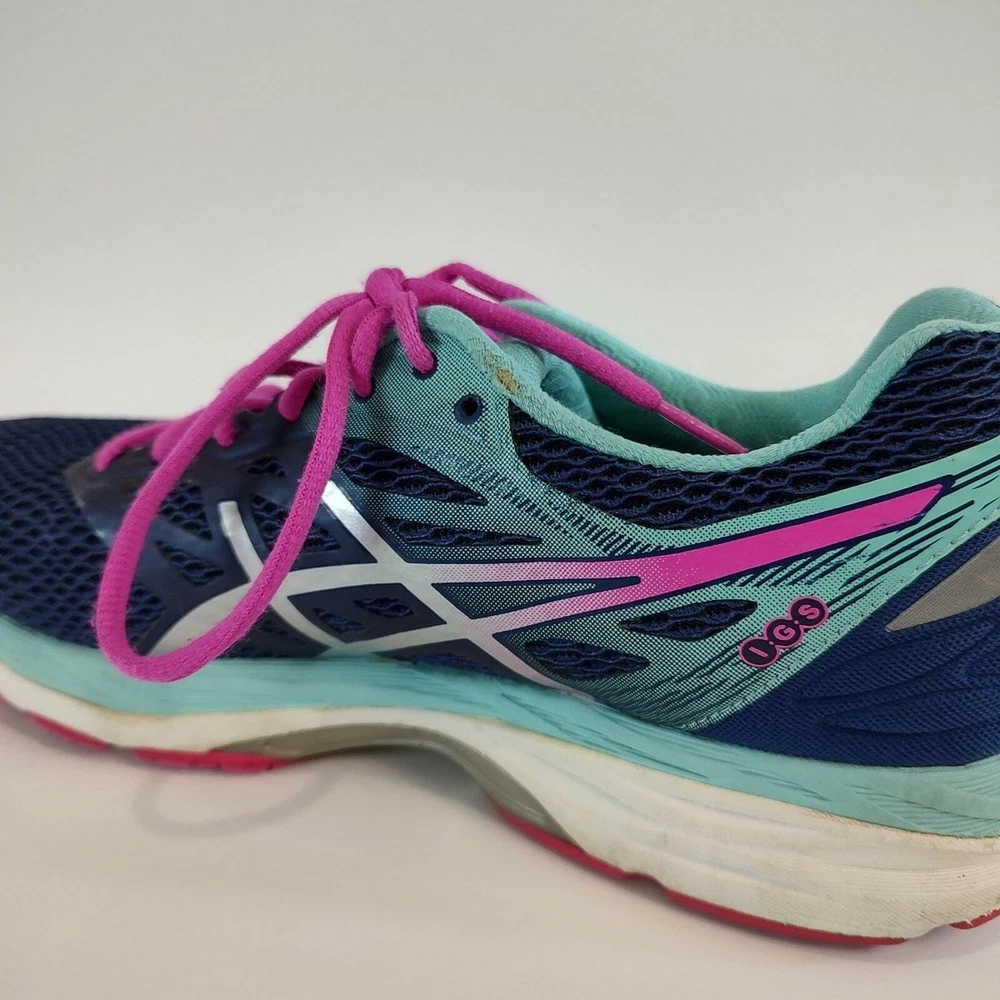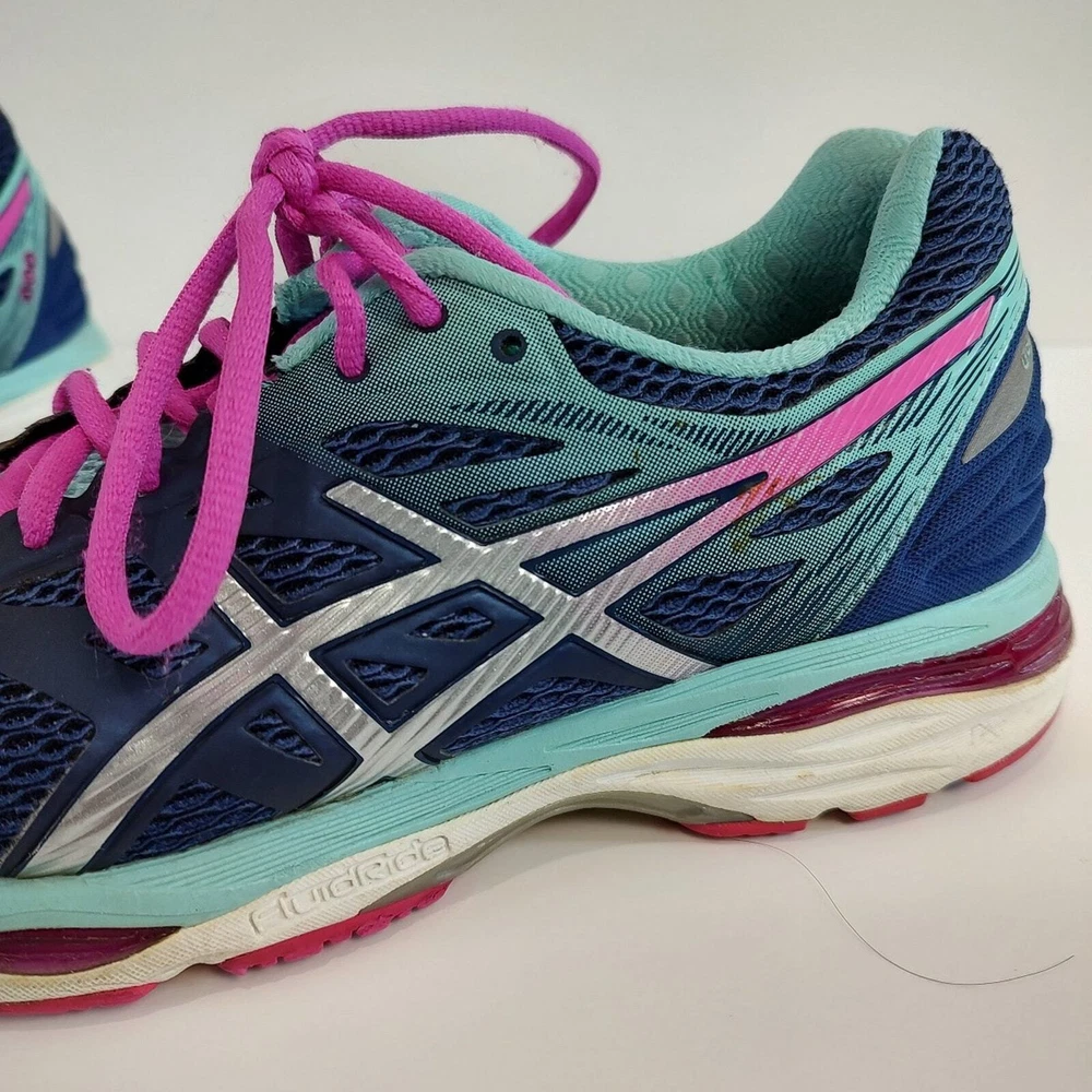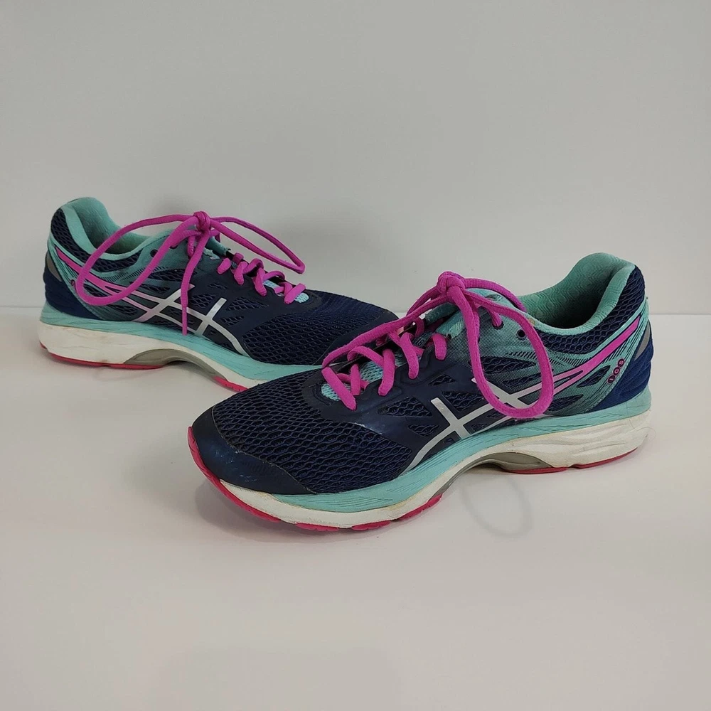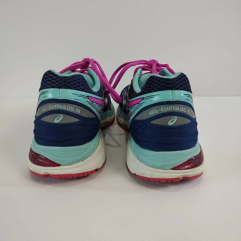 Asics Gel-Cumulus 18 - blue and pink Asics running shoes, women's size 9. They're in great condition, no holes, has small stain on the logo of left shoe (see pictures). Theyve been thoroughly cleaned before listing Please reference photos before purchasing