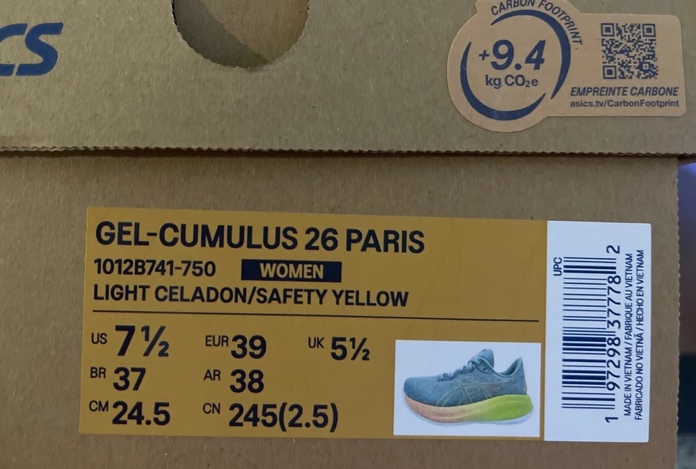 UPC: Does not apply Theme: Sports, Colorful, Athleisure Accents: Lace Country/Region of Manufacture: Vietnam Customized: No Type: Athletic Occasion: Activewear, Workwear Style: Sneaker gtin13: Does not apply Upper Material: Mesh US Shoe Size: 7.5 Model: Asics Gel Cumulus 26 Season: Summer, Spring, Fall Closure: Lace Up Color: Green, Yellow And Blue Brand: ASICS Department: Unisex Adults Performance/Activity: Running & Jogging, Walking, Cross Training, Baseball, Basketball, Gym & Training, Racing Features: Comfort, Breathable, Cushioned, Performance Style Code: F920524 Vintage: No