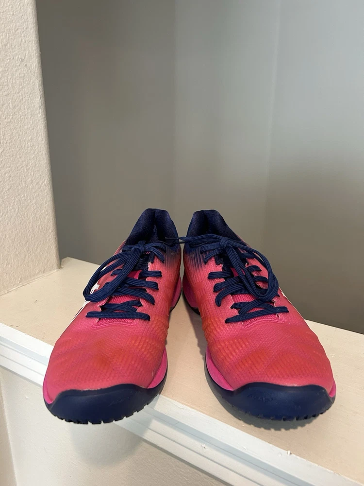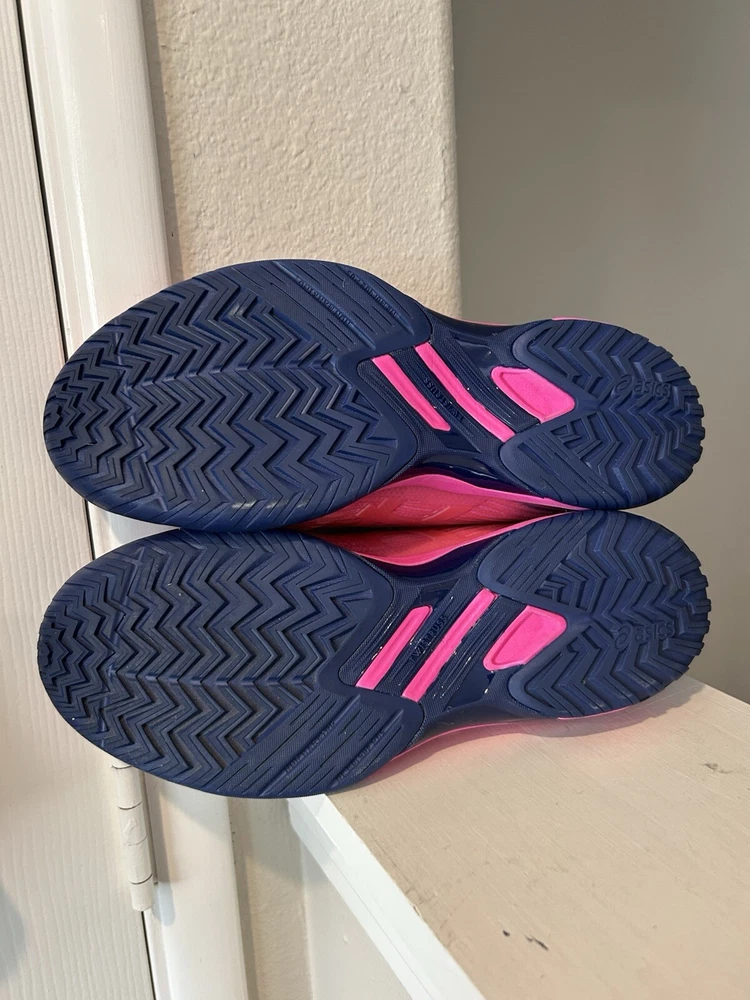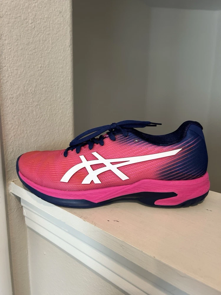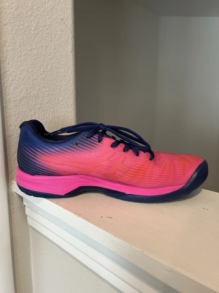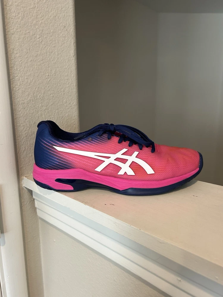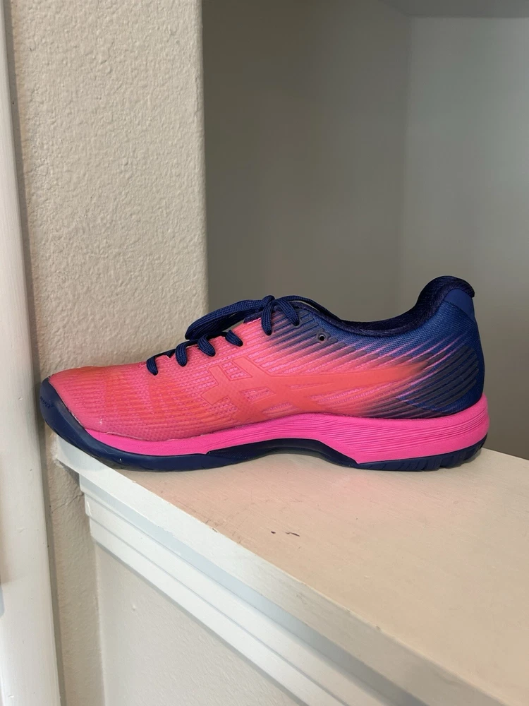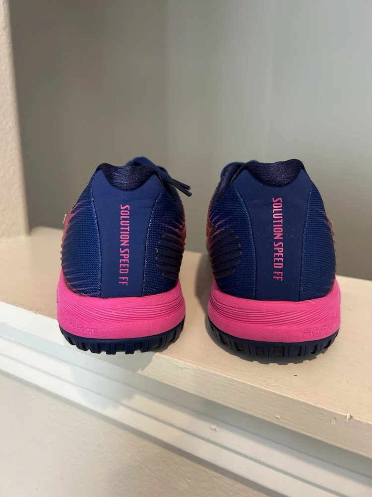 The product is a women's ASICS Solution Speed FF sneaker in pink color with purple accents. It is in US size 8.5 and EU size 40. The style code is 1042A002.